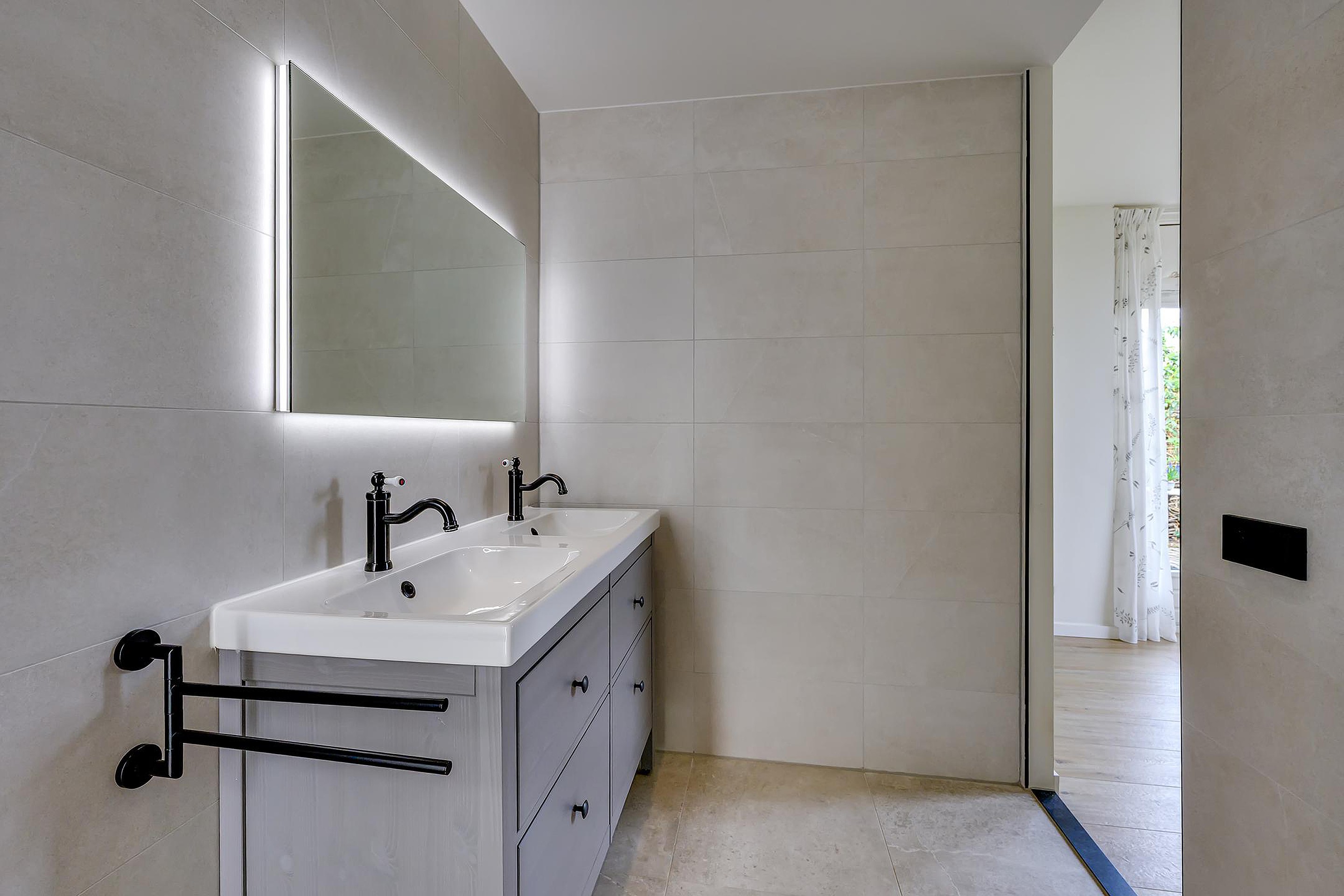 Uniek aan deze woning is de slaapkamer op de begane grond, ideaal als je levensloopbestendig wilt wonen. Direct daarnaast ligt de badkamer, wat het geheel extra comfortabel maakt. De badkamer is recent gerenoveerd met een mooie inloopdouche en een dubbel wastafelmeubel en heeft een strakke en moderne uitstraling.