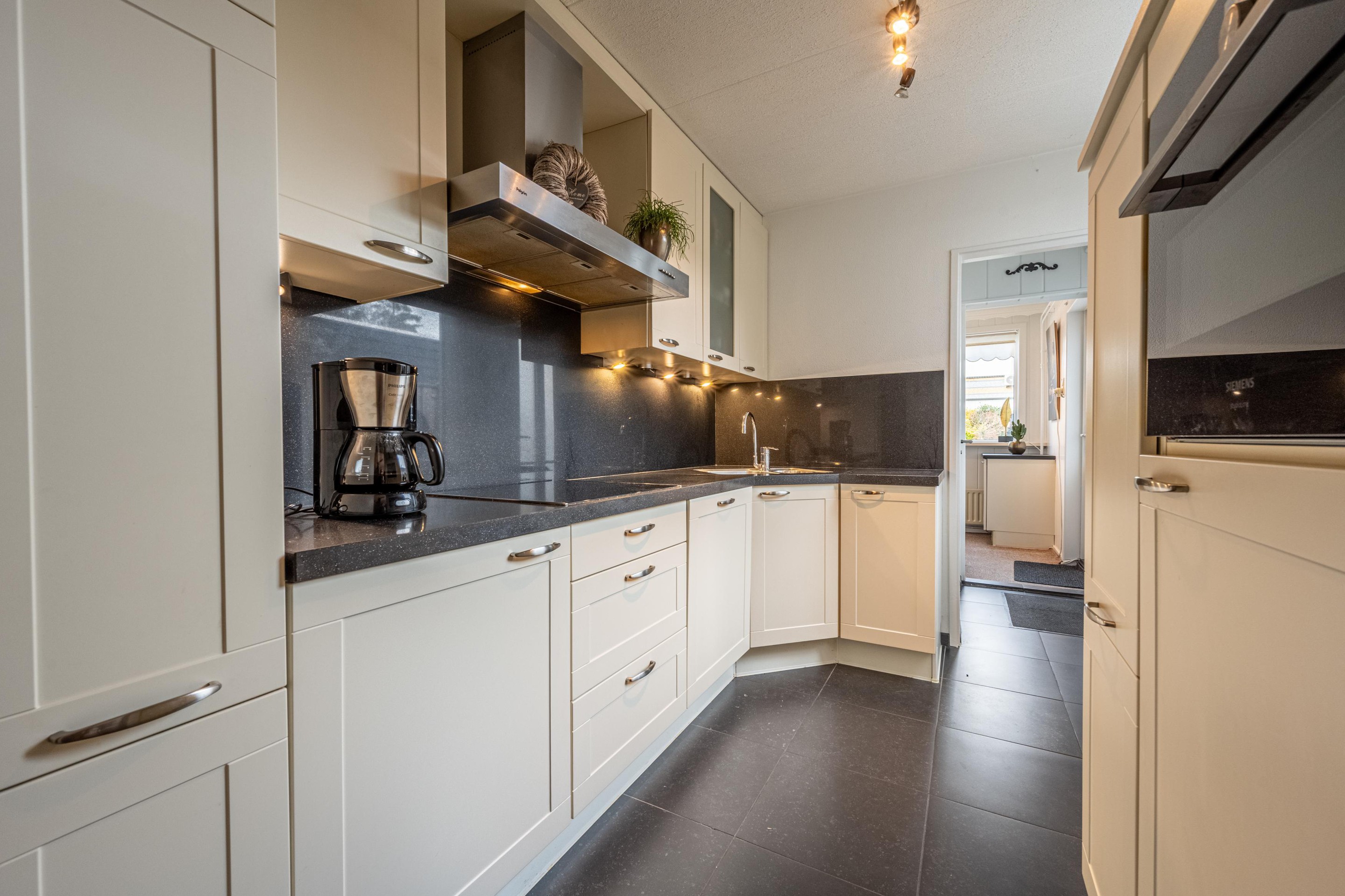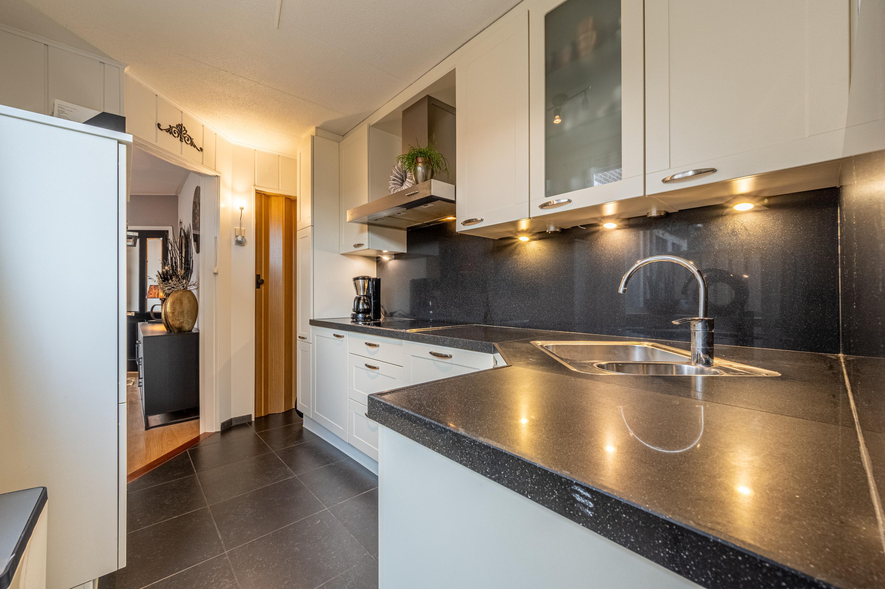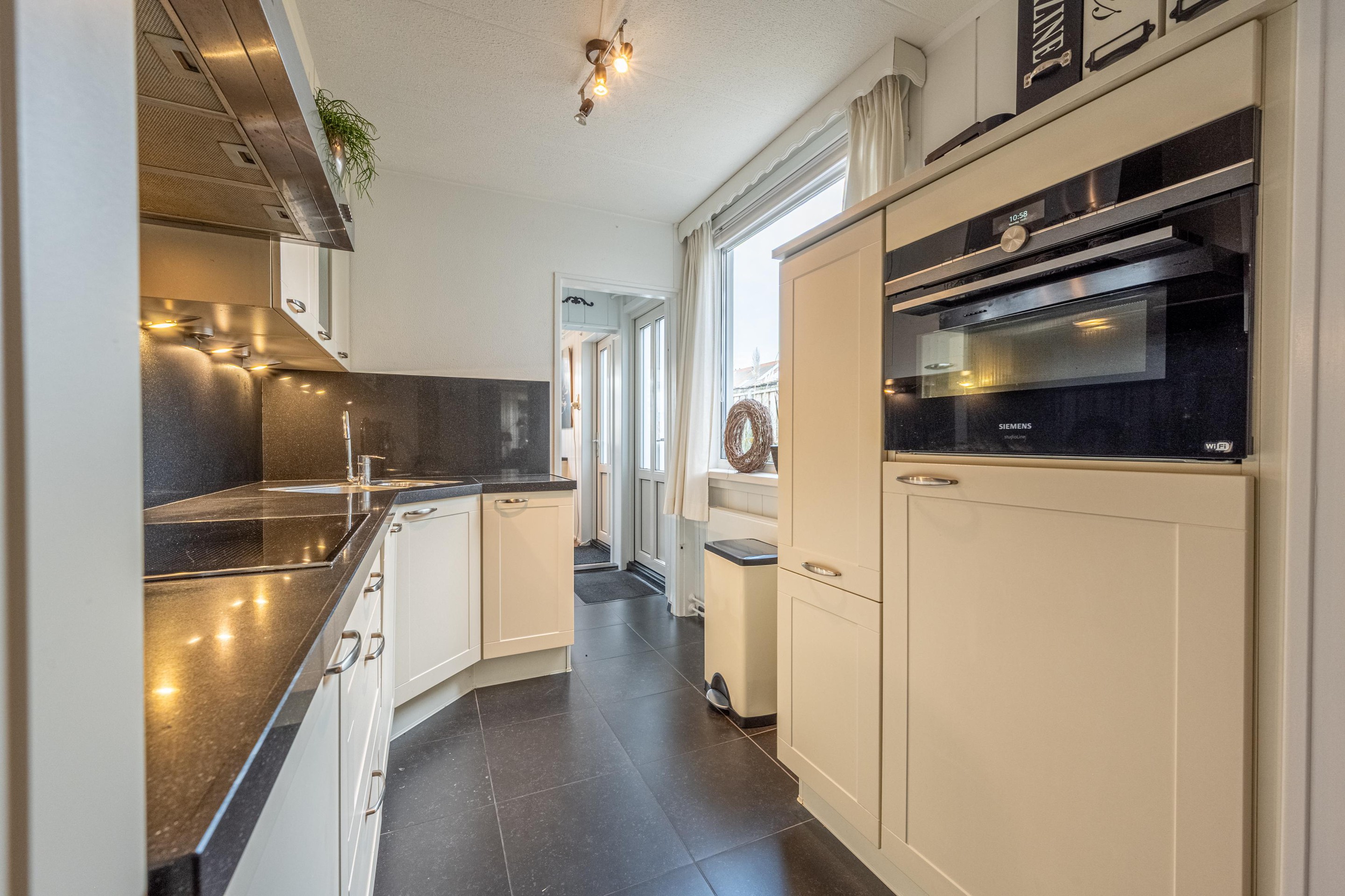 Aan de achterzijde van de woning vind je de keuken, die praktisch en verzorgd is uitgevoerd en voorzien van de benodigde inbouwapparatuur. Extra leuk detail: vanuit de keuken leidt een trapje naar beneden naar een enorme trappenkast/kelder, ideaal voor extra voorraad, opslag of zelfs een wijnkast.