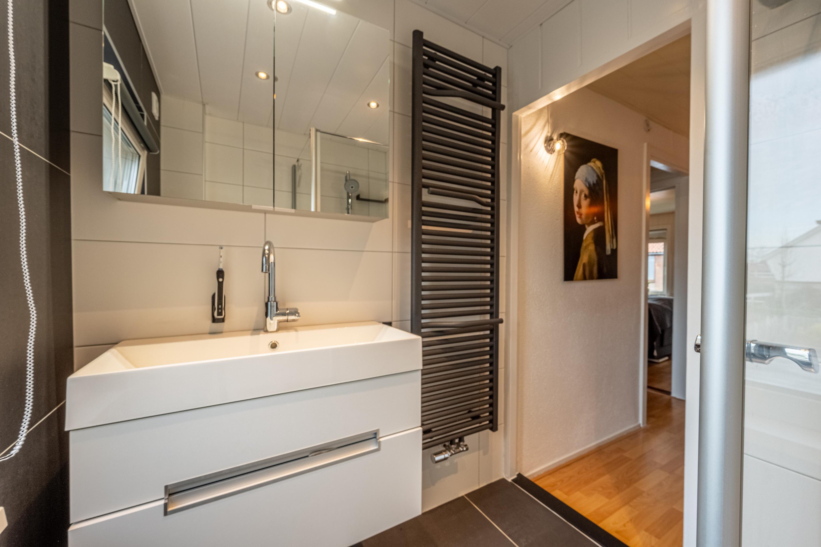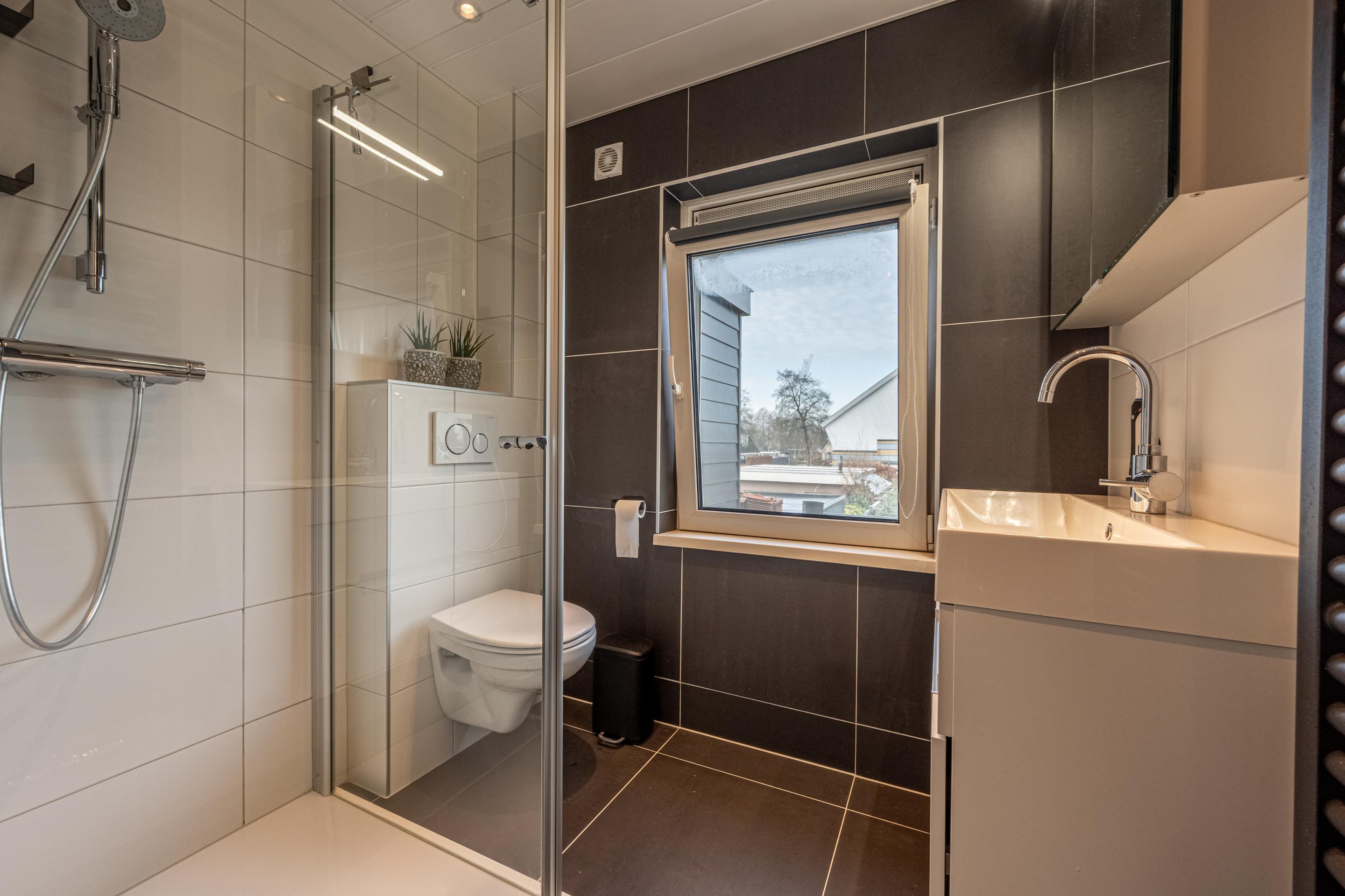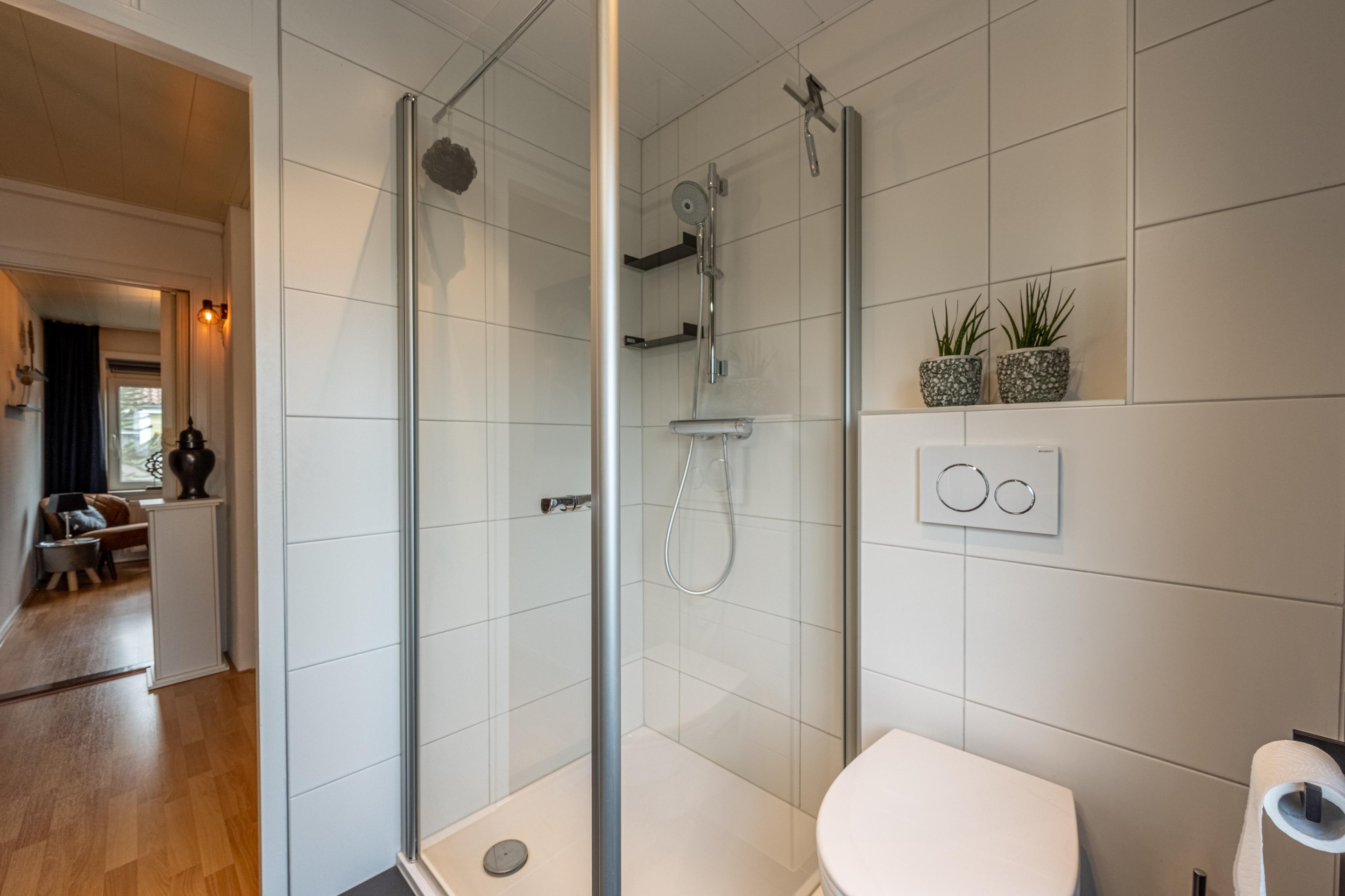 De badkamer is gerenoveerd in 2021 en netjes ingericht en voorzien van een douche, wastafel en toilet. Een fijne ruimte waar je de dag fris begint en ontspannen afsluit.