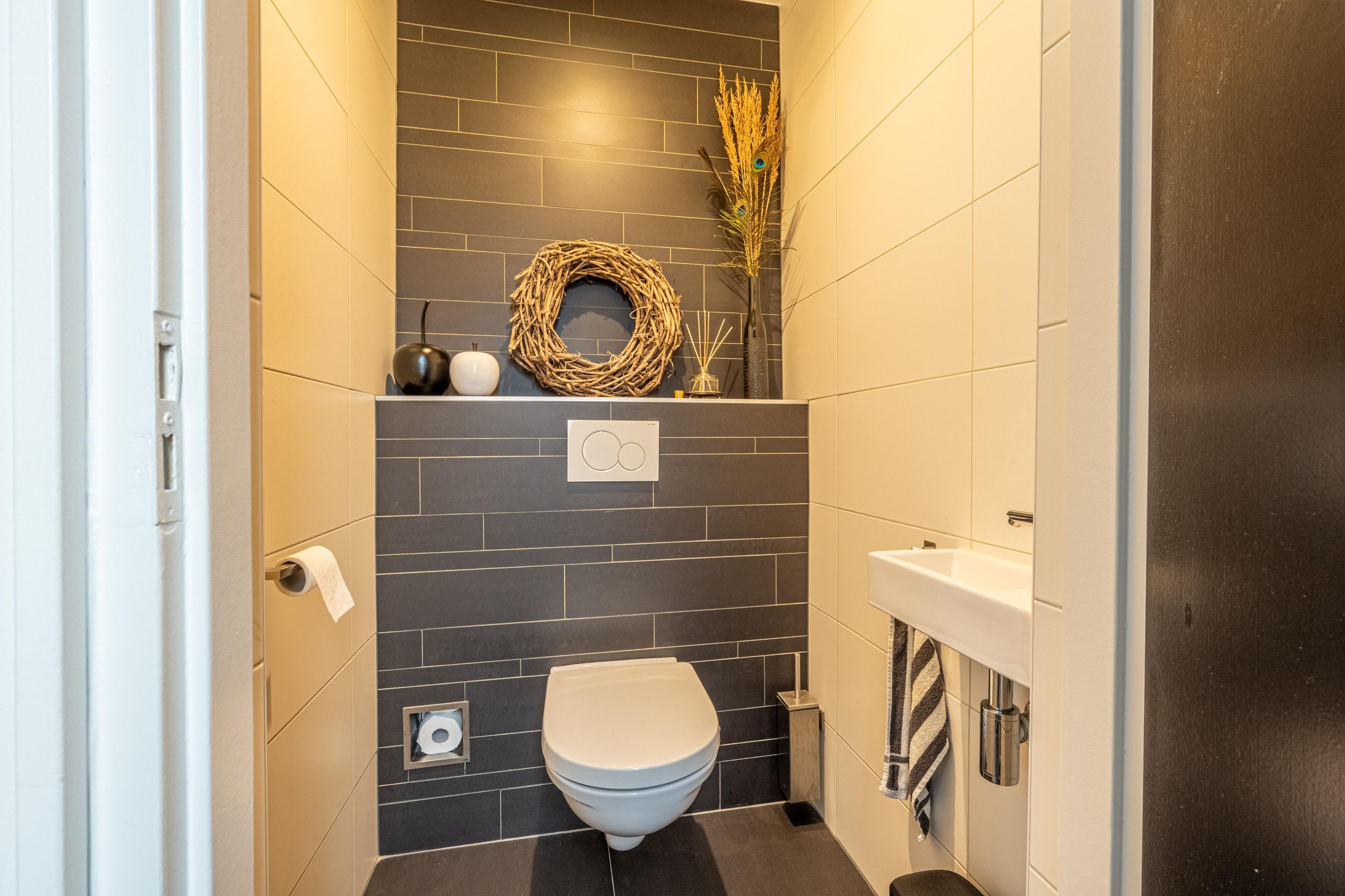 Vanuit de keuken bereik je het halletje tussen de keuken en de bijkeuken, waar ook het toilet aanwezig is. Deze toiletruimte is in 2020 volledig vernieuwd, geheel betegeld en voorzien van een modern fonteintje – strak, fris en helemaal van nu.
