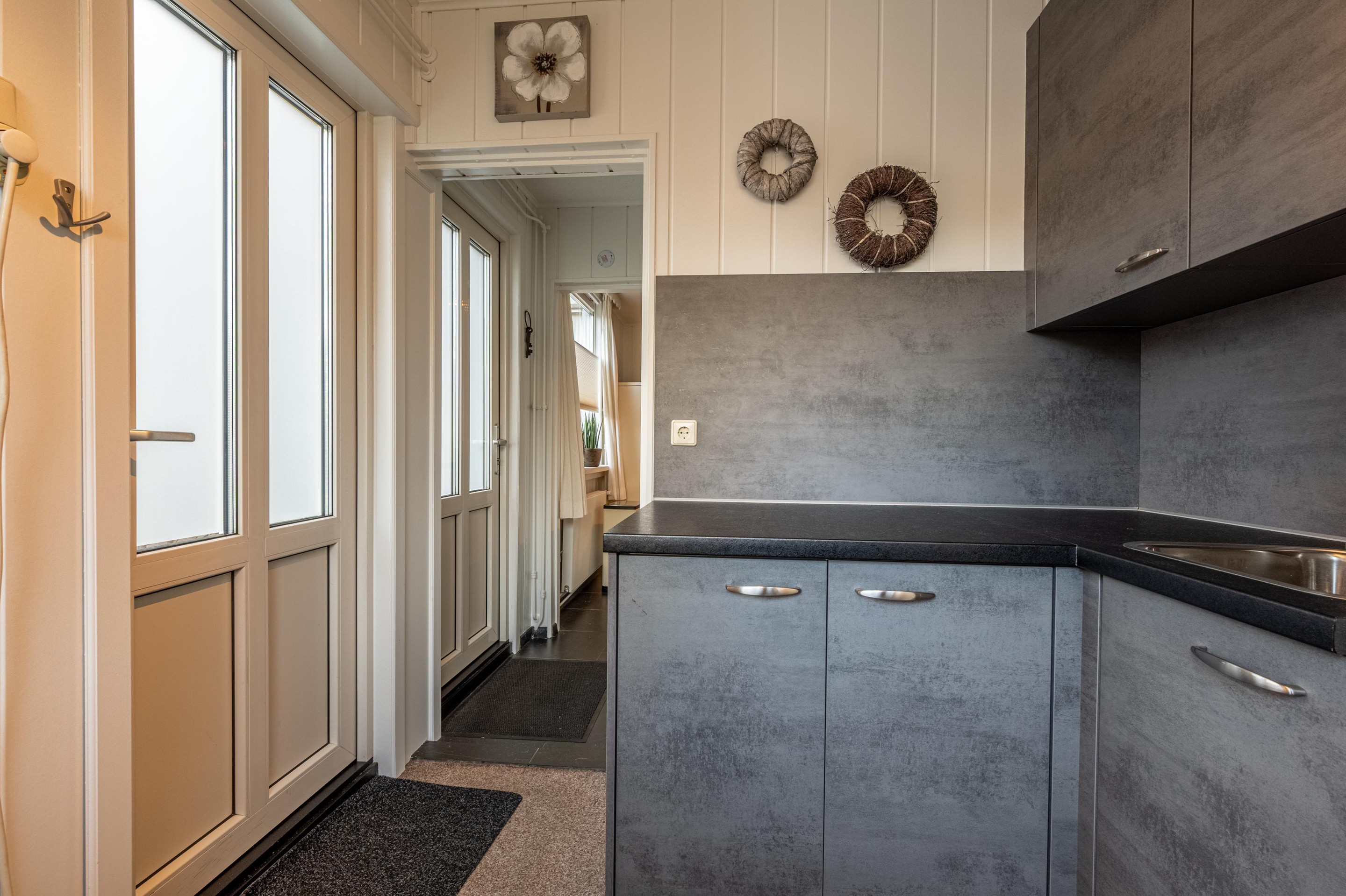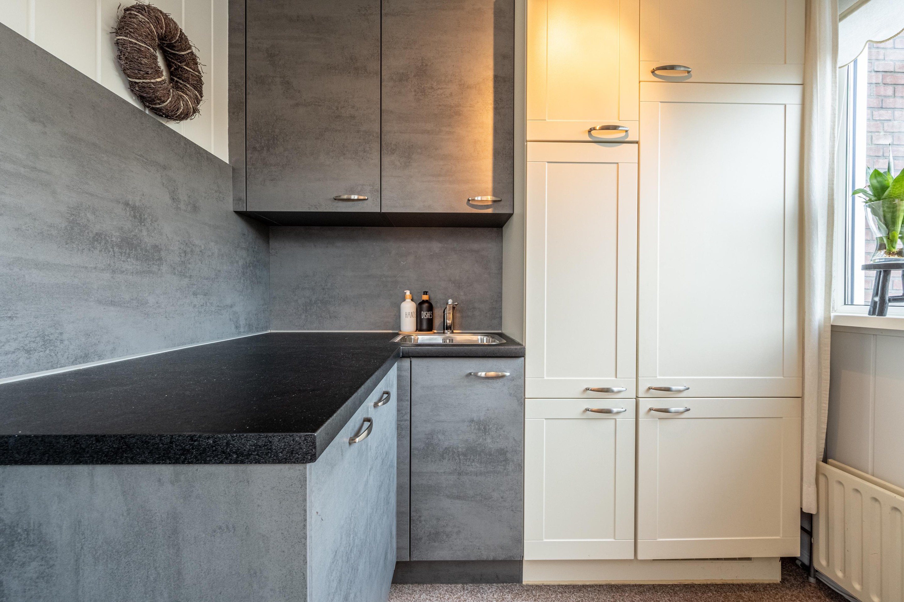 Vanuit de keuken heb je bovendien toegang tot het achterportaal/bijkeuken, waar je extra bergruimte en de aansluitingen voor het witgoed vindt. En alsof dat nog niet handig genoeg is, is er in de bijkeuken ook een tweede (uitgebreide) keukenopstelling aanwezig met extra kastruimte, ingebouwde vriezer en spoelbak – perfect voor extra opslag, koken of huishouden.