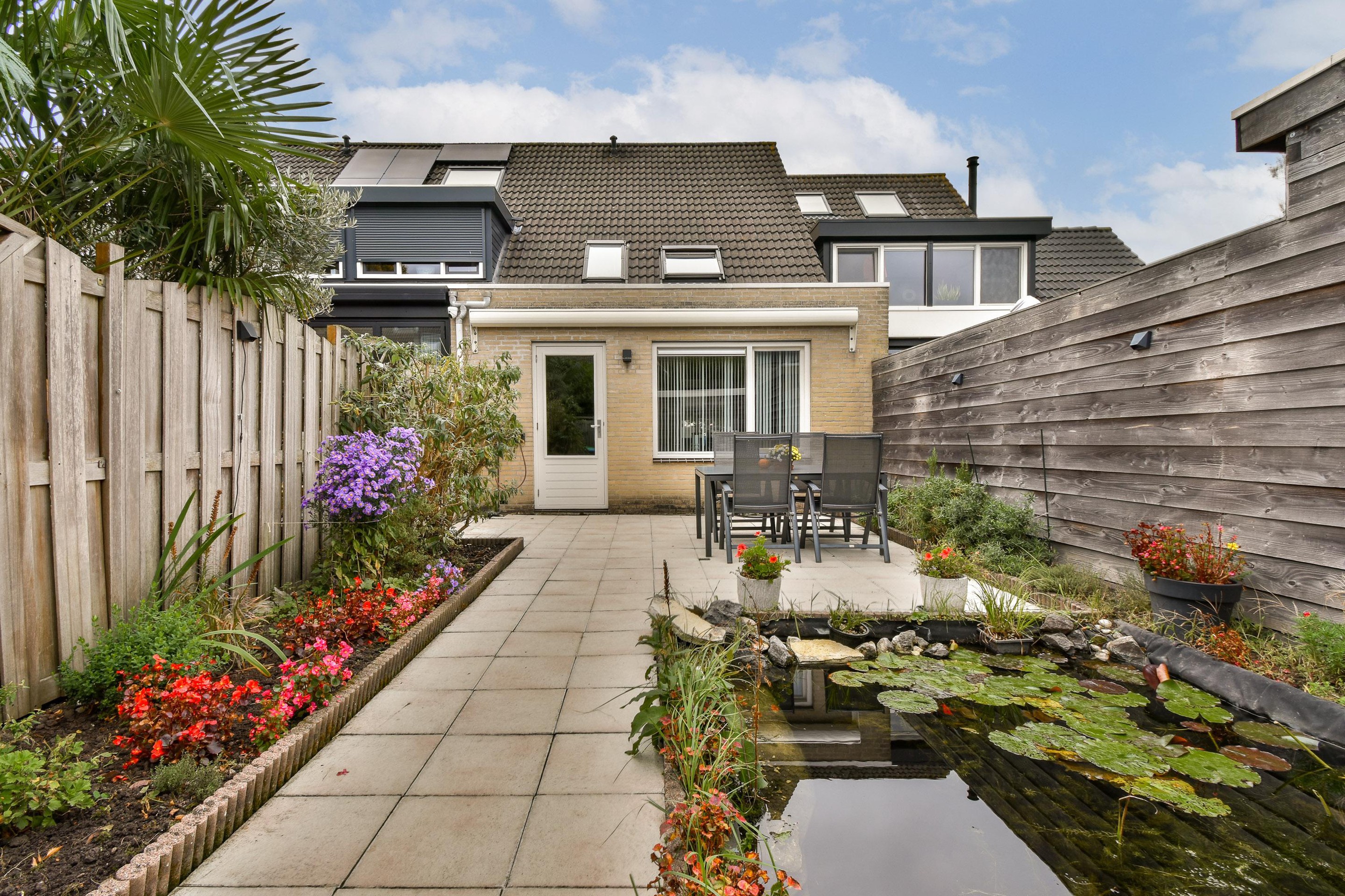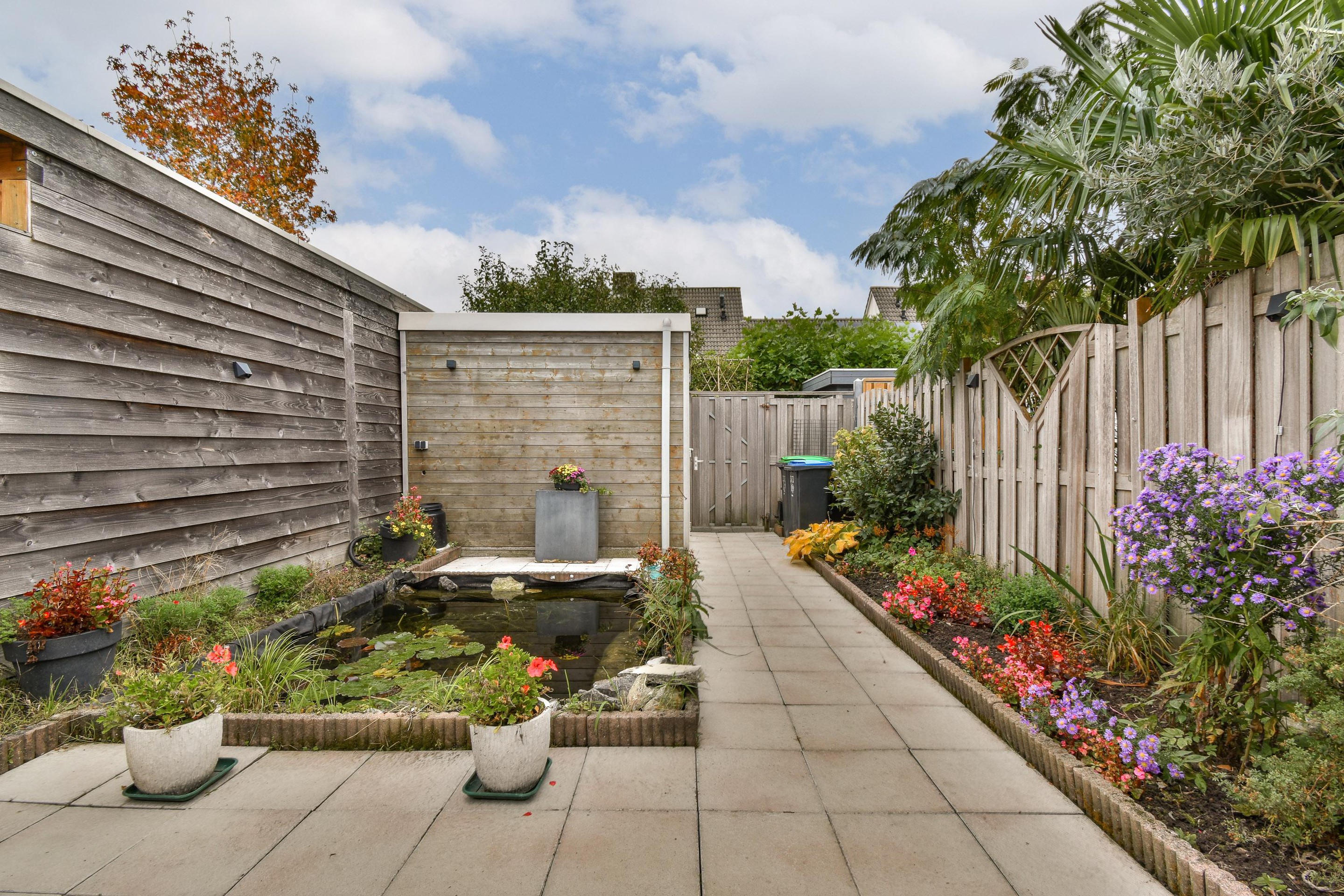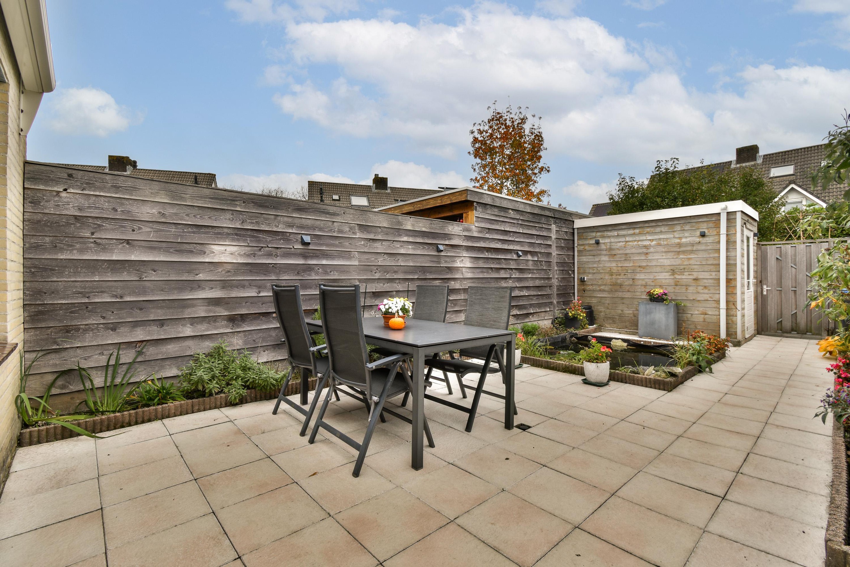 De achtertuin is keurig aangelegd met een royaal terras, een onderhoudsvriendelijke bestrating en een groene touch door de vijver voor extra sfeer. Er is voldoende ruimte voor een eettafel of loungeset, zodat je hier tot in de late uurtjes kunt genieten van zwoele zomeravonden. De houten berging biedt handige extra opbergruimte voor fietsen of tuingereedschap, en dankzij de achterom is de tuin ook gemakkelijk bereikbaar.
