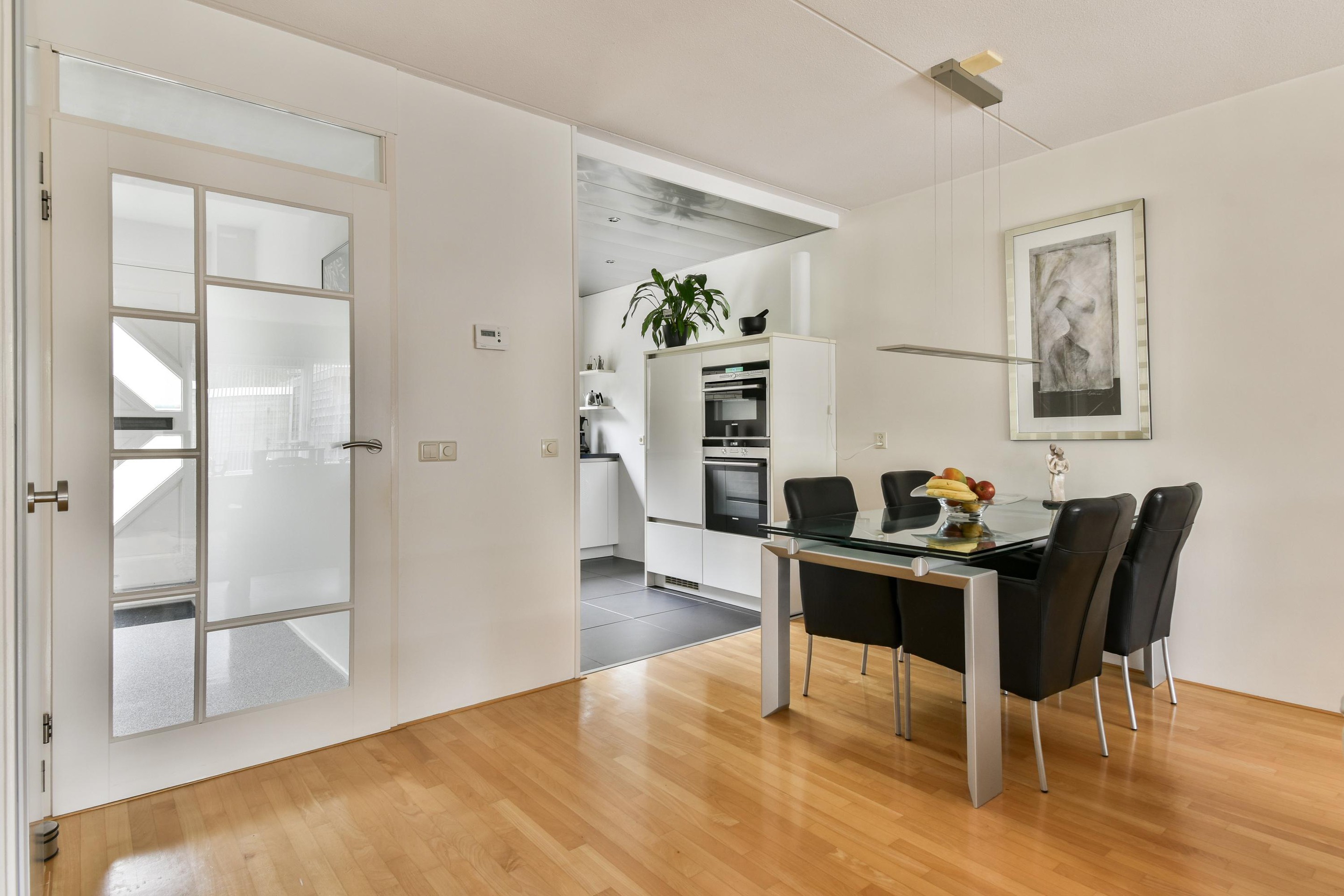 Aan de voorzijde bevindt zich de moderne open keuken, een echte blikvanger in de woning. De keuken is opgesteld in een praktische, eigentijdse indeling en voorzien van diverse inbouwapparatuur zoals een gaskookplaat, afzuigkap, oven, combi magnetron, vaatwasser en koelkast. Dankzij de ruime werkbladen heb je alle ruimte om uitgebreid te koken.
