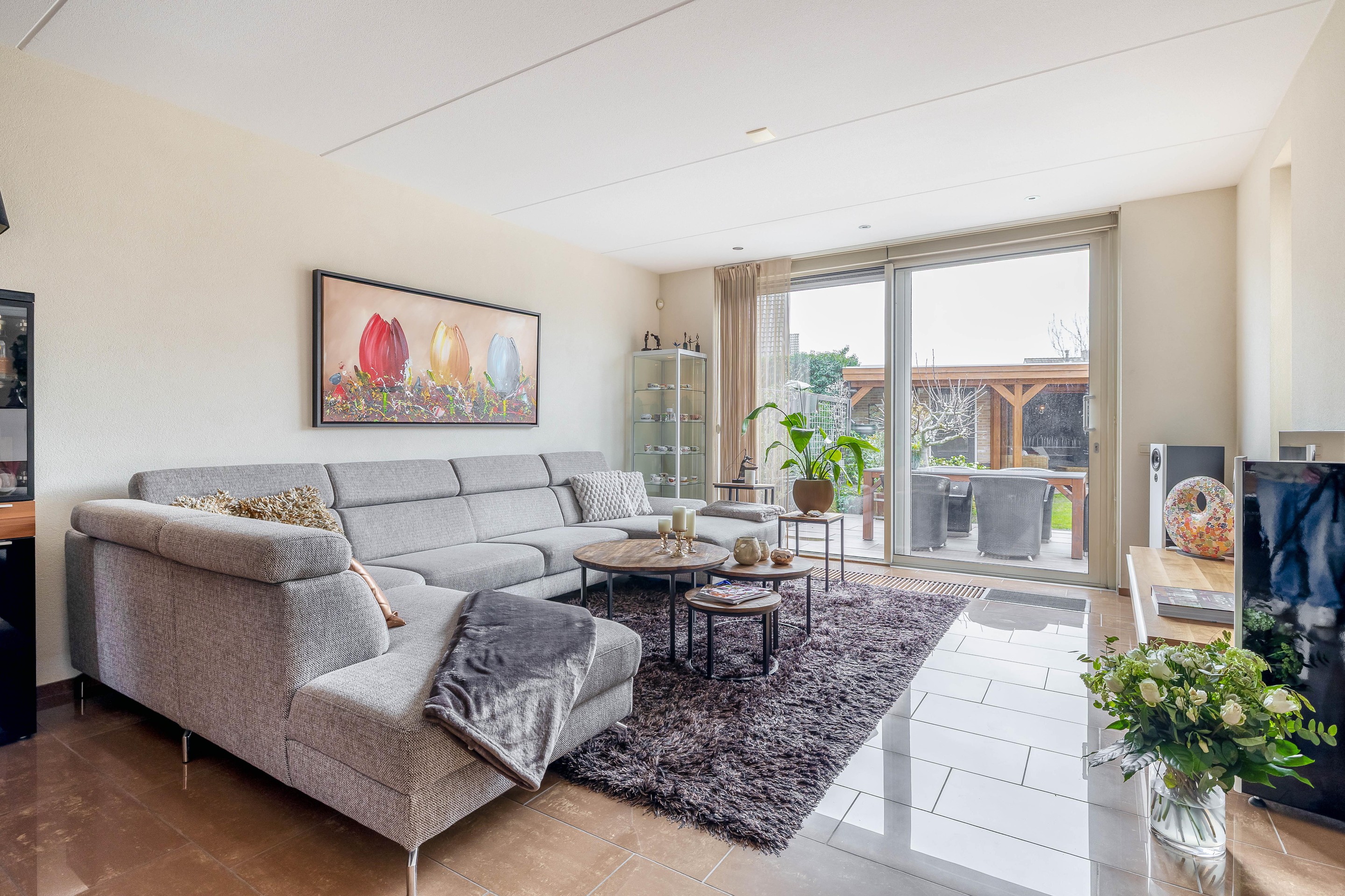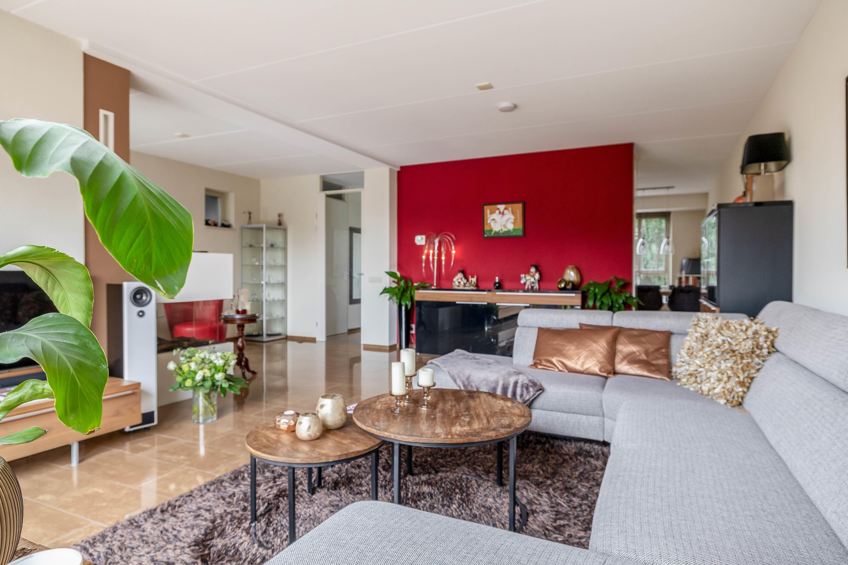 Vanuit de hal stap je de ruime woonkamer in. Wat direct opvalt is de hoeveelheid licht en de fijne indeling. De gashaard zorgt voor een warme en gezellige sfeer, echt zo’n plek waar je ’s avonds heerlijk neerploft.