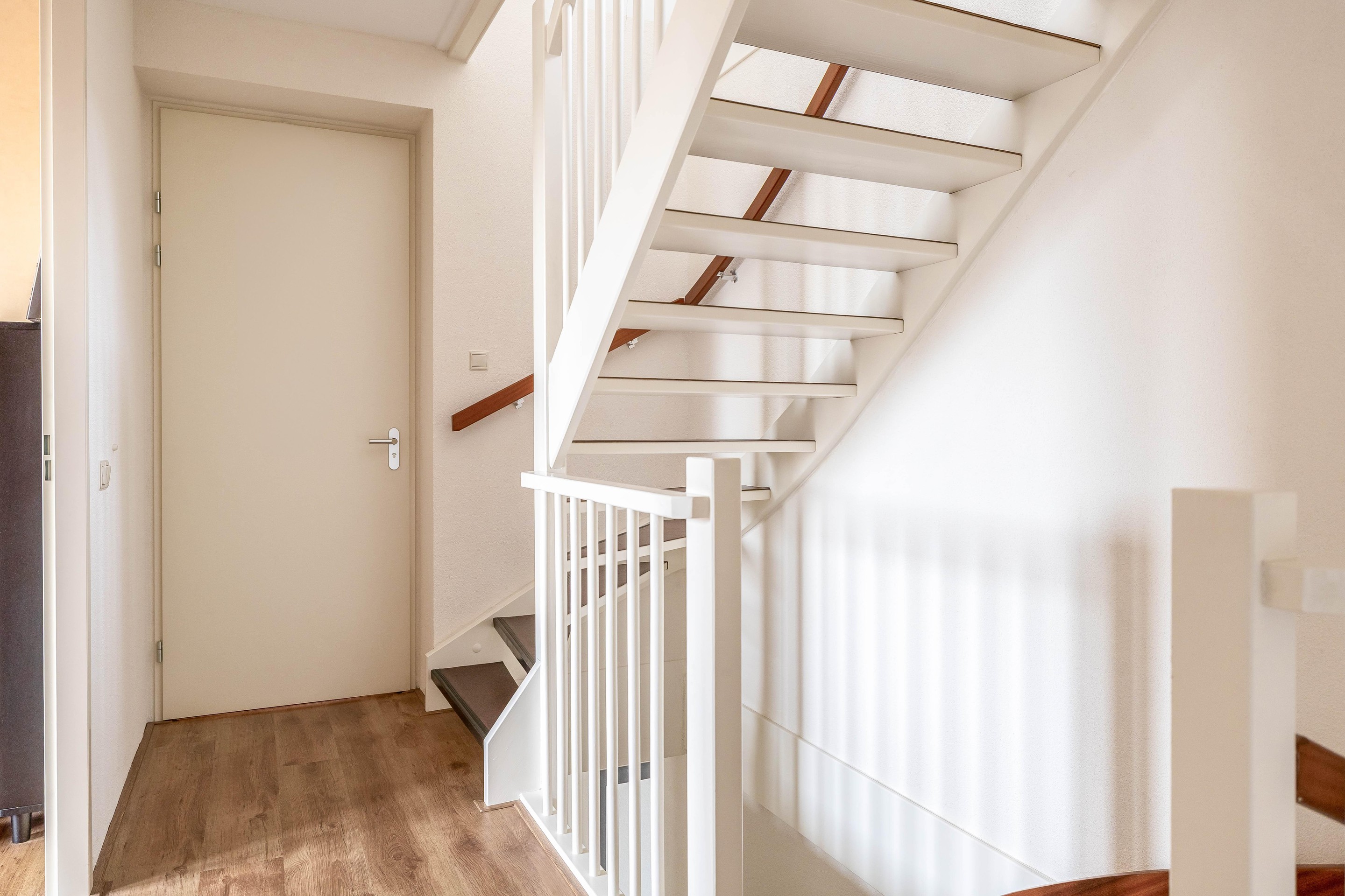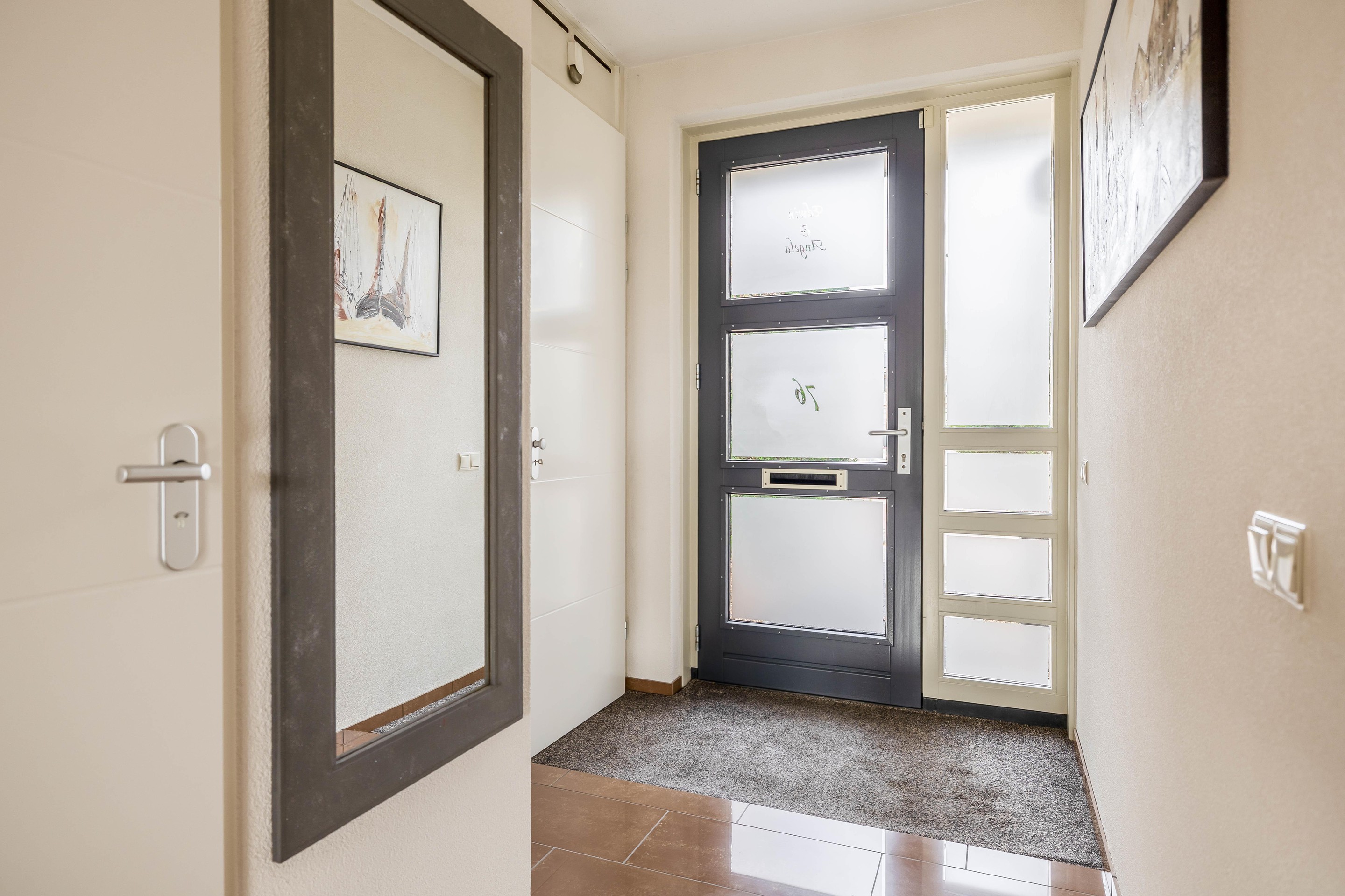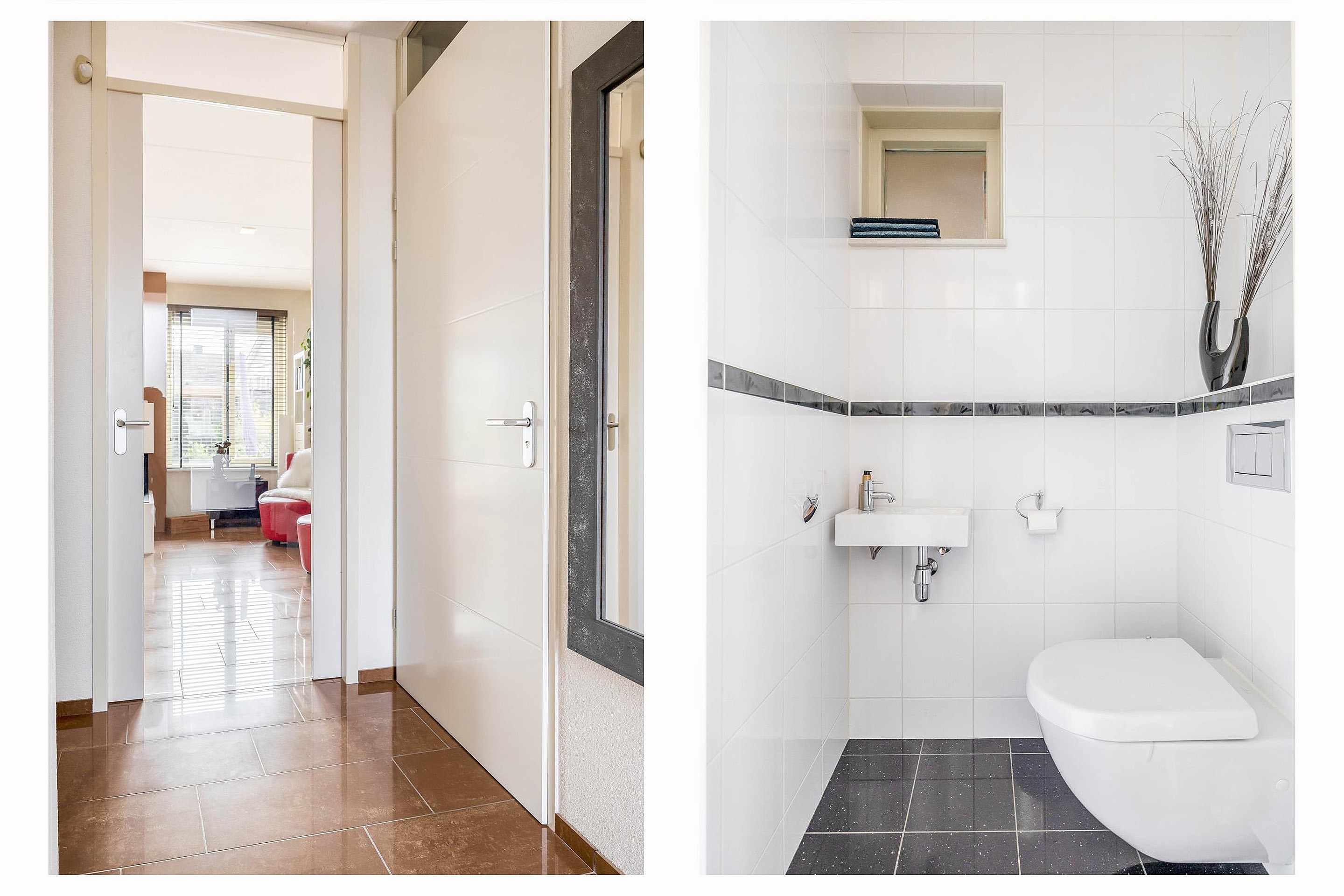 Via de voortuin en eigen oprit kom je binnen in de hal met toilet, meterkast en trapopgang. Het toilet heeft een strakke afwerking en is voorzien van een hangend closet en fonteintje.