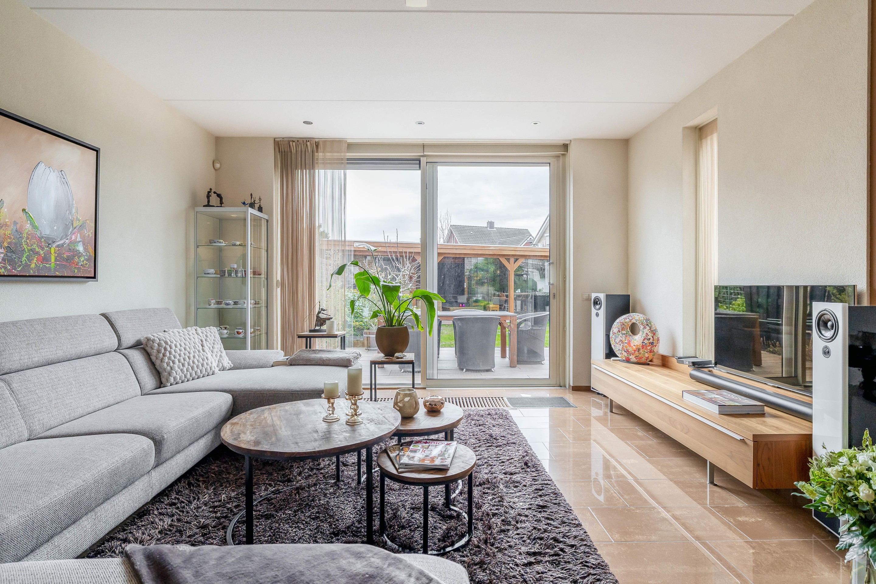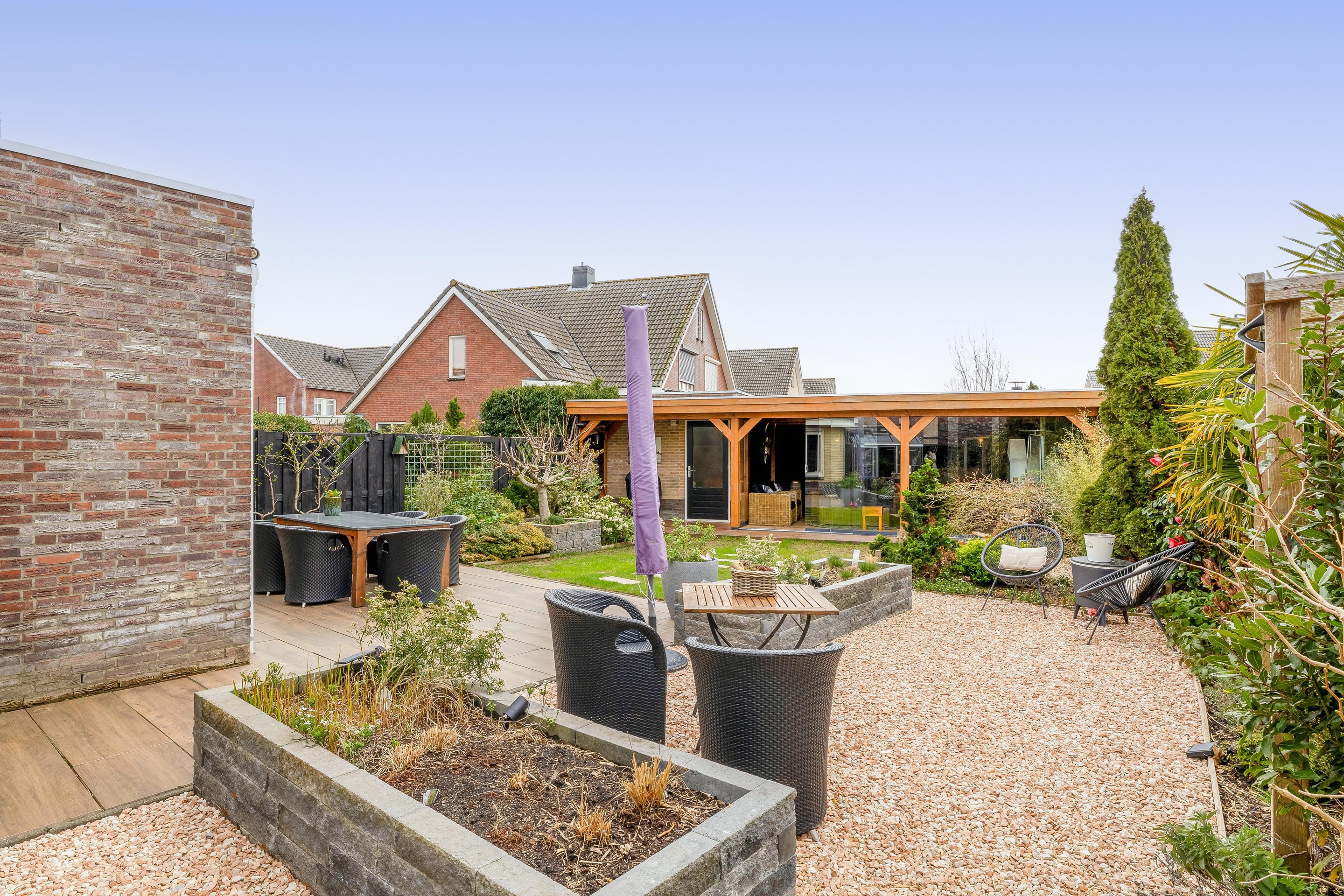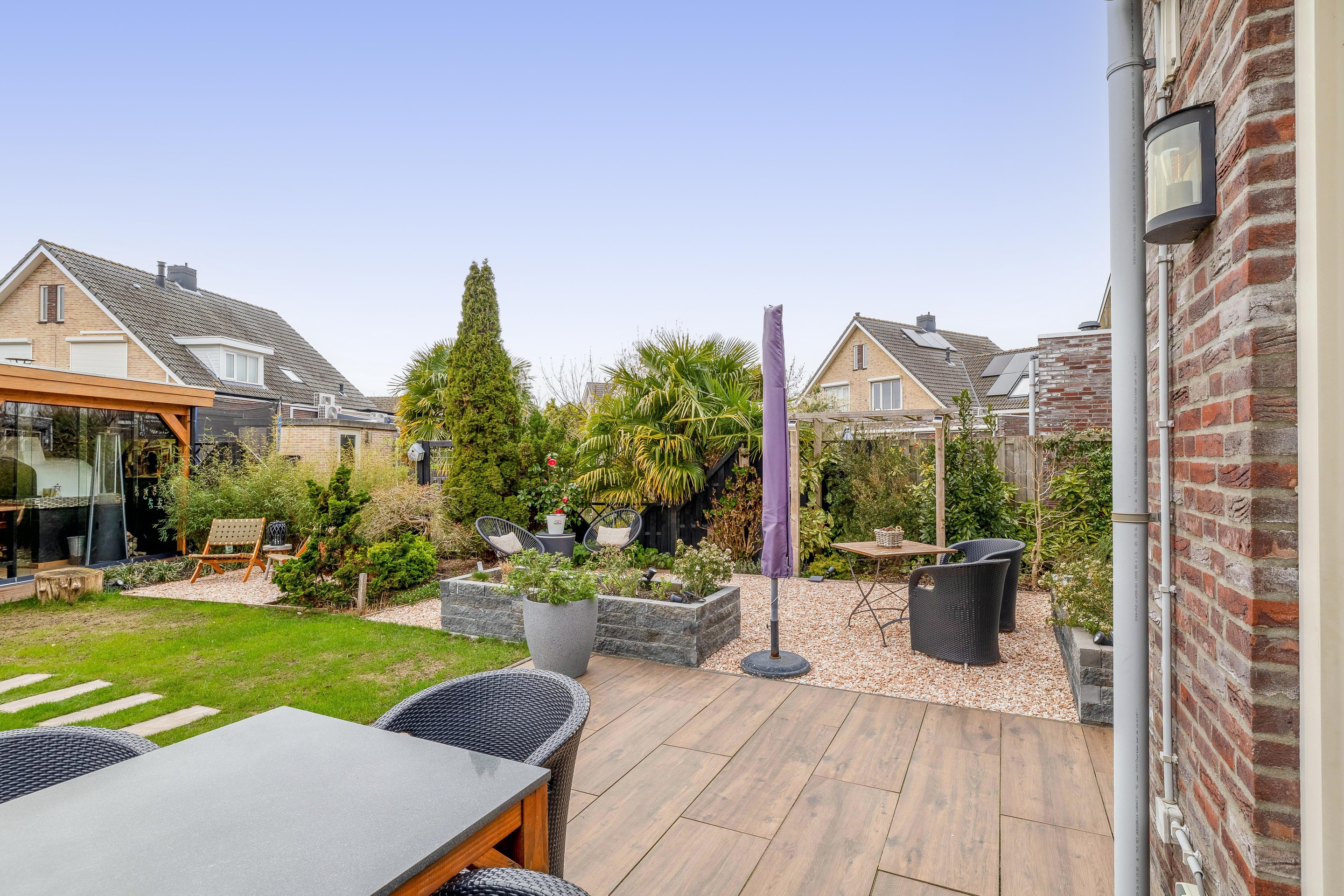 En dan de tuin… via de woonkamer loop je zo de diepe, zonnige achtertuin op het zuiden in. Hier begint het echte genieten. Meerdere terrassen, veel groen en als absolute eyecatcher de luxe afsluitbare overkapping met steenoven/pizza keuken. Of je nu een lange zomeravond hebt of juist een knusse winterdag, hier zit je altijd goed!
