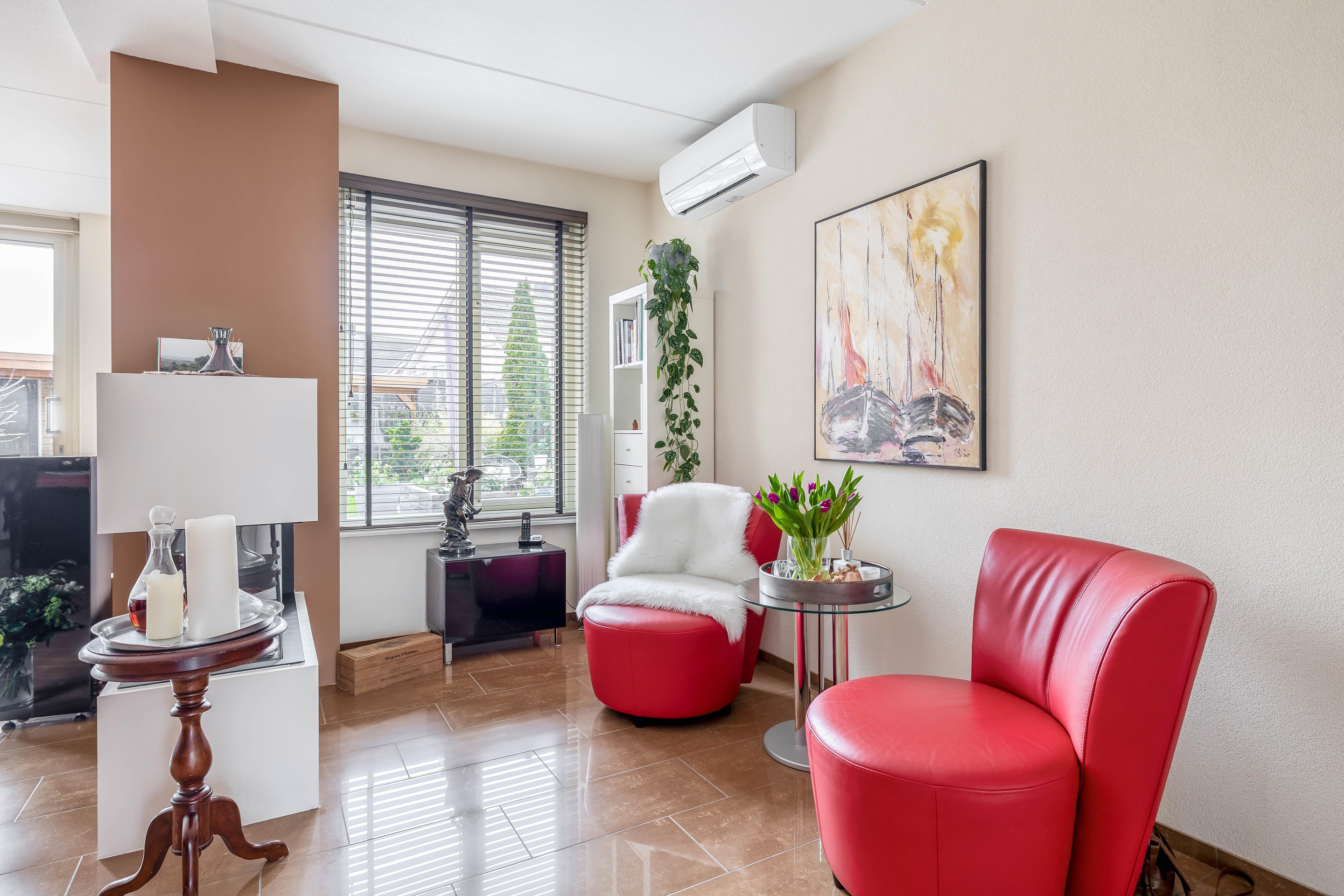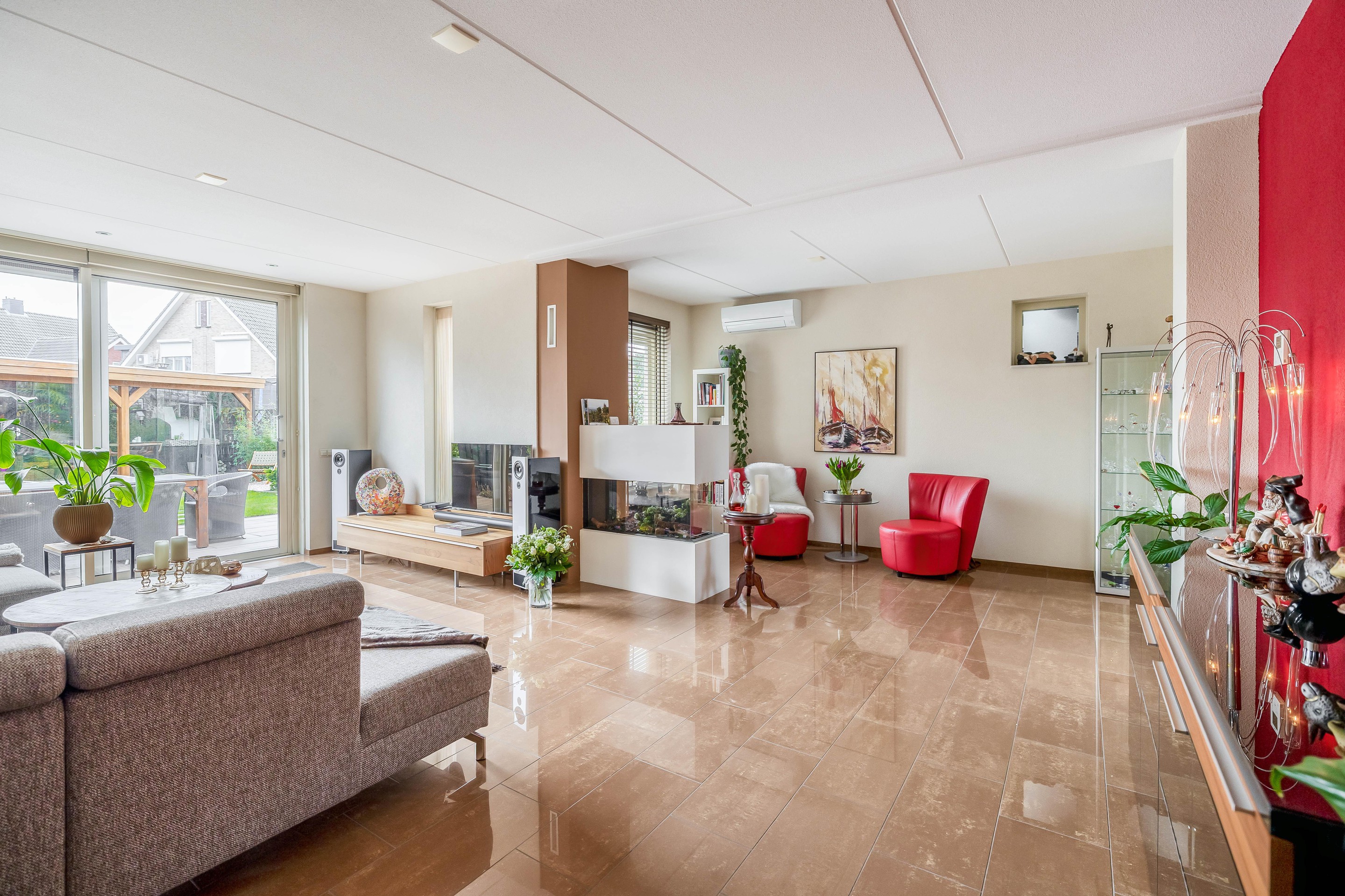 7. Sfeervolle woonkamer met gashaard en veel lichtinval