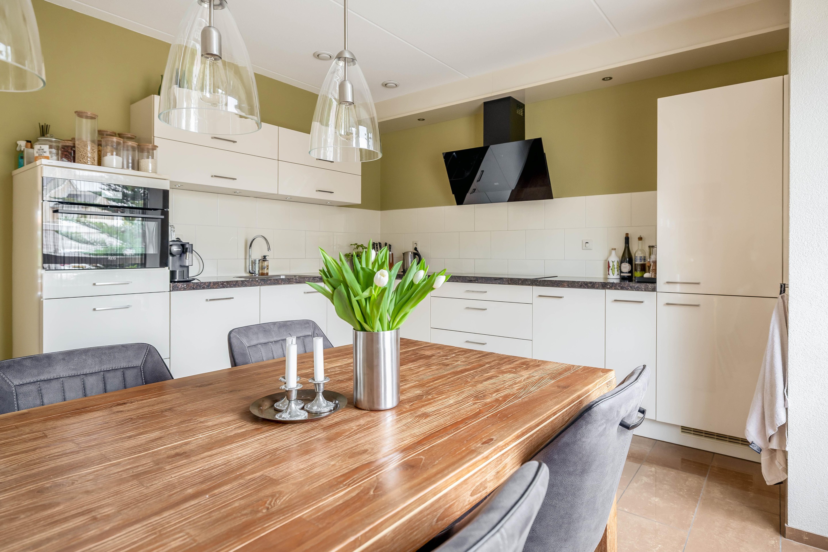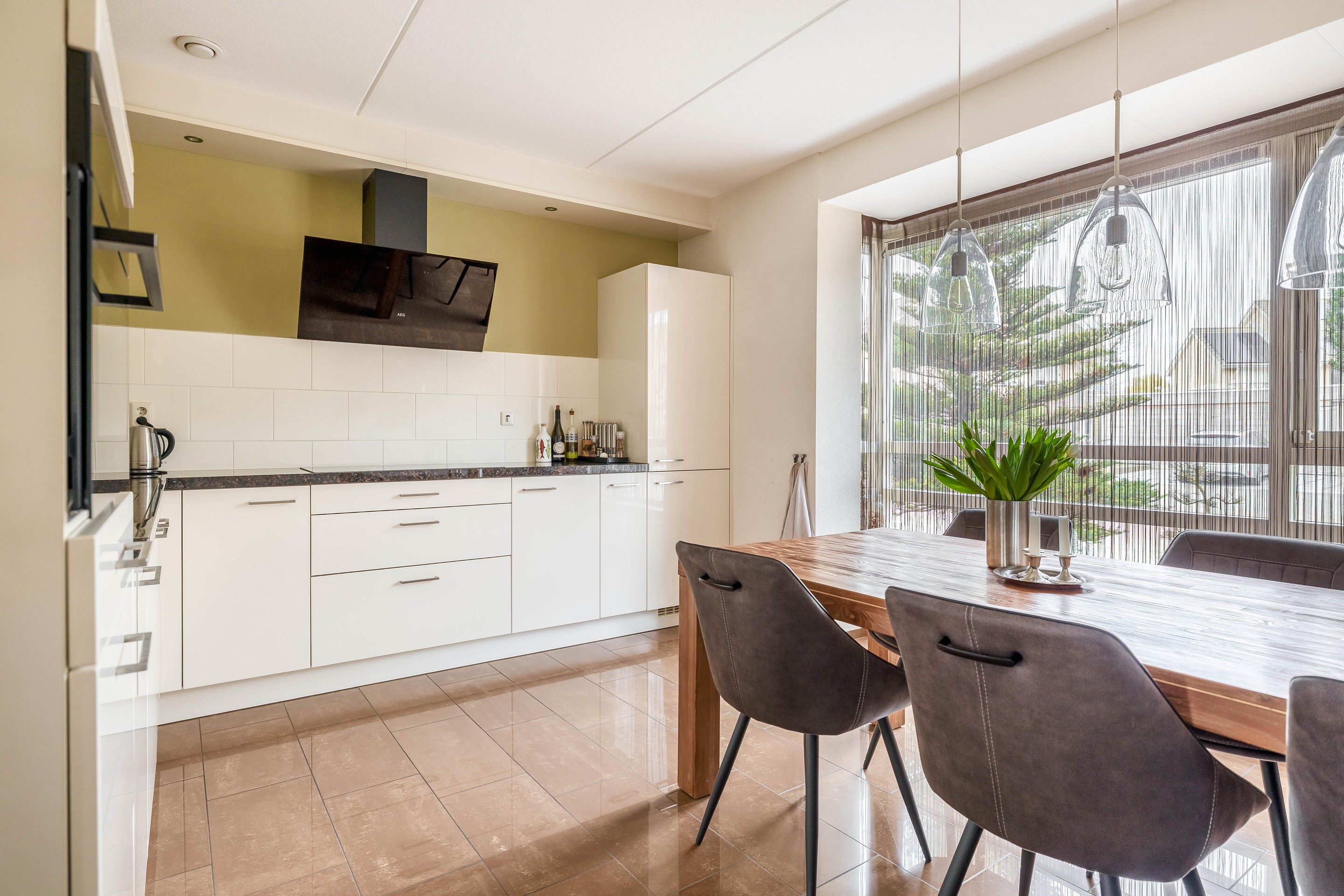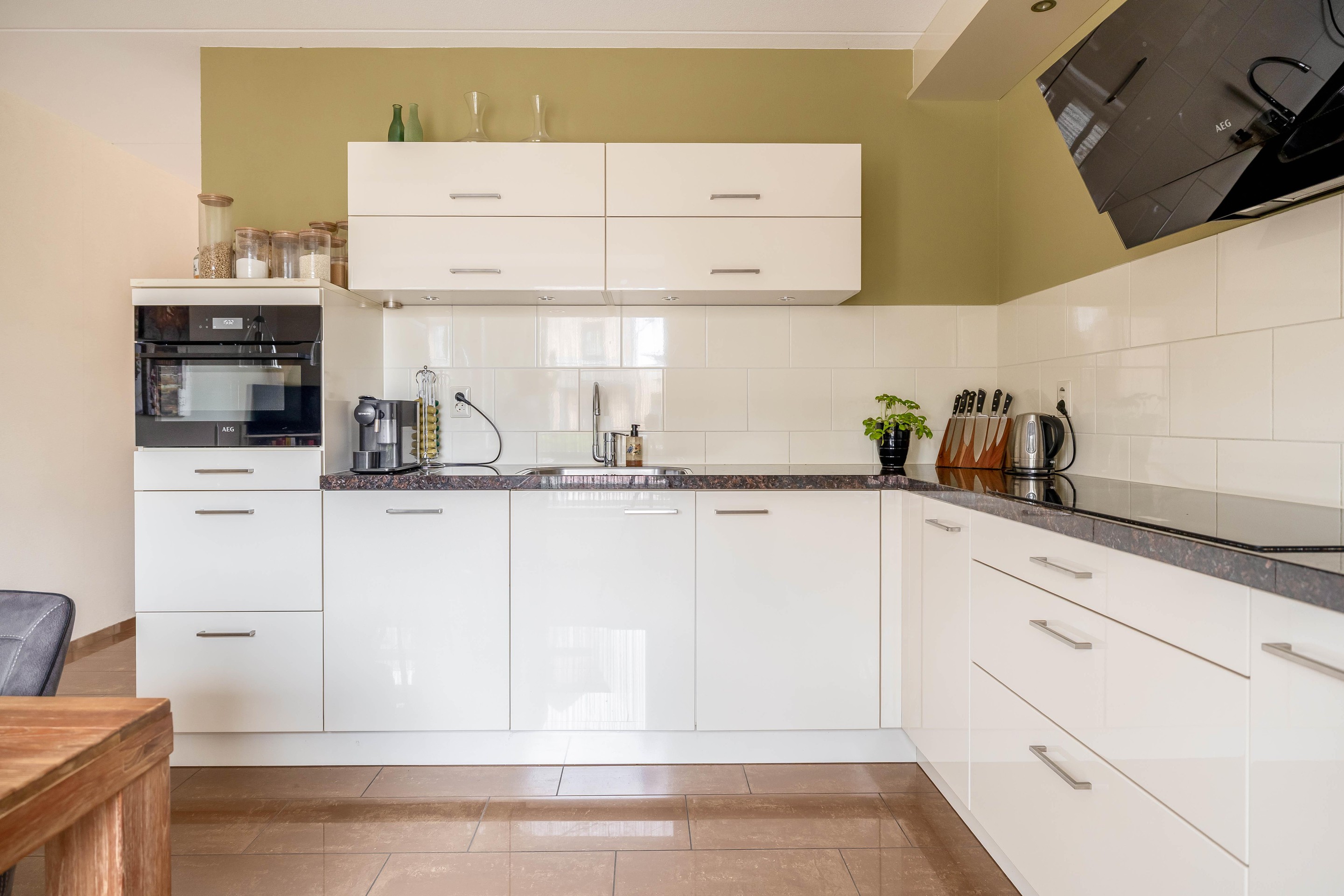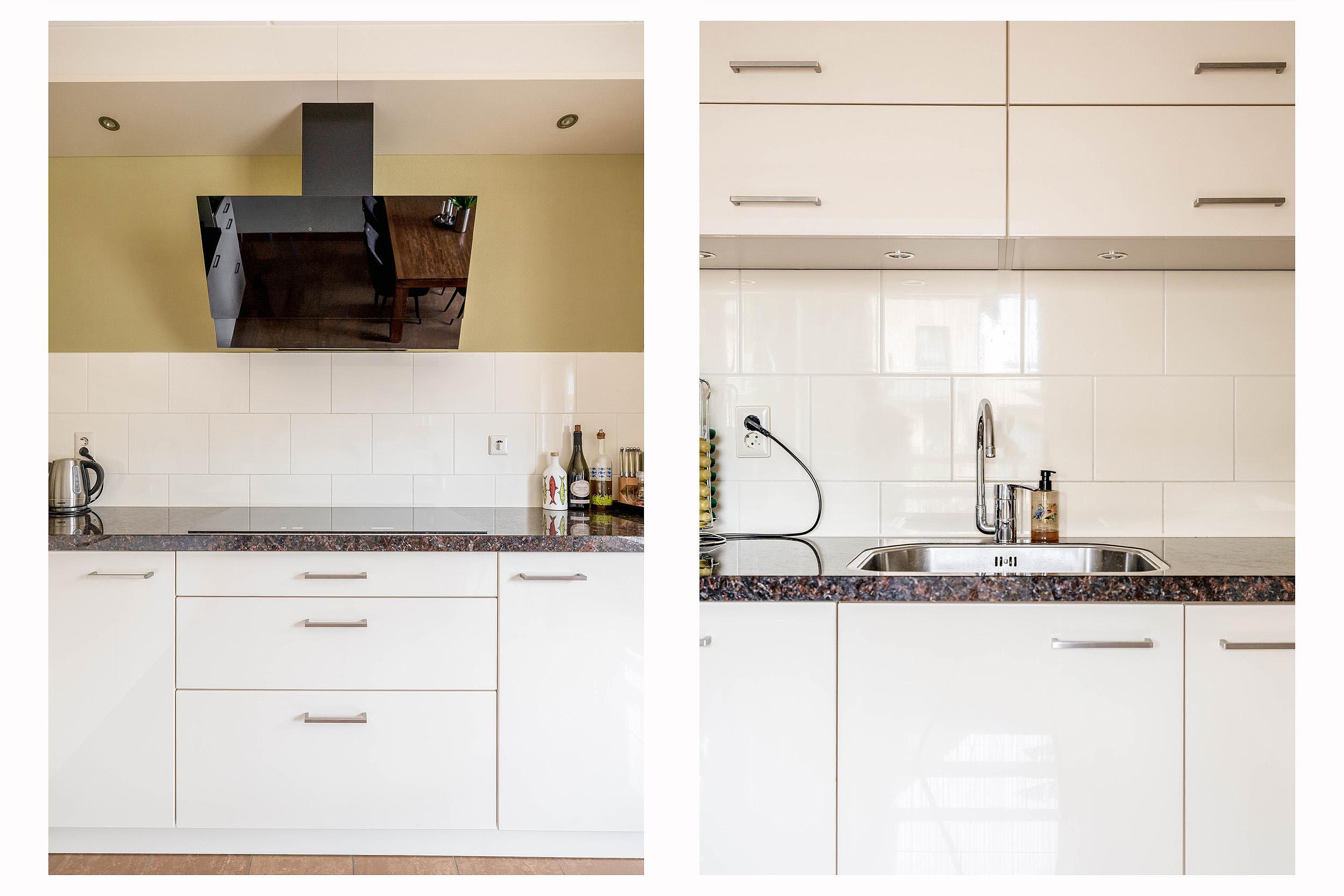 Aan de voorzijde van de woning bevindt zich de strakke keuken in hoekopstelling, voorzien van diverse inbouwapparatuur, een close-in boiler en voldoende werk- en kastruimte.