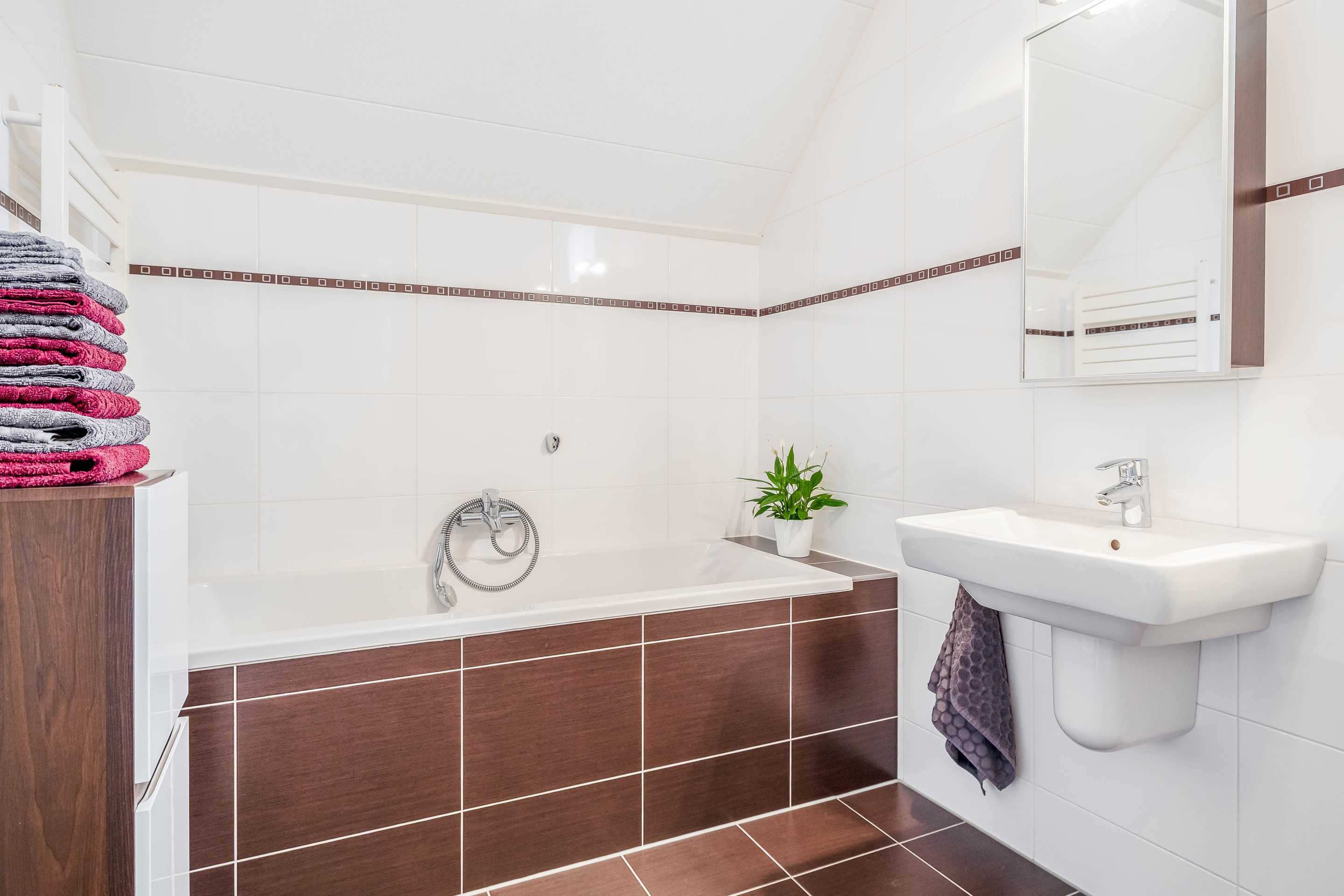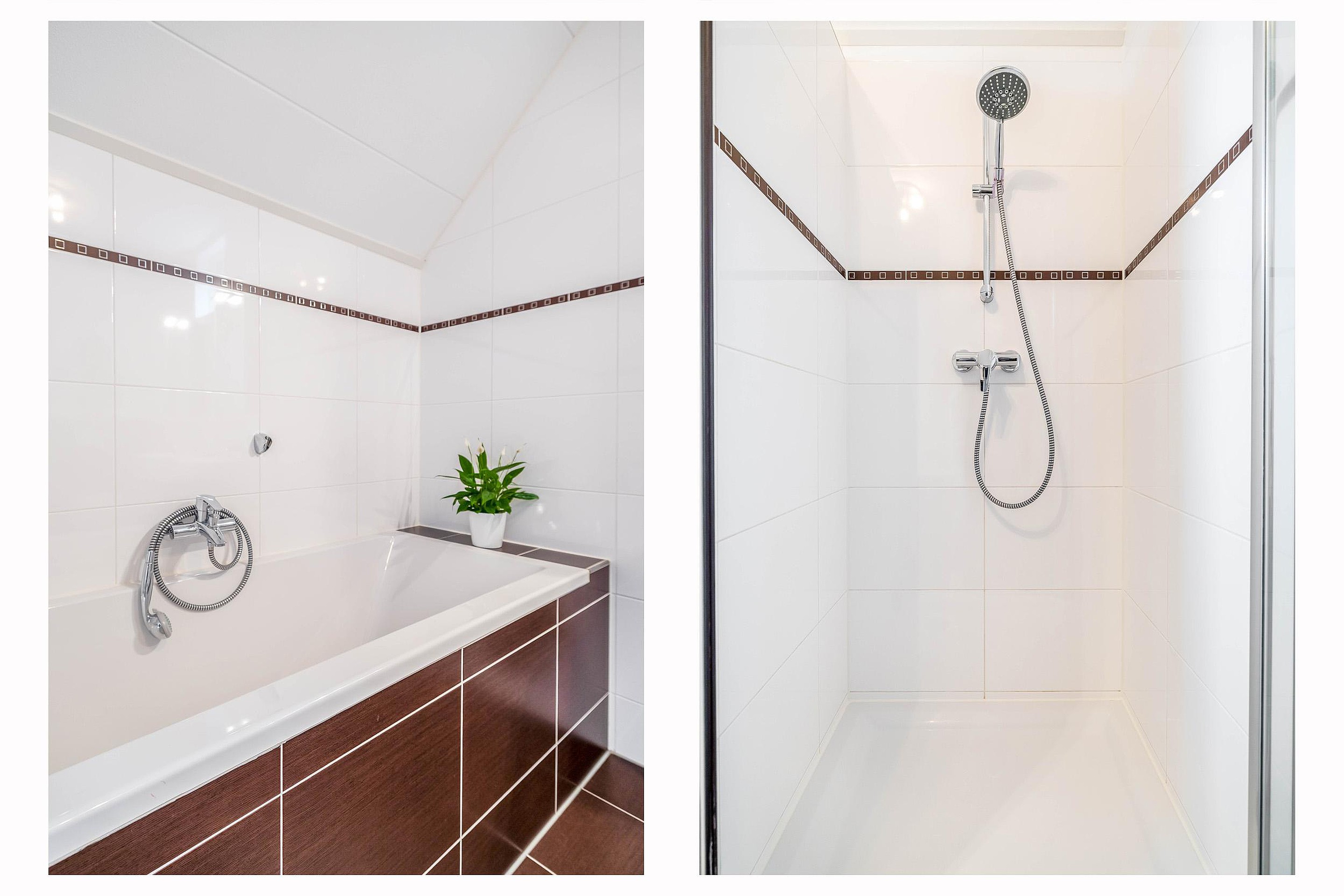 De overloop geeft toegang tot twee zeer ruime slaapkamers. De slaapkamer aan de achterzijde beschikt over een fijne grote inloopkast. Van deze slaapkamer aan de achterzijde kan je eenvoudig twee slaapkamers maken, dit was op de originele bouwtekening ook zo ingetekend. De badkamer is netjes afgewerkt en voorzien van een douche, ligbad, dubbele wastafel en toilet. Dankzij de vloerverwarming is het hier extra comfortabel.