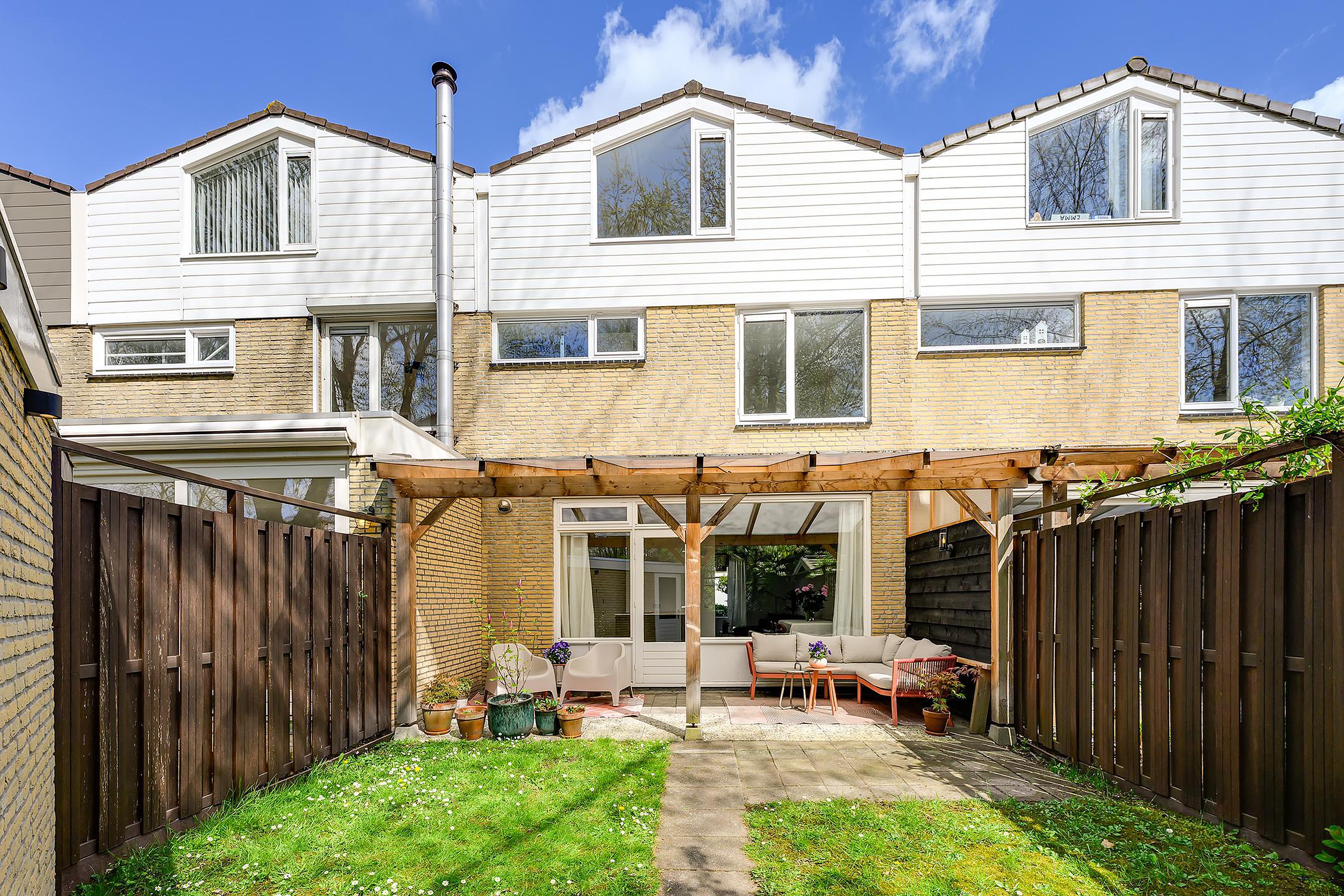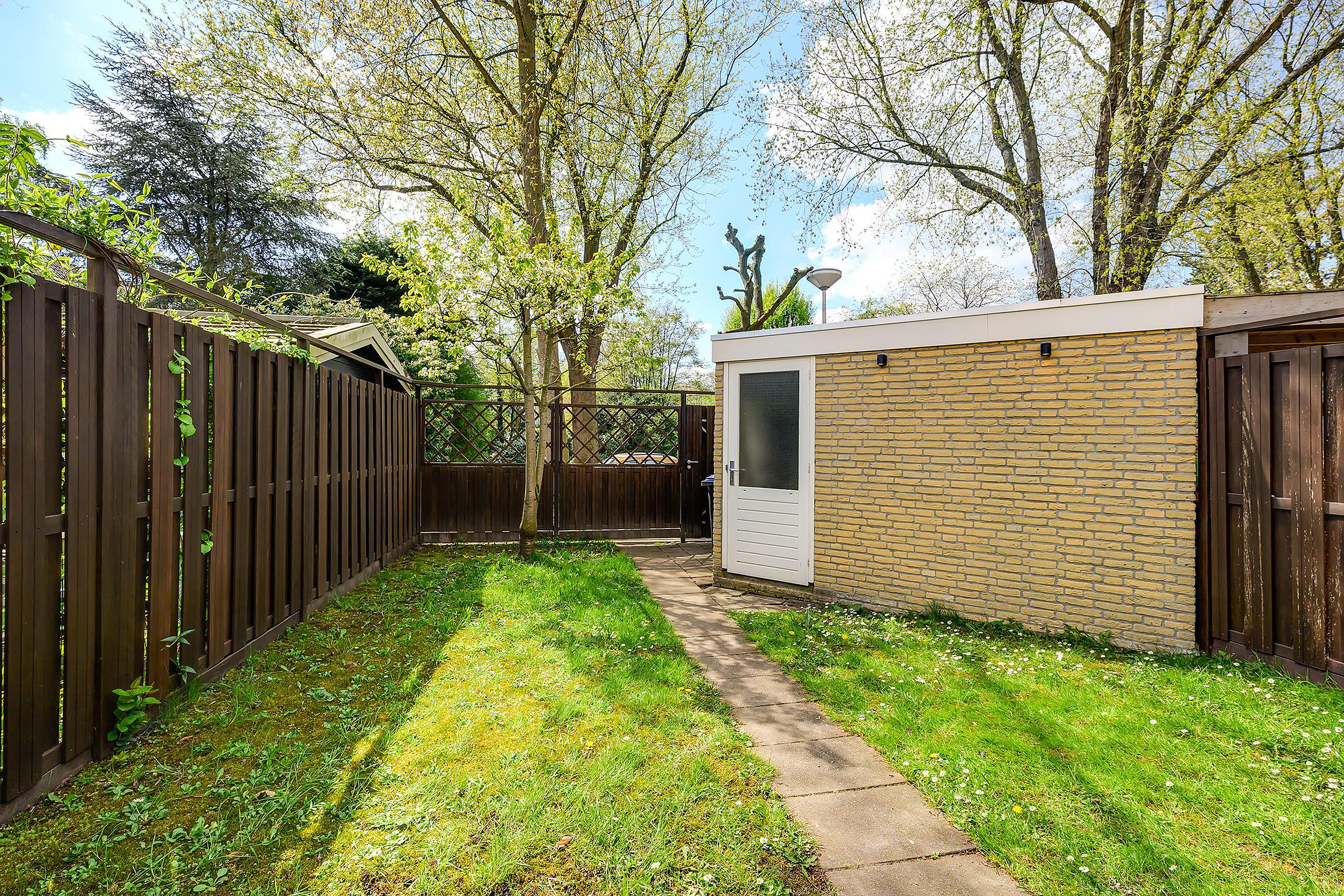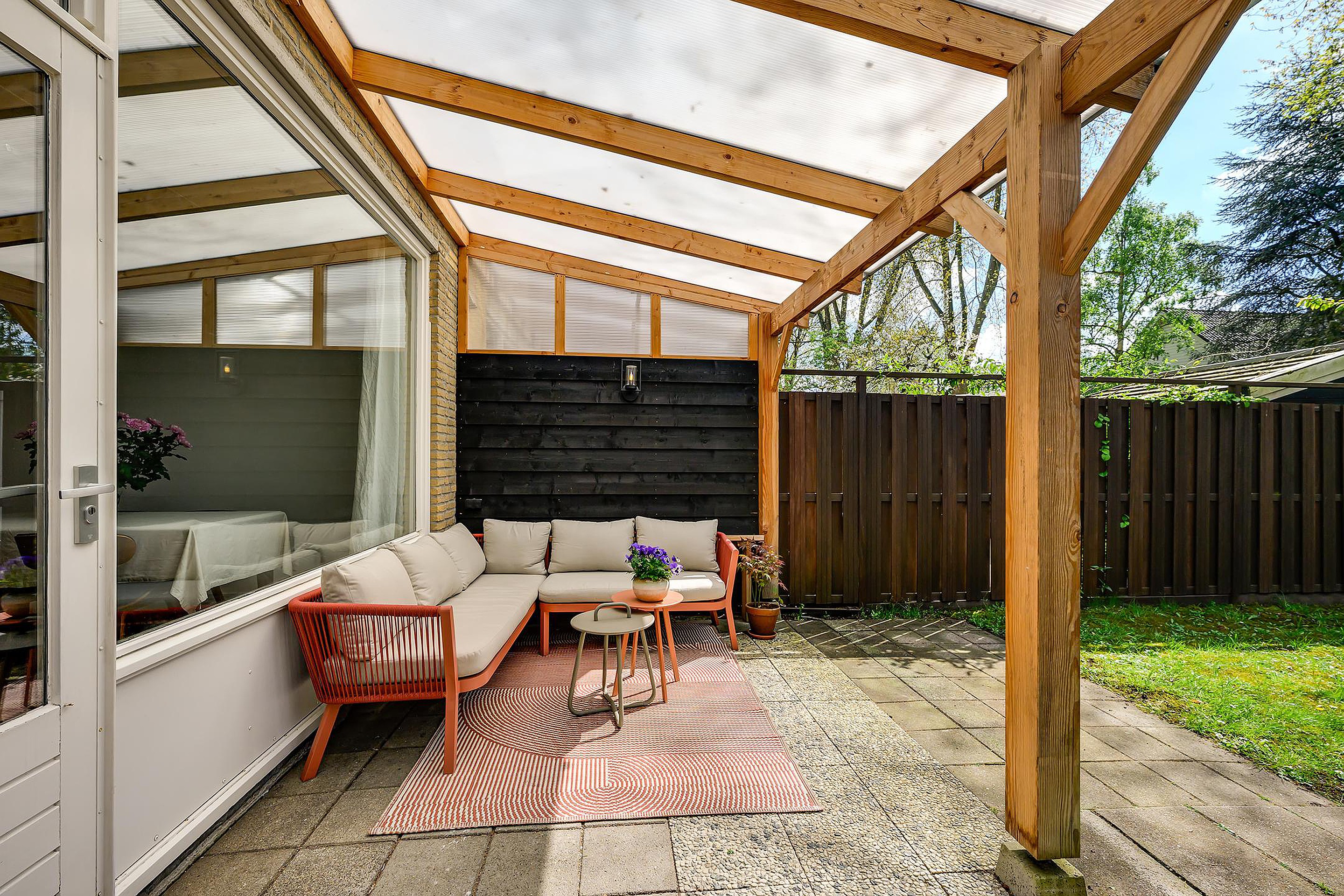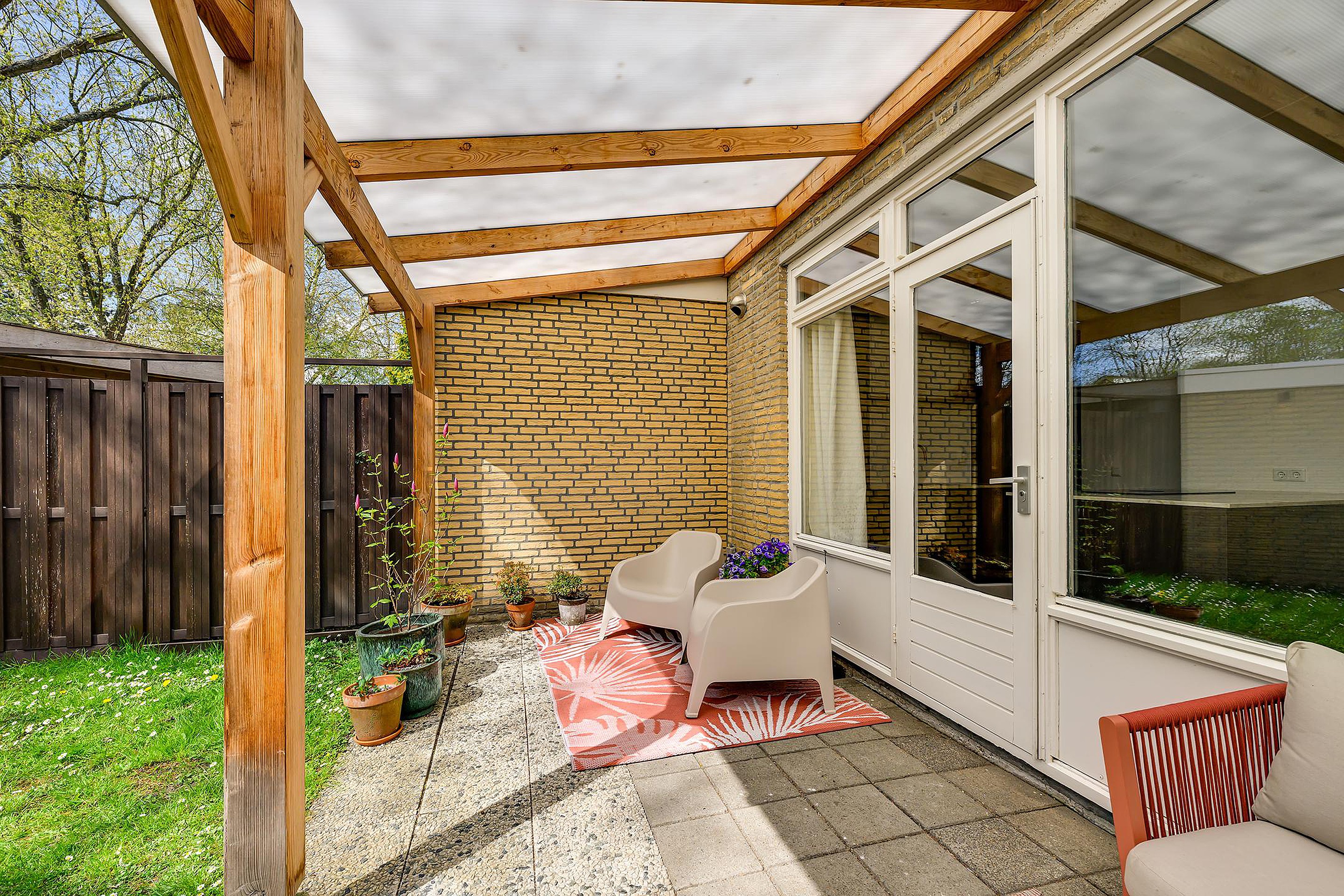 Ook buiten is het hier heerlijk wonen. De achtertuin is verzorgd aangelegd en beschikt over een fijne overkapping, waardoor je al vroeg in het voorjaar en tot laat in het seizoen comfortabel buiten kunt zitten. Verder is er een vrijstaande berging aanwezig, ideaal voor het opbergen van fietsen, gereedschap of tuinspullen.