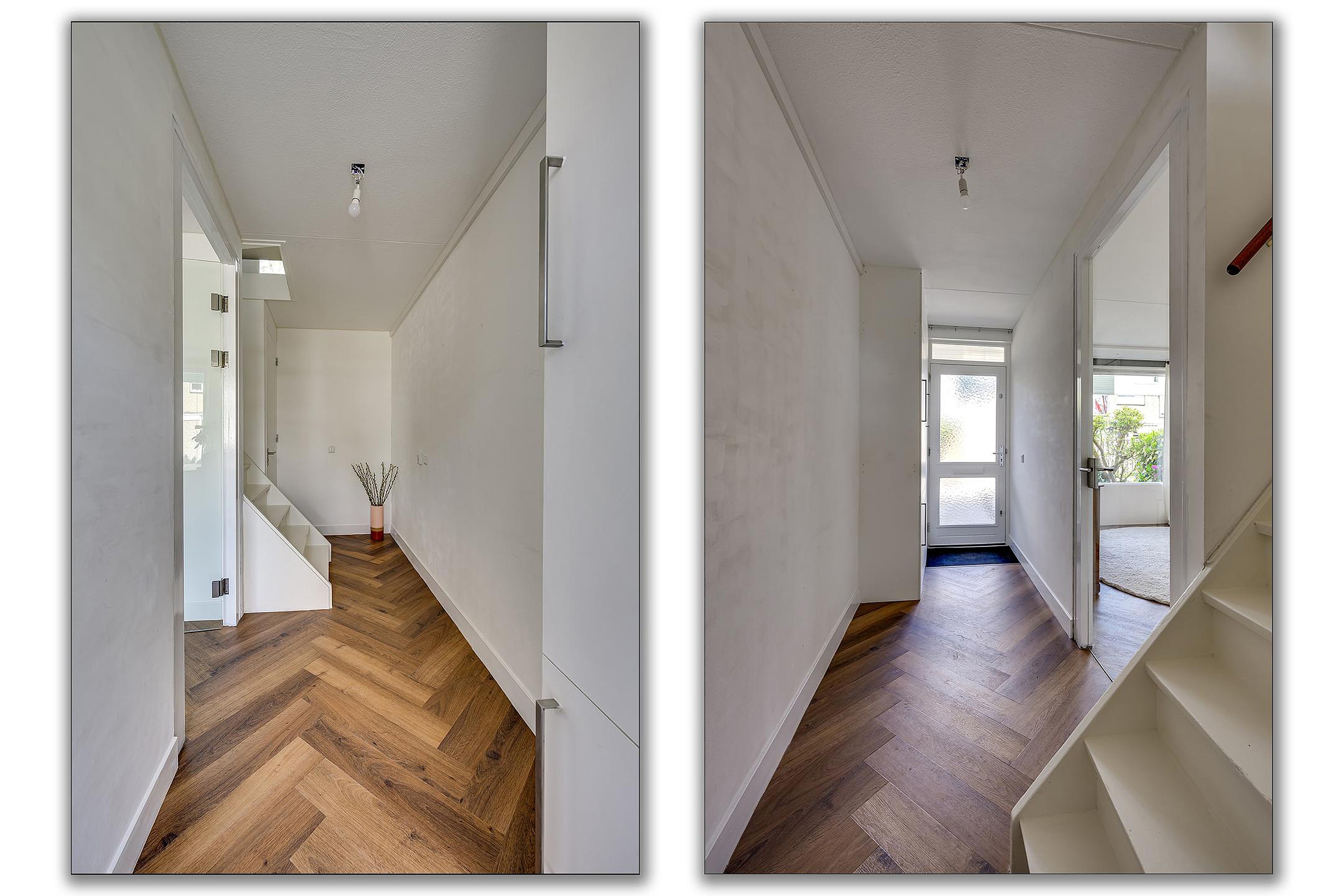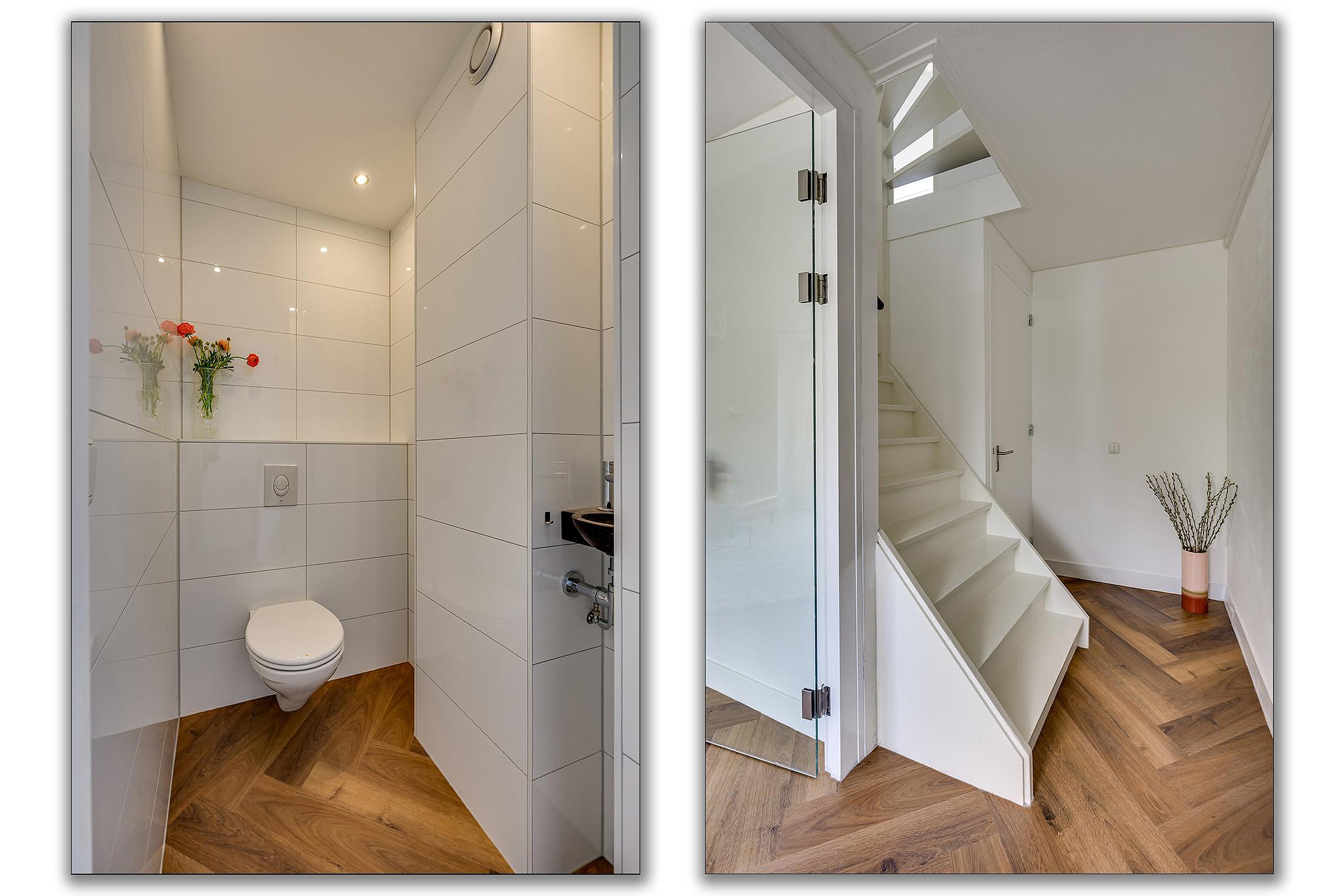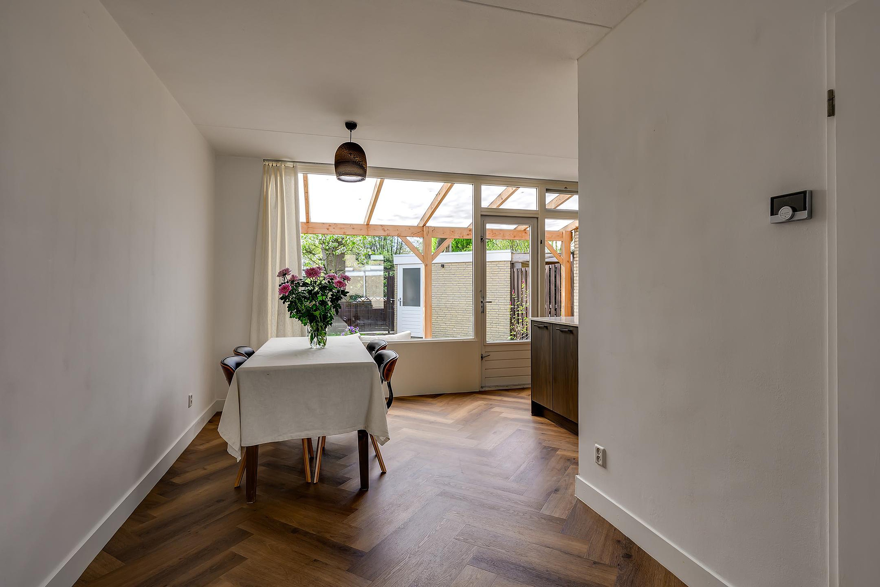 Je komt binnen in de hal met toegang tot het toilet, de vernieuwde meterkast en de trapopgang. Vanuit hier loop je door naar de ruime en lichte woonkamer. Wat direct opvalt is de strakke afwerking, de mooie visgraatvloer en het comfortabele gevoel dankzij de vloerverwarming op de begane grond. Door de grote raampartijen aan zowel de voor- als achterzijde geniet je hier van veel natuurlijk lichtinval.