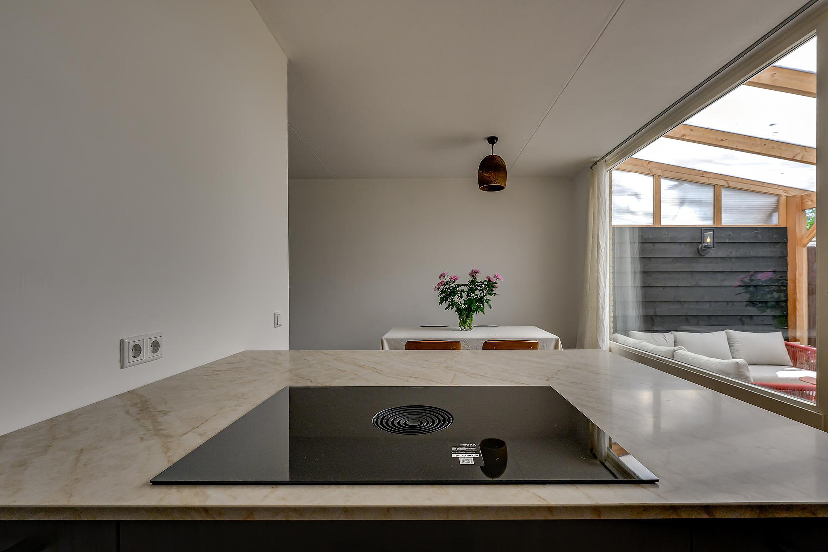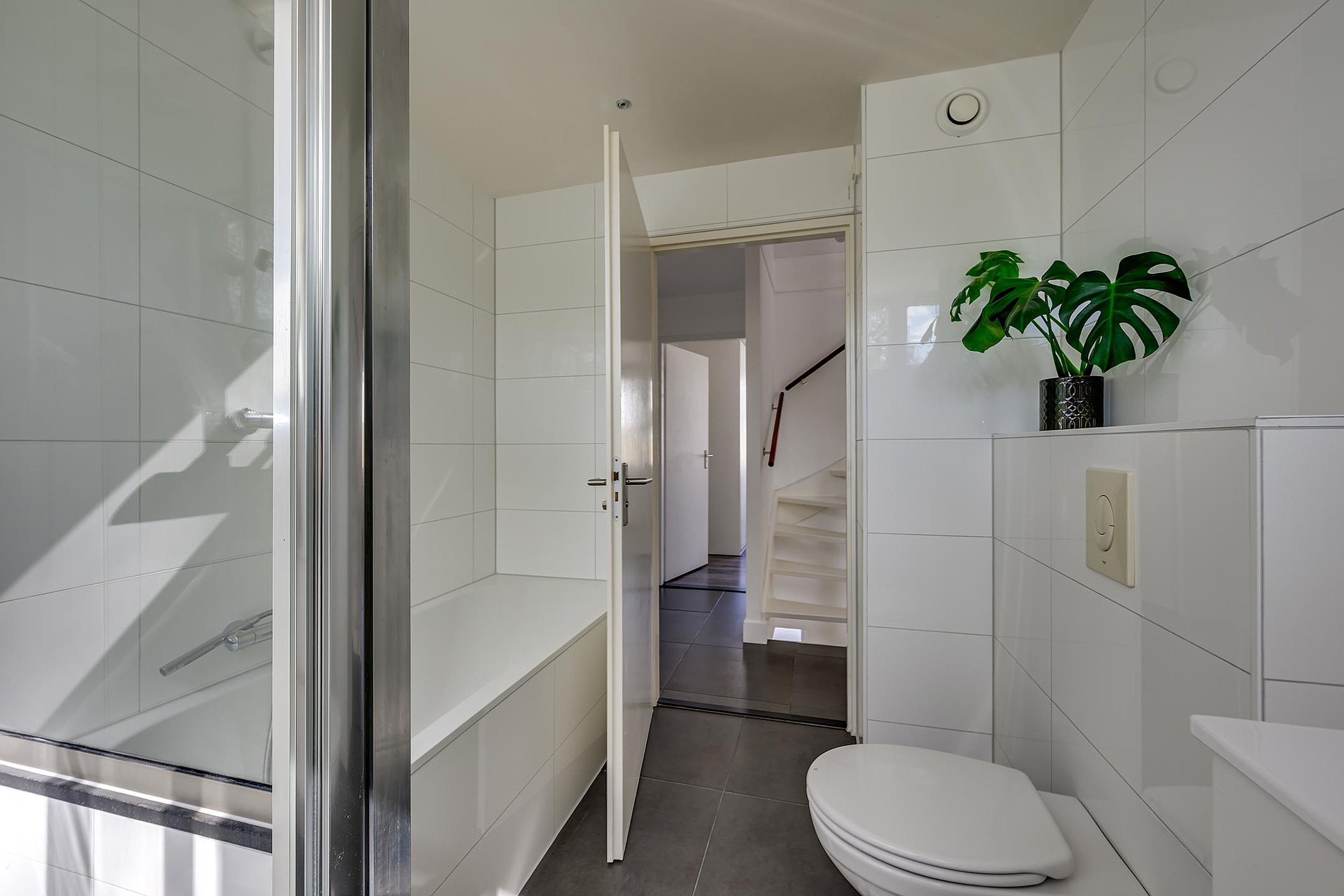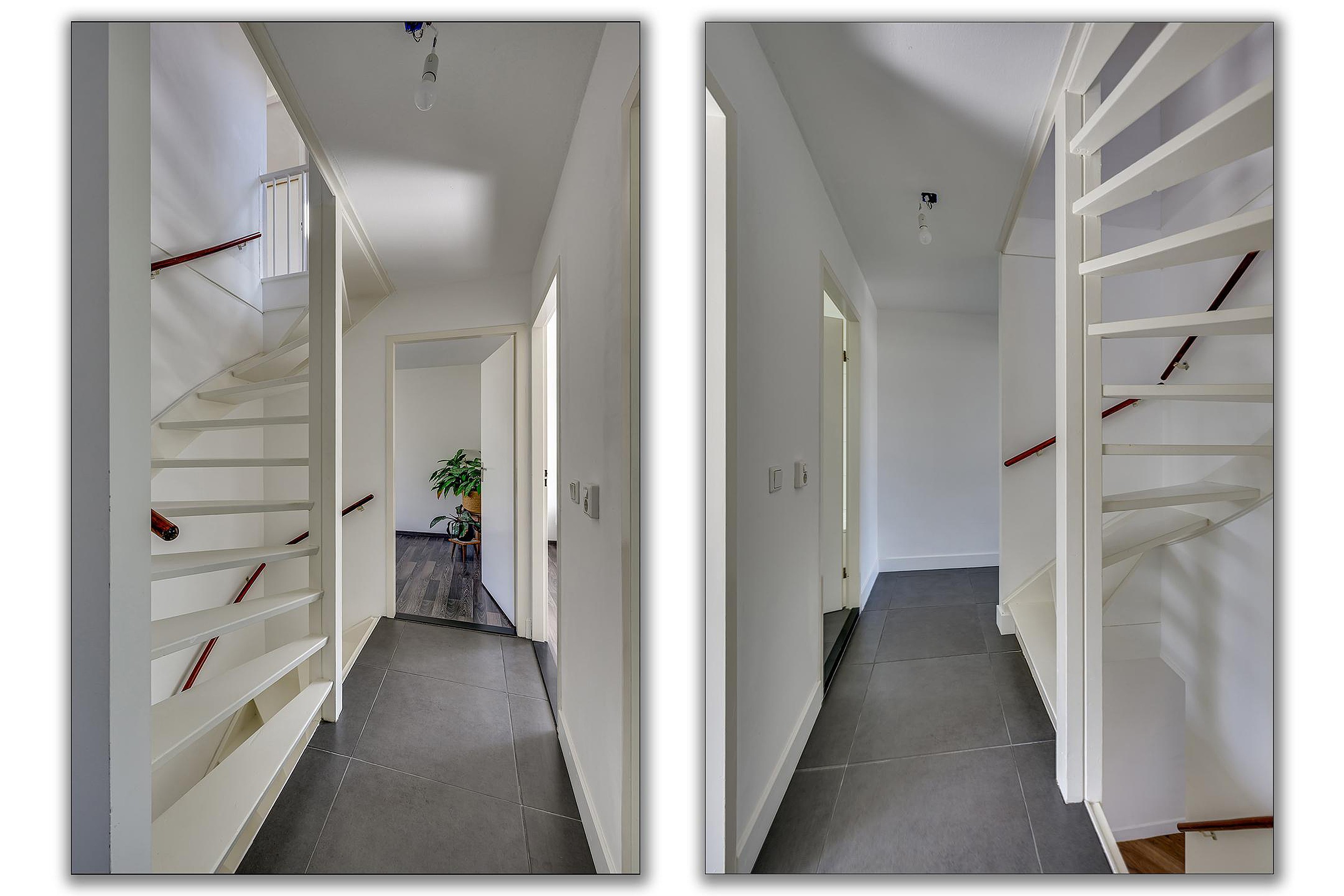 Je komt binnen in de hal met toegang tot het toilet, de vernieuwde meterkast en de trapopgang. Vanuit hier loop je door naar de ruime en lichte woonkamer. Wat direct opvalt is de strakke afwerking, de mooie visgraatvloer en het comfortabele gevoel dankzij de vloerverwarming op de begane grond. Door de grote raampartijen aan zowel de voor- als achterzijde geniet je hier van veel natuurlijk lichtinval.