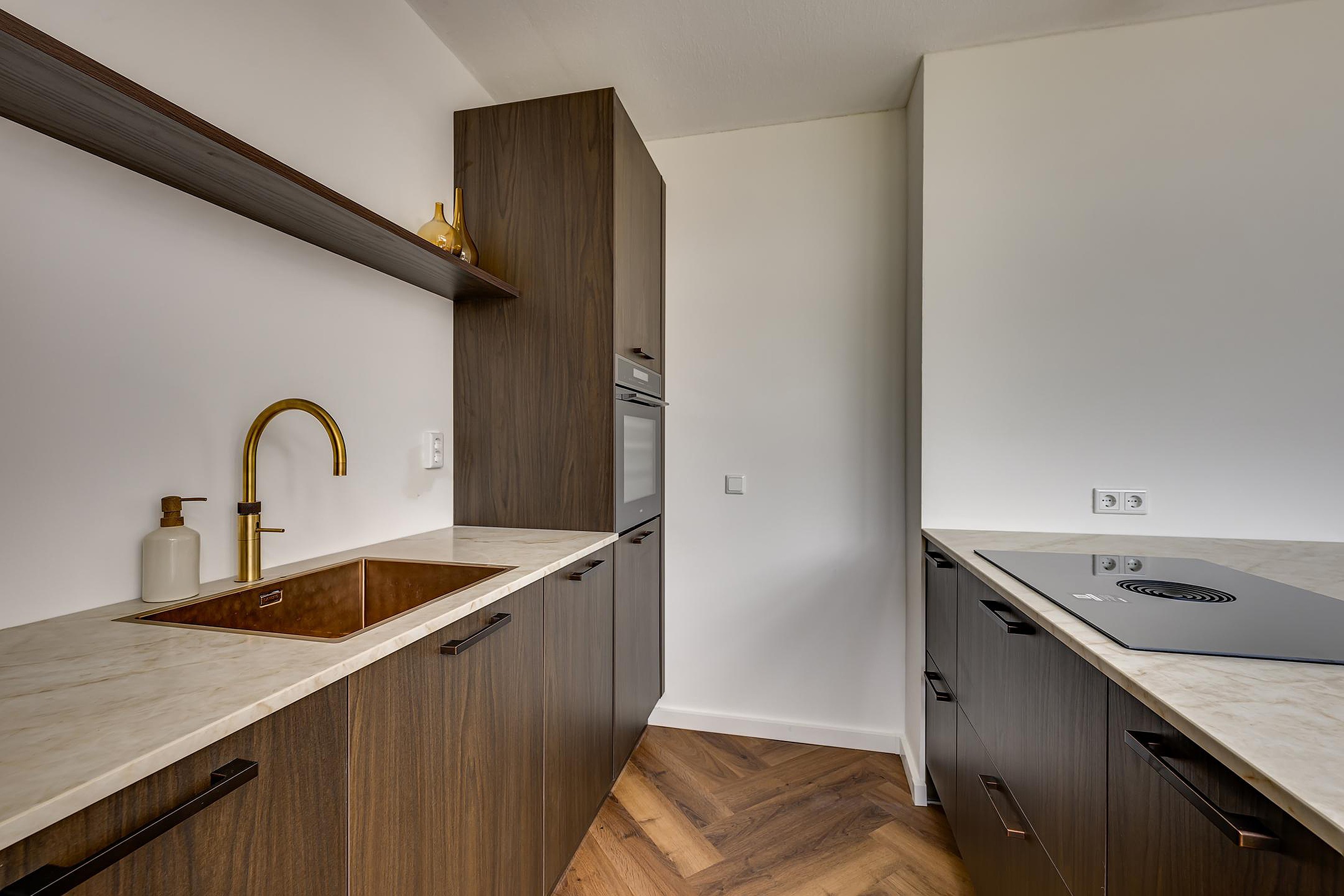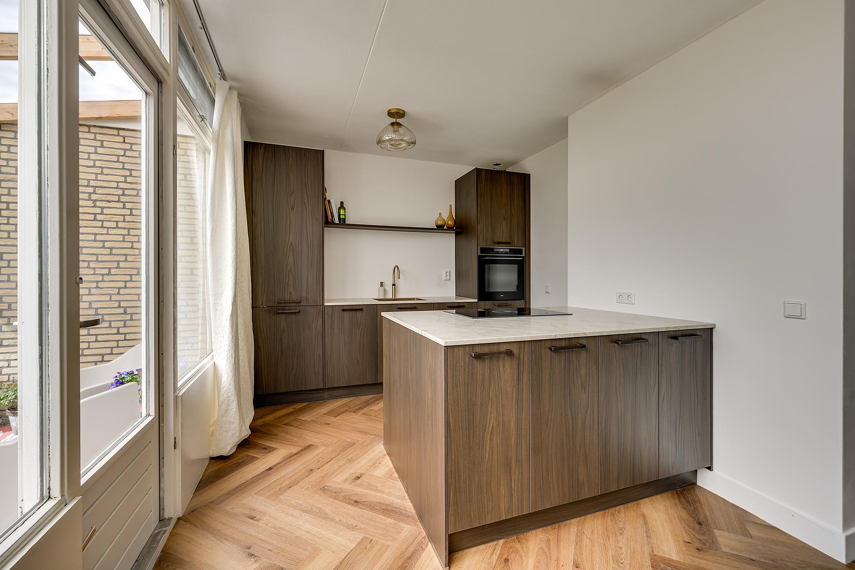 Aan de achterzijde van de woning bevindt zich de luxe keuken met kookeiland, echt een heerlijke plek waar koken en samenzijn centraal staan. De keuken is modern uitgevoerd en van alle gemakken voorzien, waaronder een inductiekookplaat, Quooker, vaatwasser, koelkast, vriezer en combi-oven. Daarnaast is er volop werk- en bergruimte aanwezig.