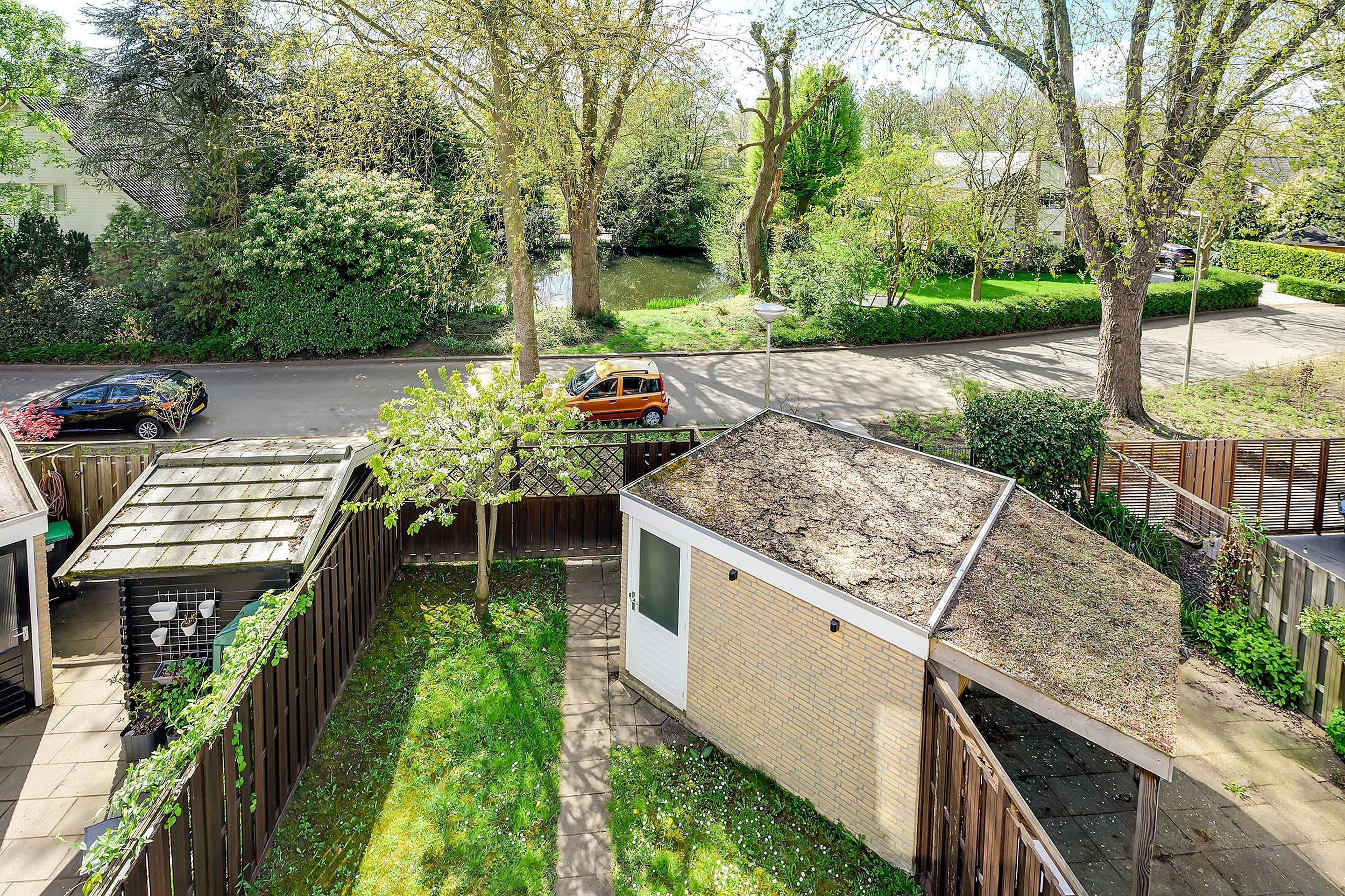 8. Fijne, verzorgde achtertuin met overkapping en vrijstaande berging, met een prachtig vrij uitzicht op de vijver.;