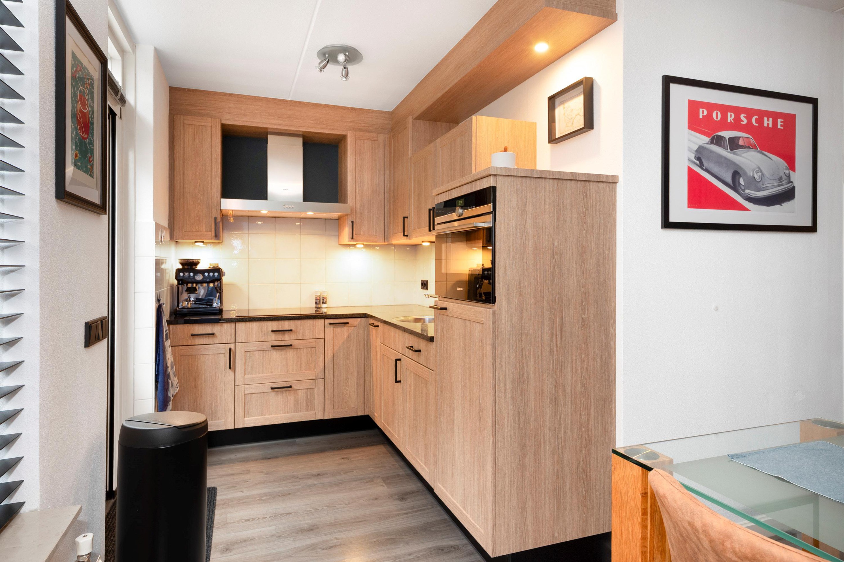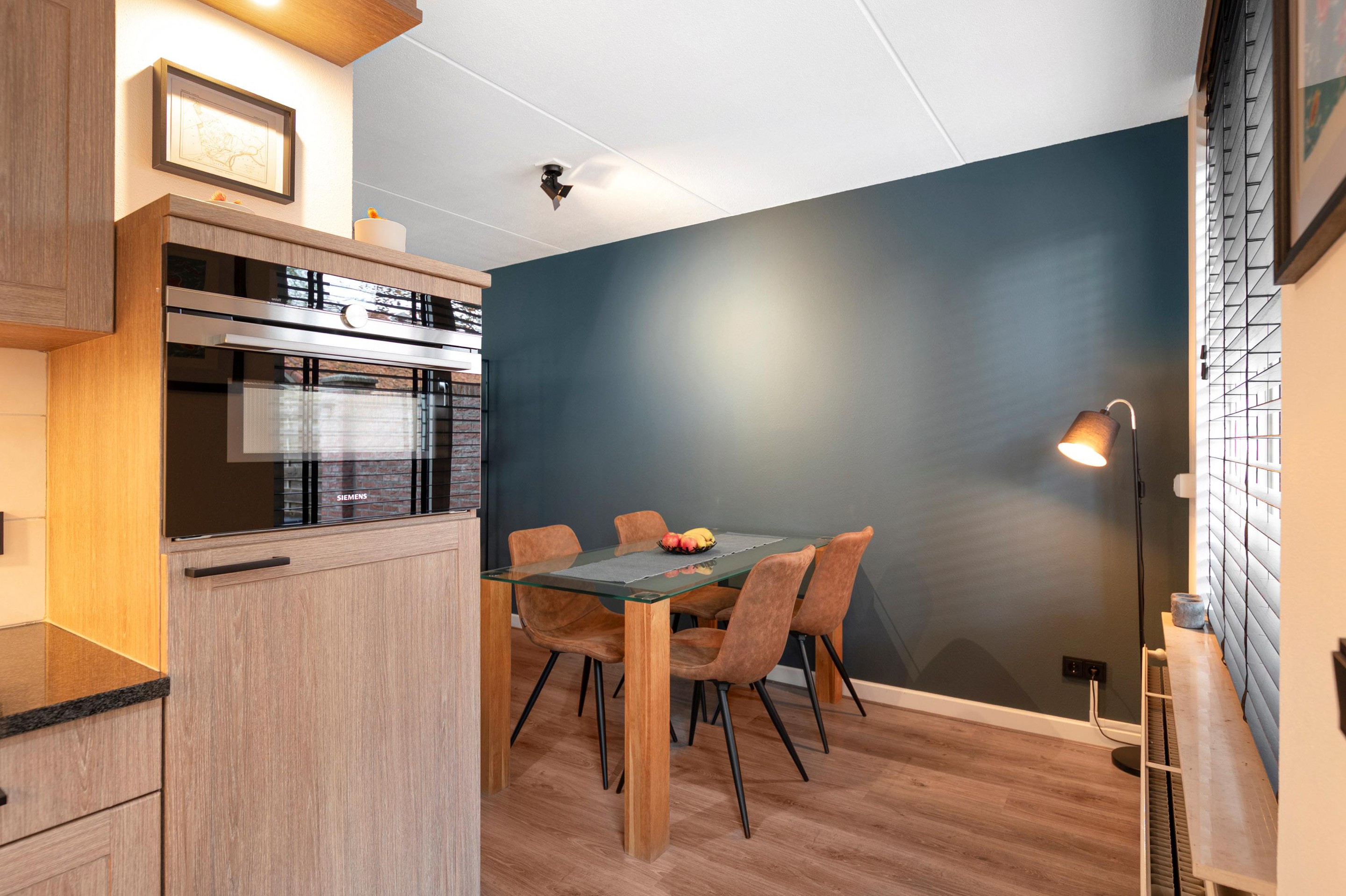De woning heeft een frisse uitstraling en biedt op de begane grond een lichte en sfeervolle woon-/eetkamer, met open verbinding naar een smaakvolle, moderne keuken. De apparatuur; inductiekookplaat, afzuigkap, koelkast, combi-oven en een vaatwasser met Home Connect.
