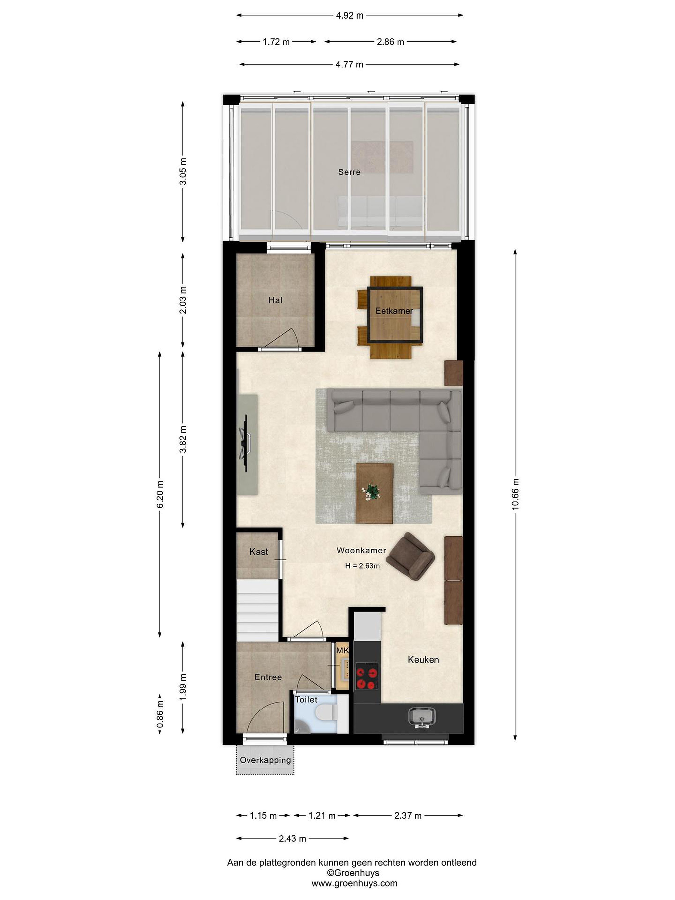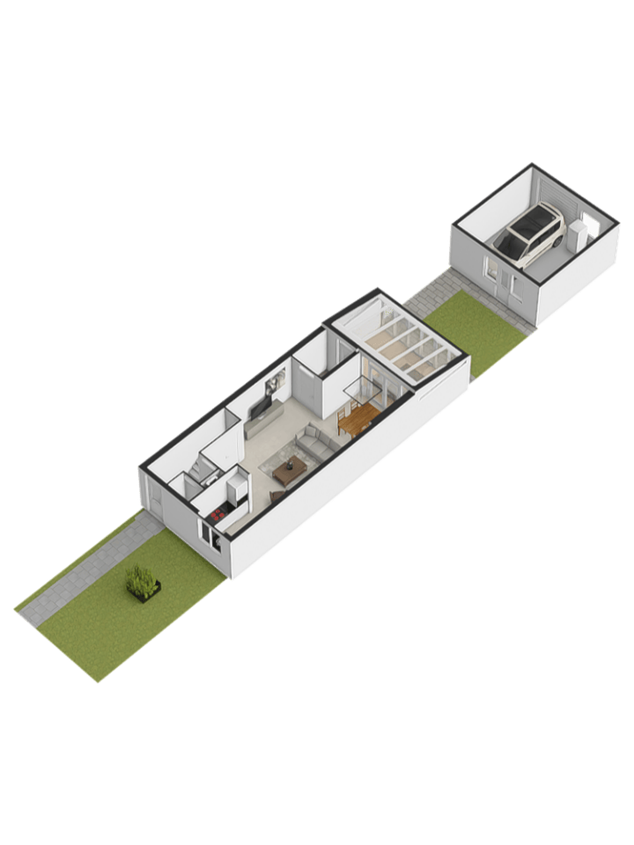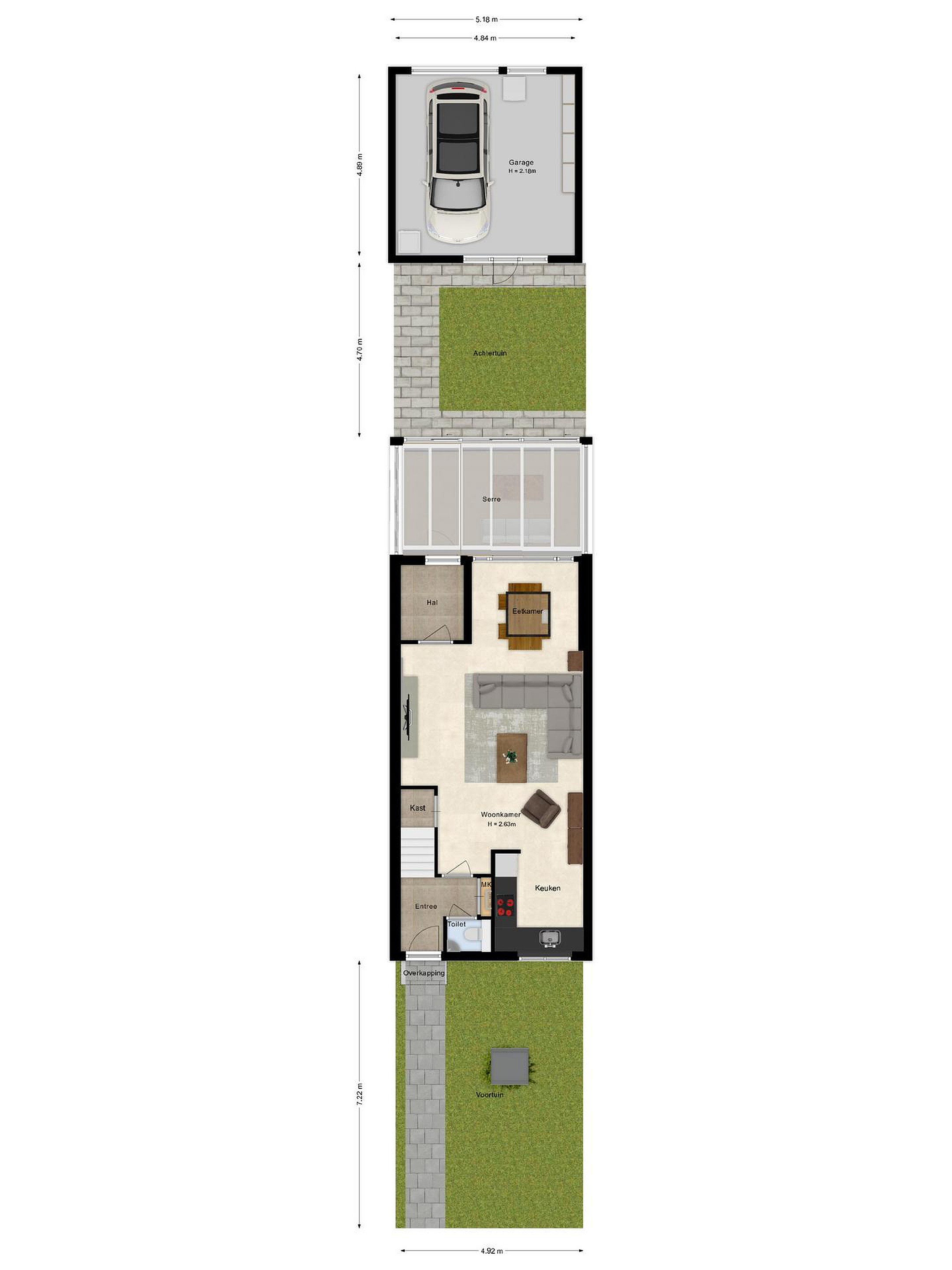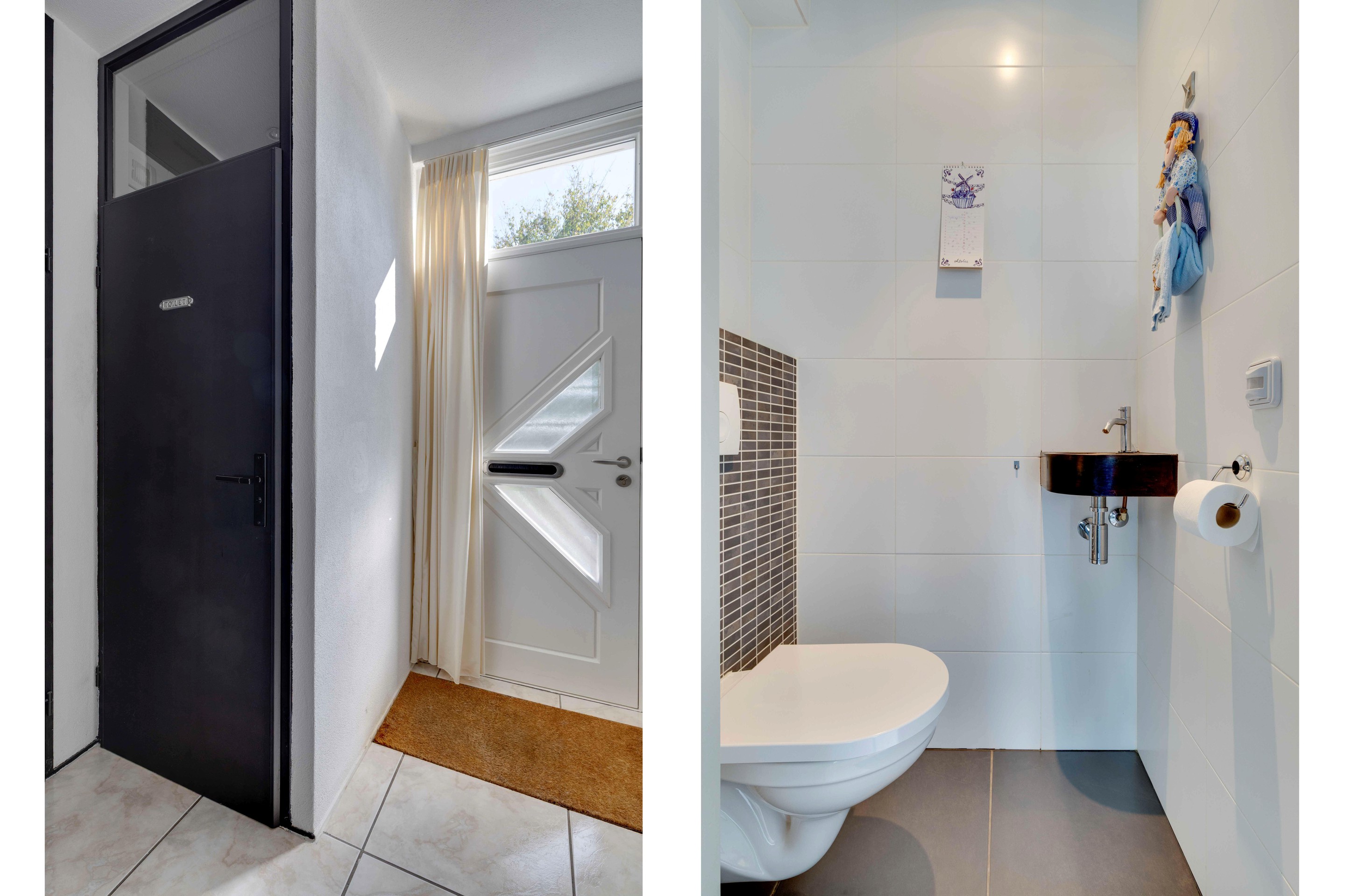 De diepe, recent gerenoveerde voortuin is onderhoudsvriendelijk aangelegd met kunstgras en sierbestrating. Via de voordeur betreedt u de hal met toegang tot de woonkamer, de trapopgang, het moderne toilet en de meterkast.