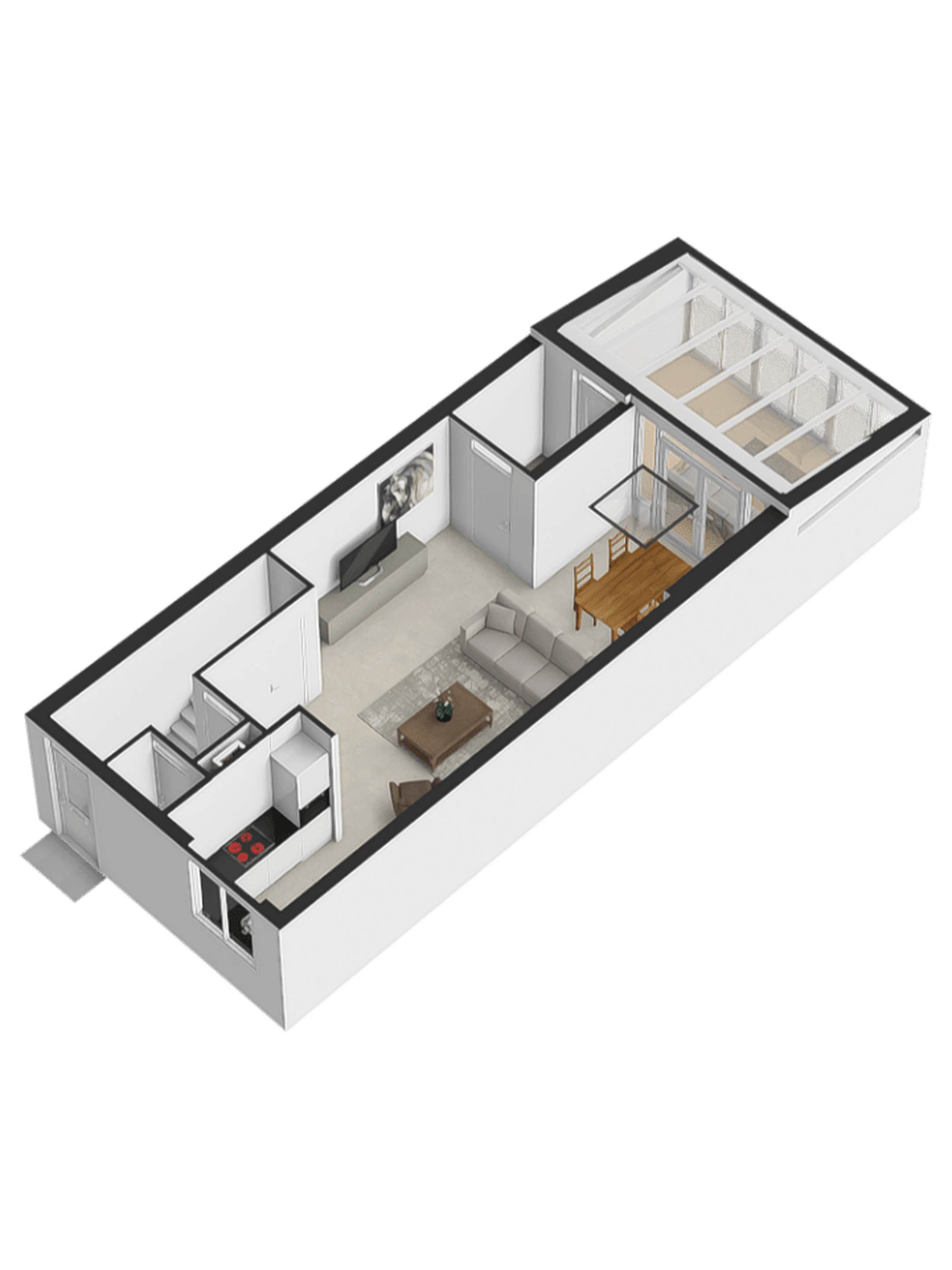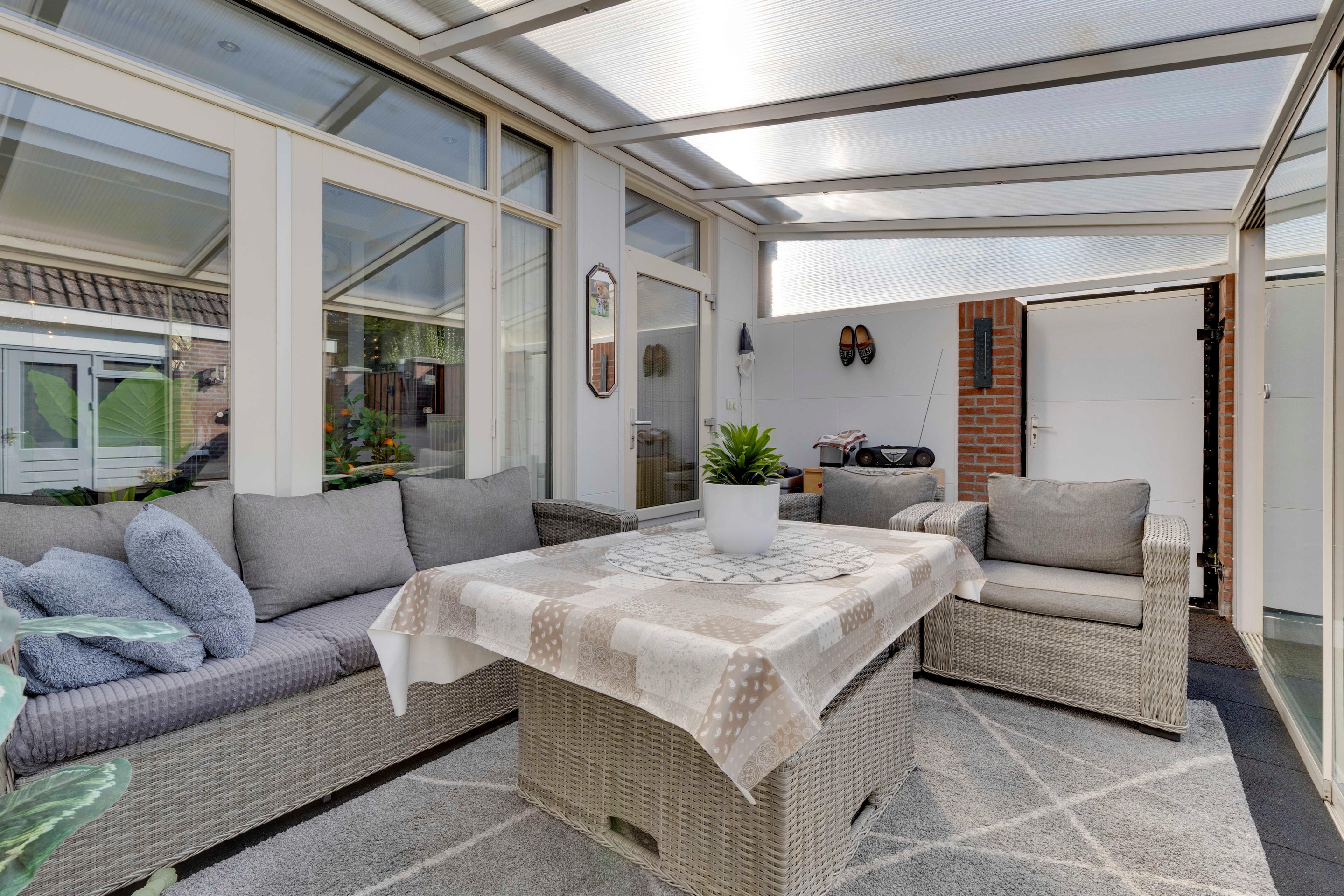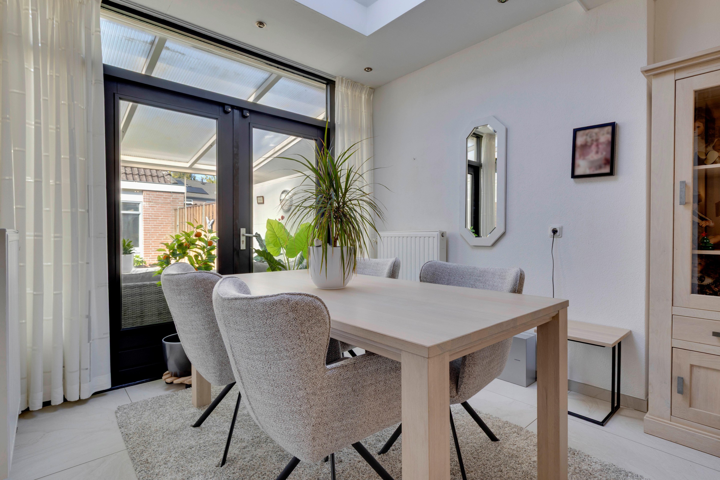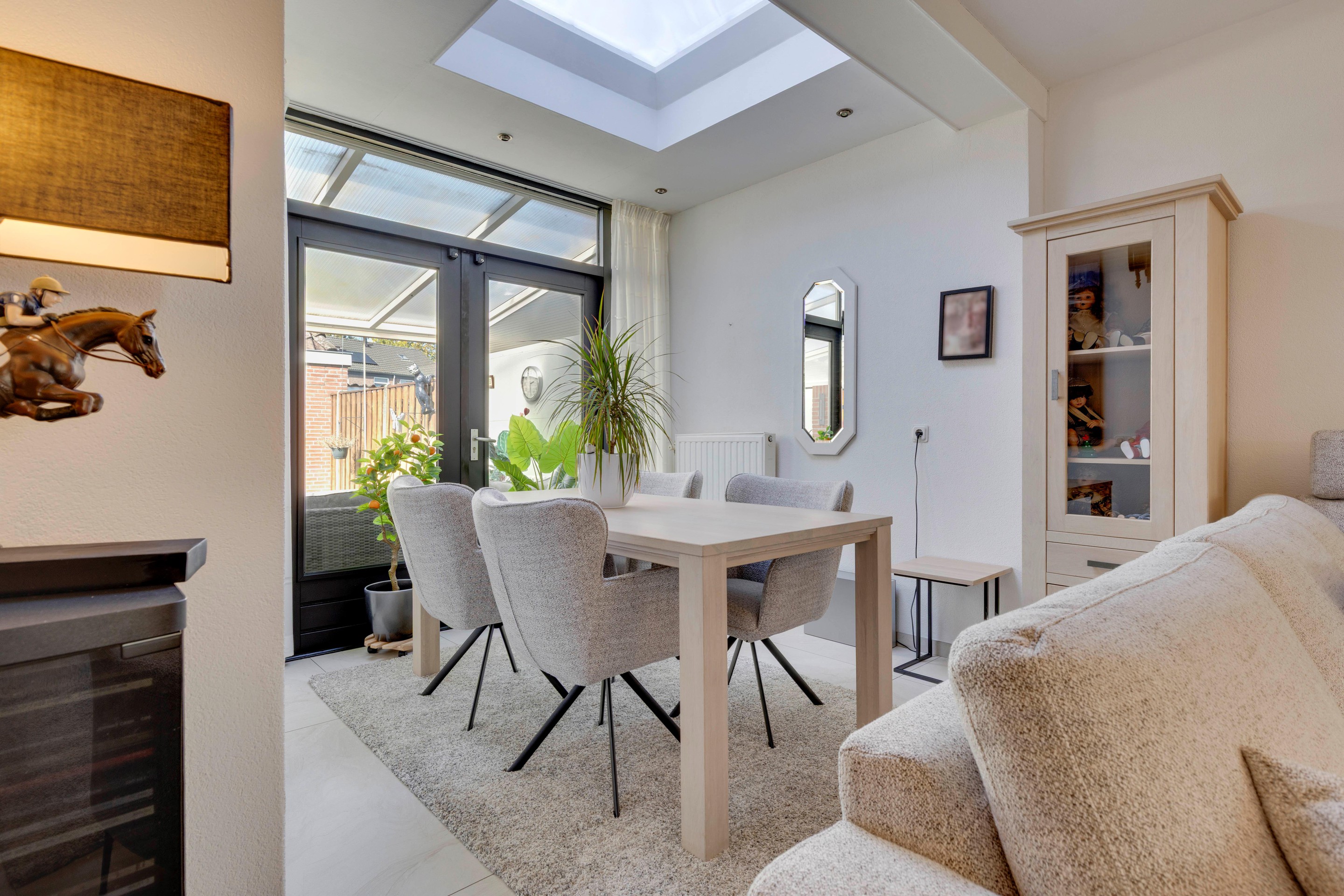 Aan de achterzijde bevindt zich de eetkamer met openslaande tuindeuren naar de tuin. Dankzij de lichtkoepel komt hier veel natuurlijk daglicht binnen. Aansluitend is de ruime serre/tuinkamer, voorzien van glazen schuifwanden, inbouwspots en elektrisch bedienbare zonwering: een ideale plek om bijna het hele jaar door van de tuin te genieten.