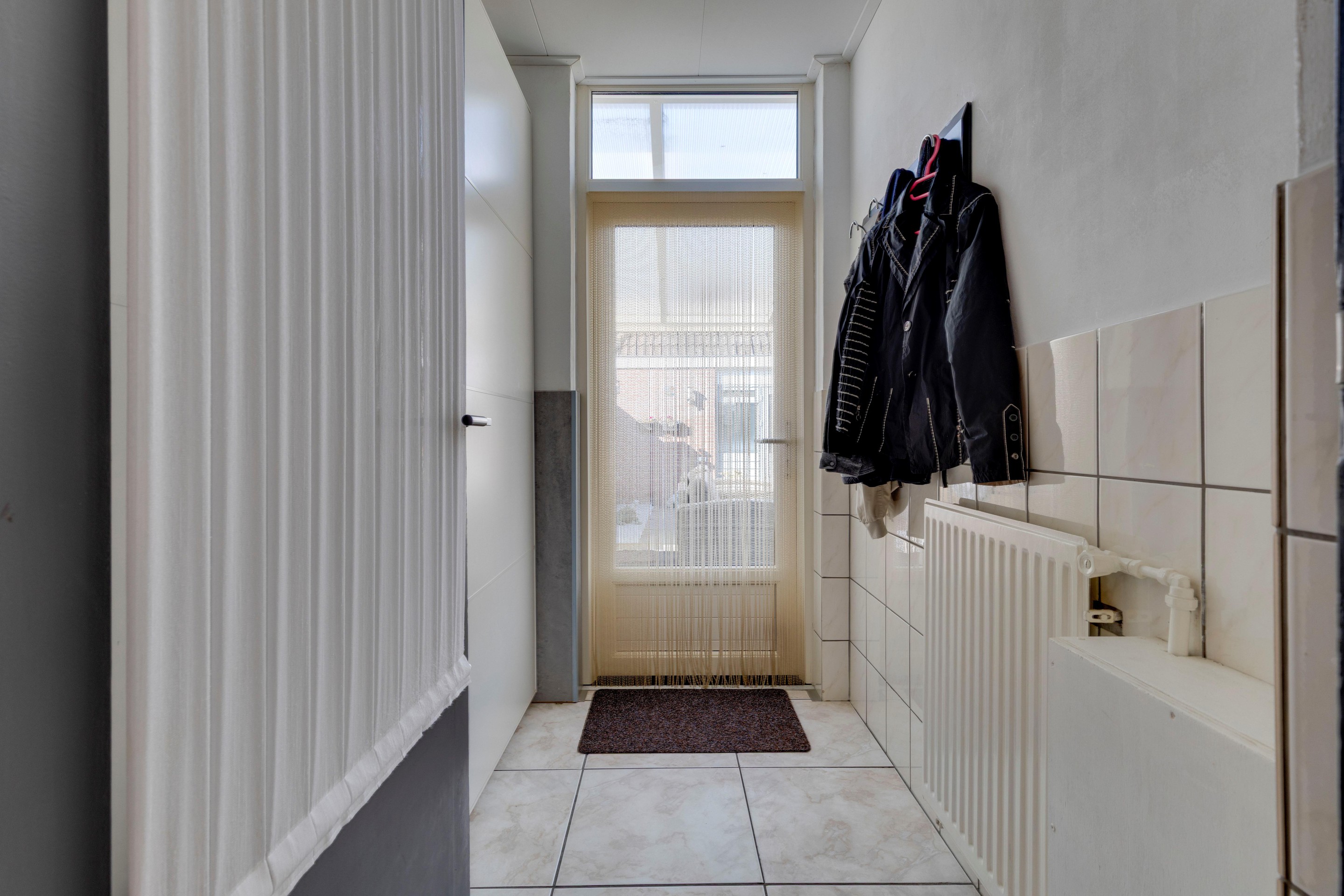 Een portaal met schuifkastenwand biedt toegang tot de achtertuin.