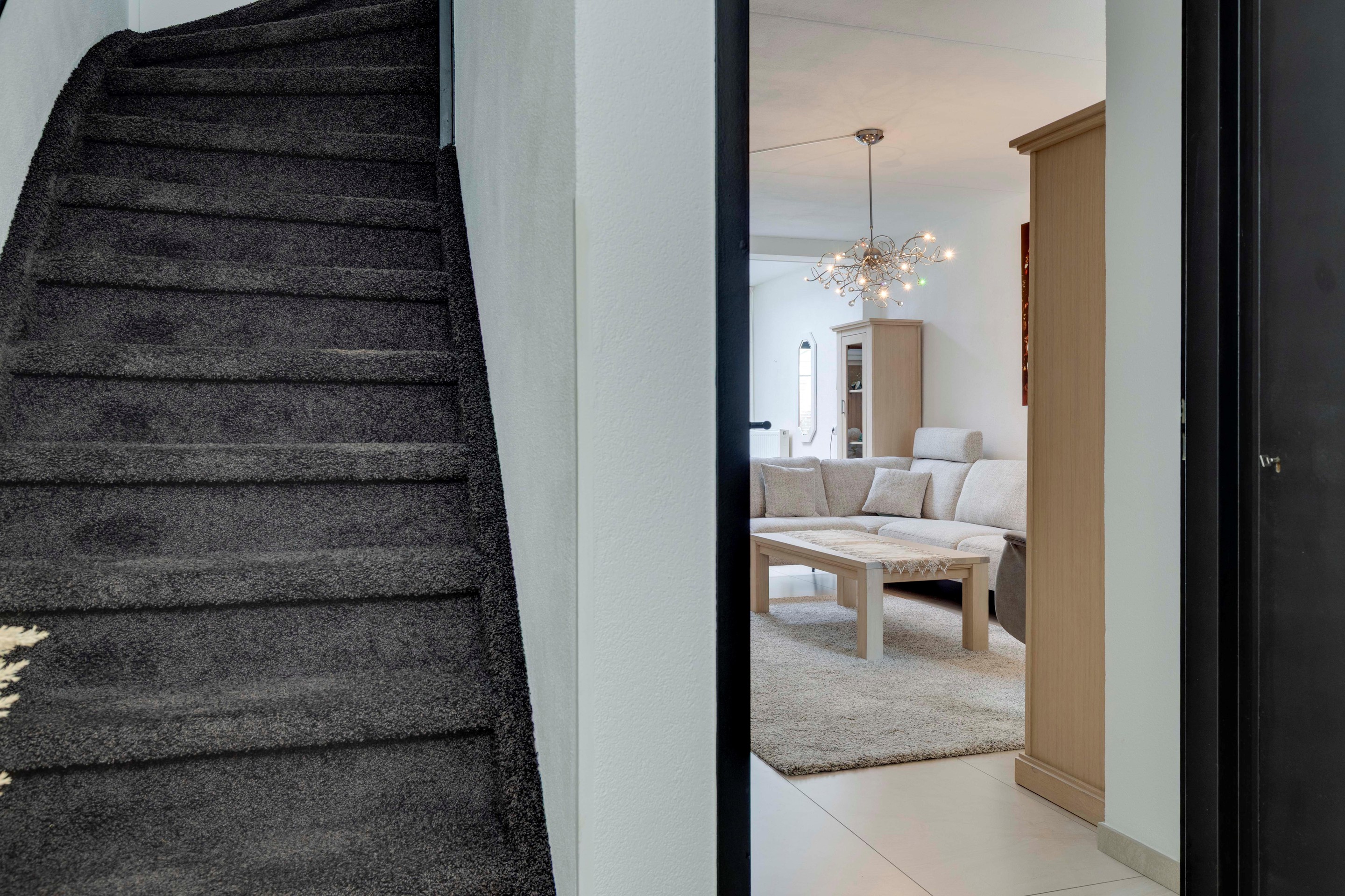 De ruime woonkamer is uitgebouwd aan de achterzijde, voorzien van een lichte tegelvloer, strak stucwerk op de wanden en een plafond met spuitwerk. De airconditioning (2021) zorgt hier voor een aangenaam binnenklimaat, net als in de master bedroom. Een praktische trapkast biedt extra bergruimte.