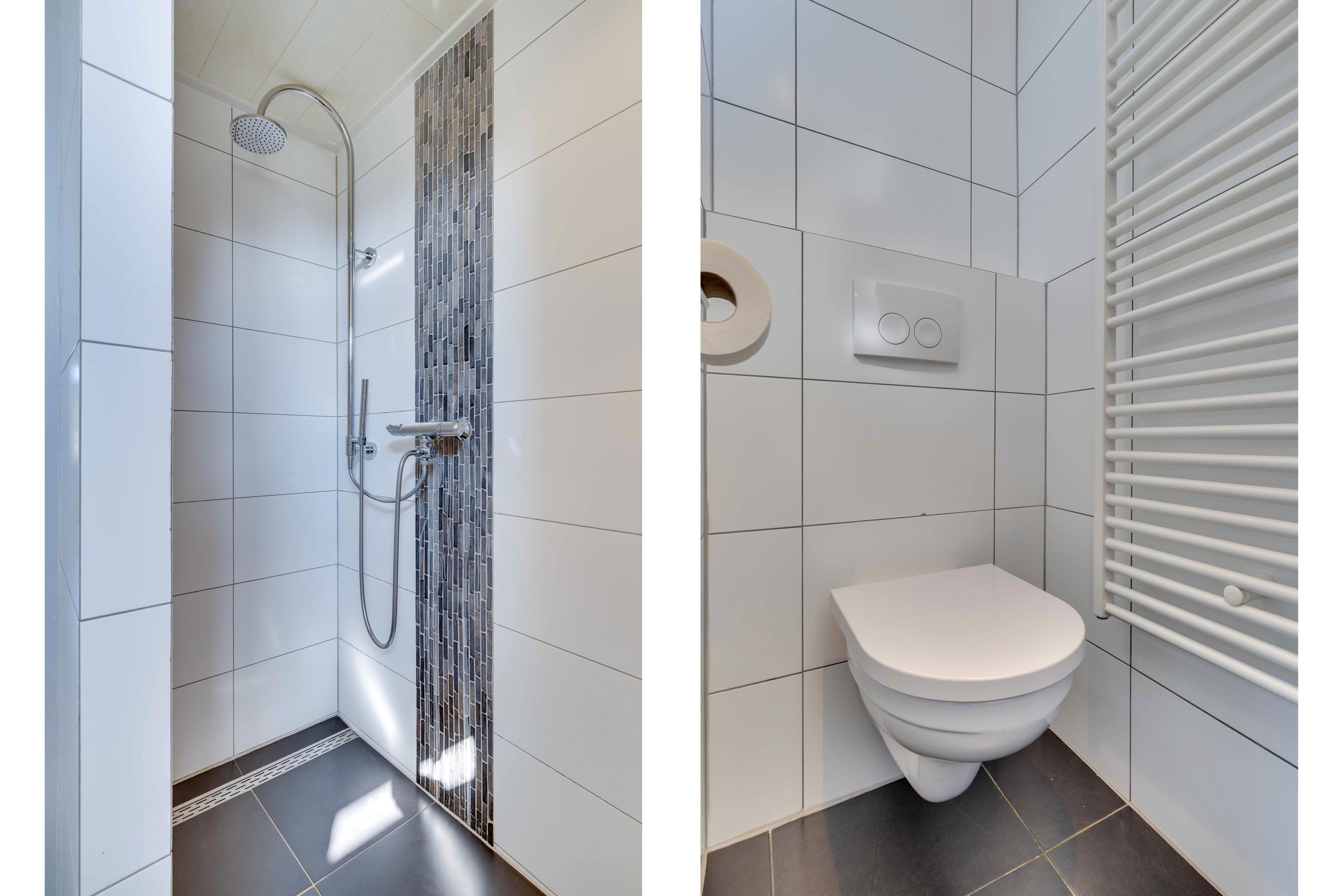 Het toilet is in lichte kleurstelling uitgevoerd, volledig betegeld tot aan het plafond, voorzien van een vrijhangend closet, fonteintje en mechanische ventilatie.