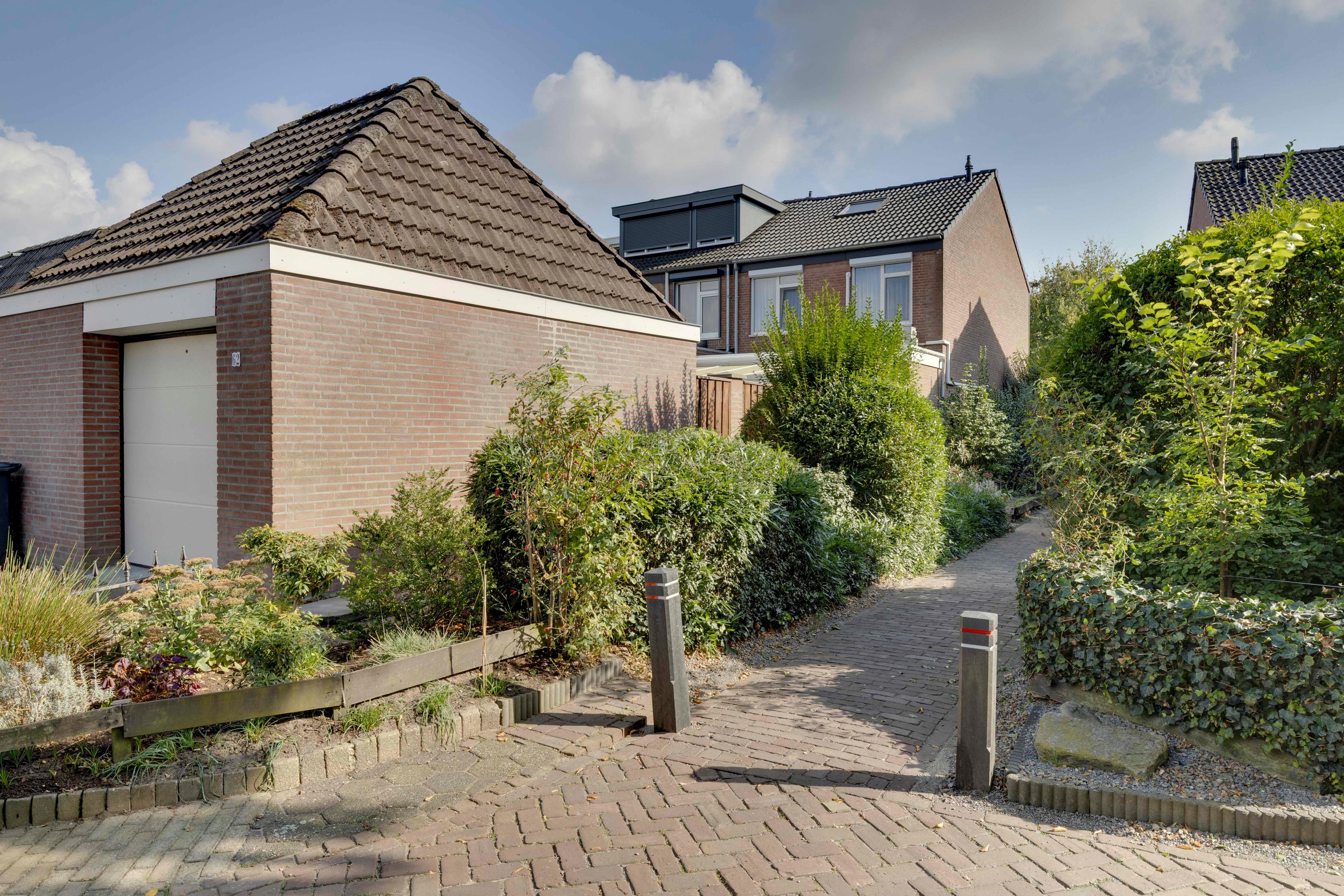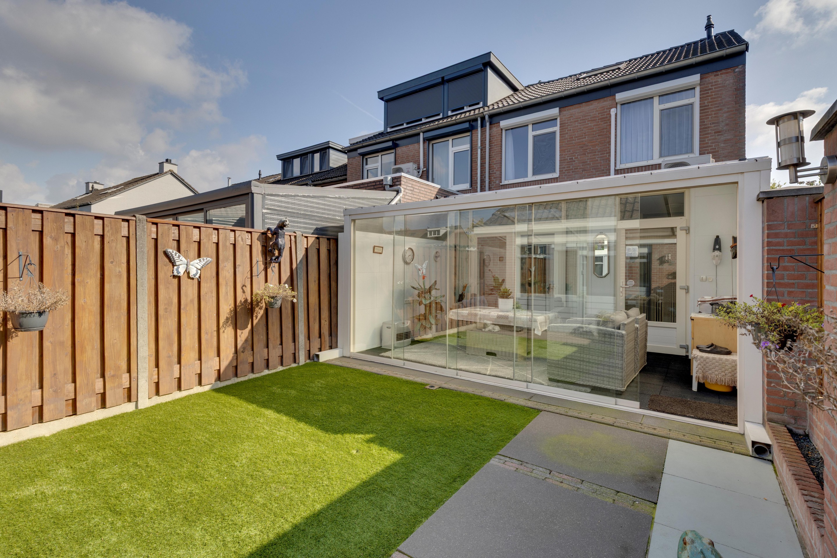 De achtertuin is onderhoudsvriendelijk ingericht met sierbestrating, kunstgrasgazon, een buitenkraan en een vrije achterom.