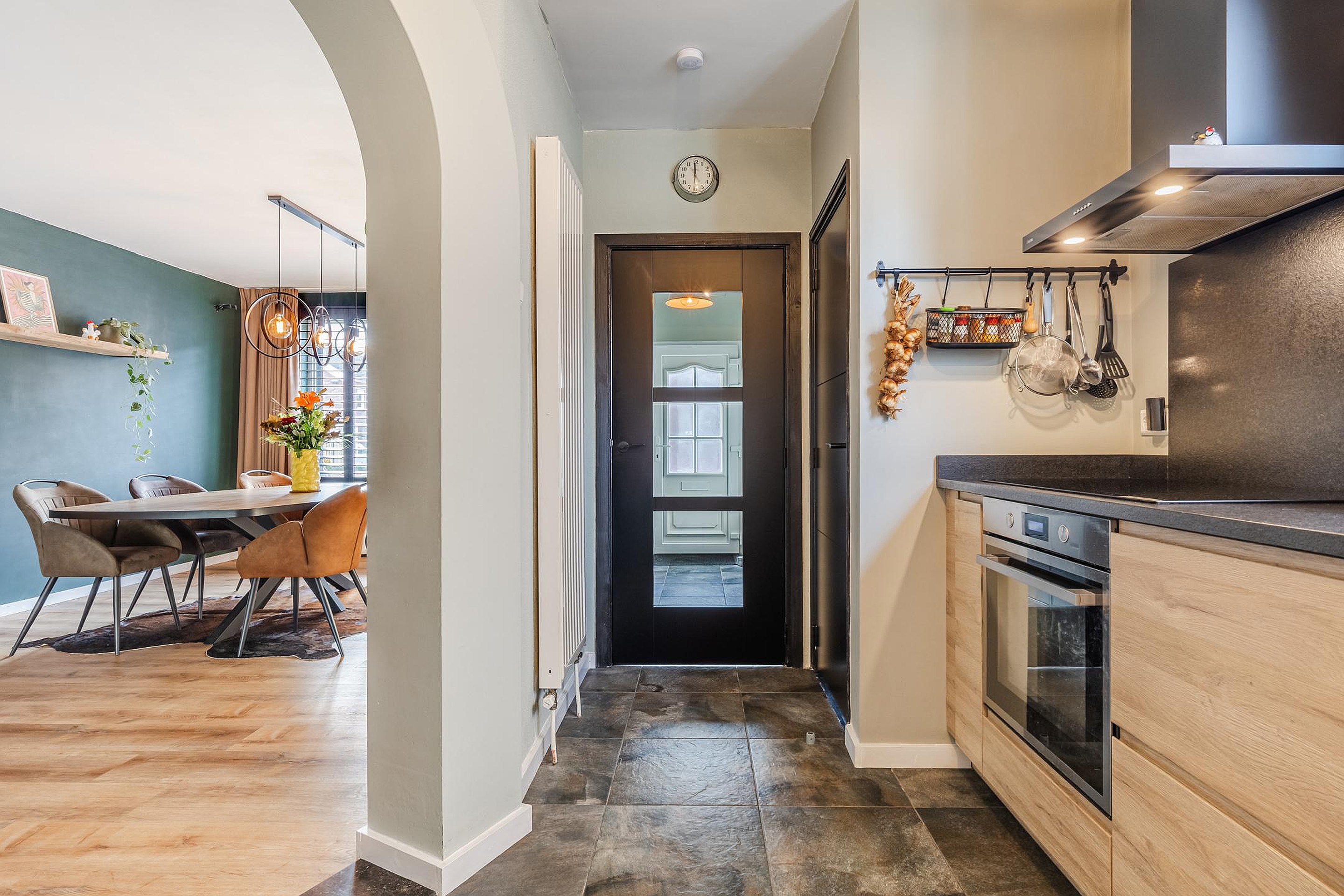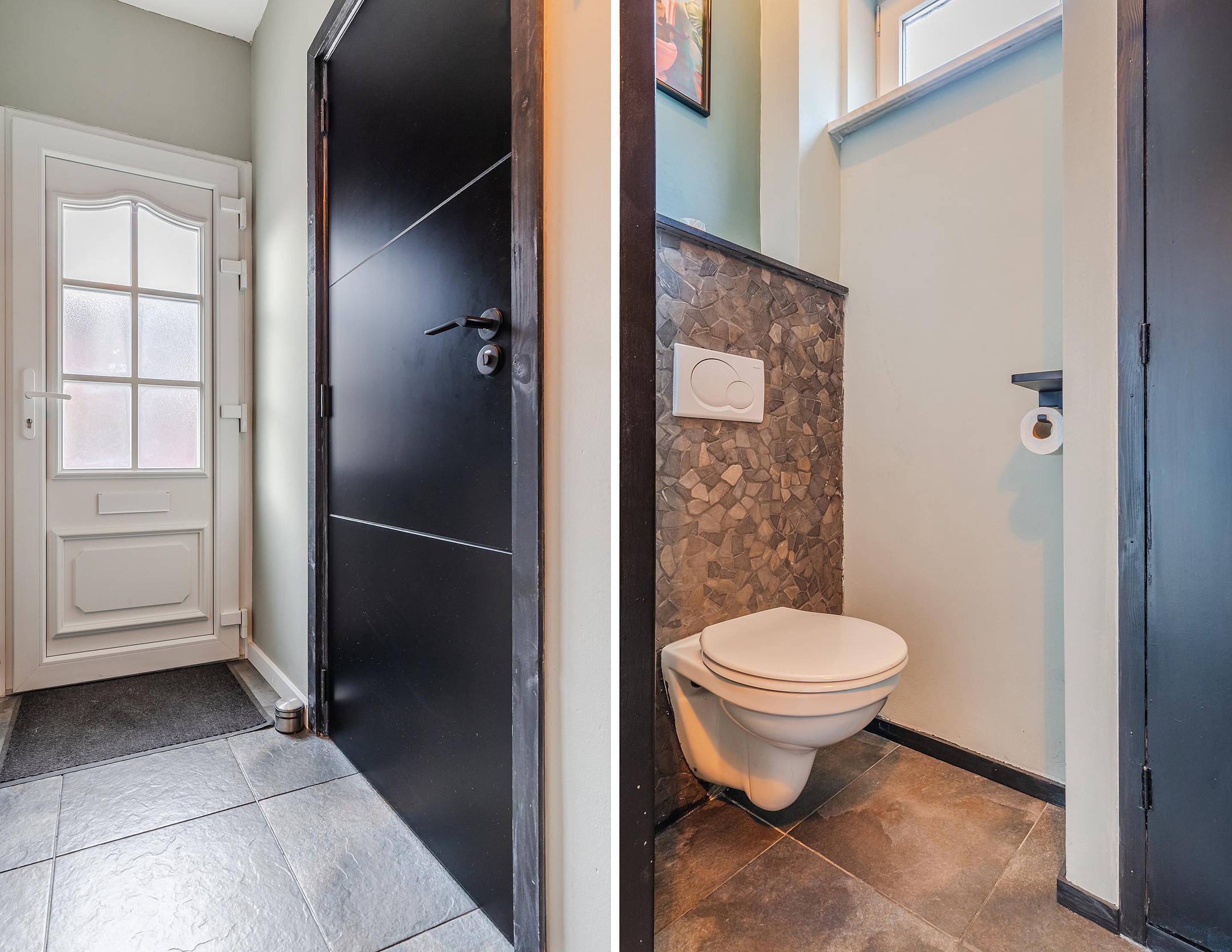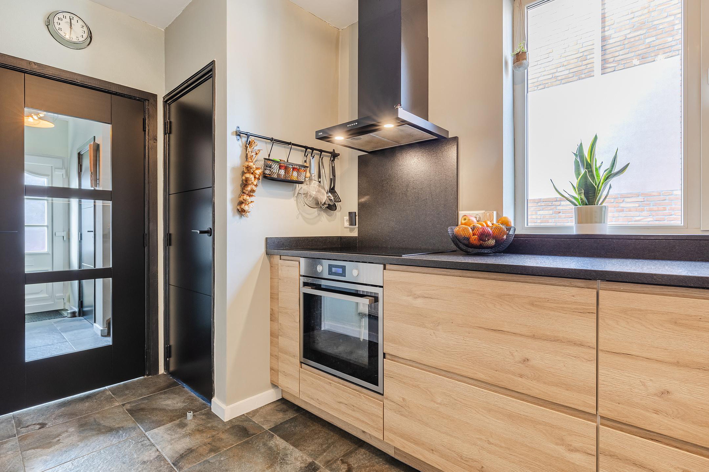 De entree/ hal geeft toegang tot de toiletruimte, de trapopgang naar de 1e verdieping en de semi-open keuken. De toiletruimte is voorzien van een zwevend closet en fonteintje. De semi-open keuken (ca. 10m2) is in 2024 vernieuwd en is ingericht met een inductiekookplaat, afzuigkap, combi-oven, vaatwasser, koelkast met diepvriesvak en een granieten aanrechtblad. Vanuit de keuken is er zicht op de oprit. Middels een open doorgang is er toegang tot de royale woonkamer. De woonkamer is aan de achterzijde uitgebouwd en is in totaal ca. 45m2 groot. De woonkamer is in 2024 voorzien van een nieuwe pvc vloer. In de aanbouw is de airconditioning gesitueerd. De grote schuifpui zorgt voor optimaal tuincontact en veel natuurlijk lichtinval.