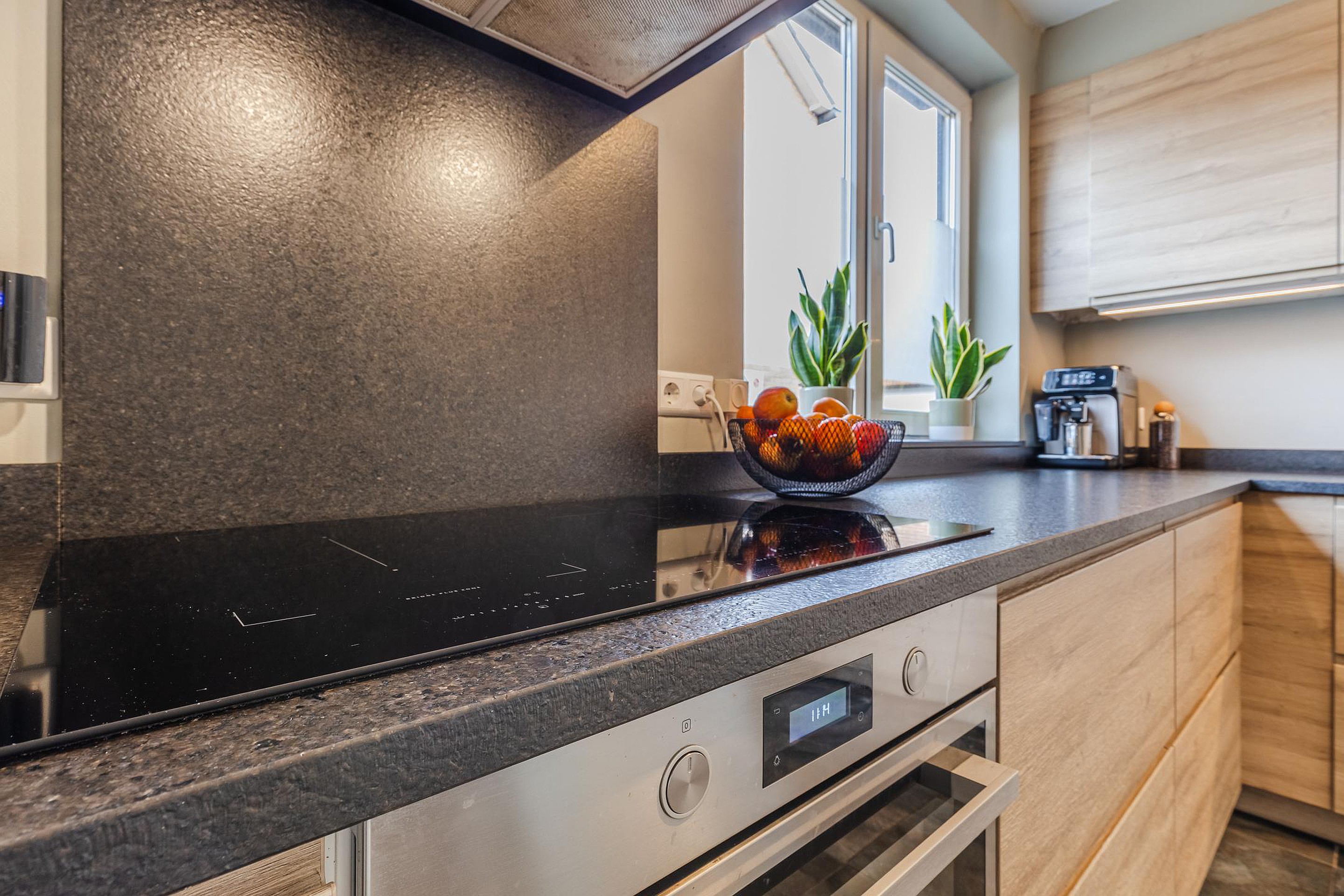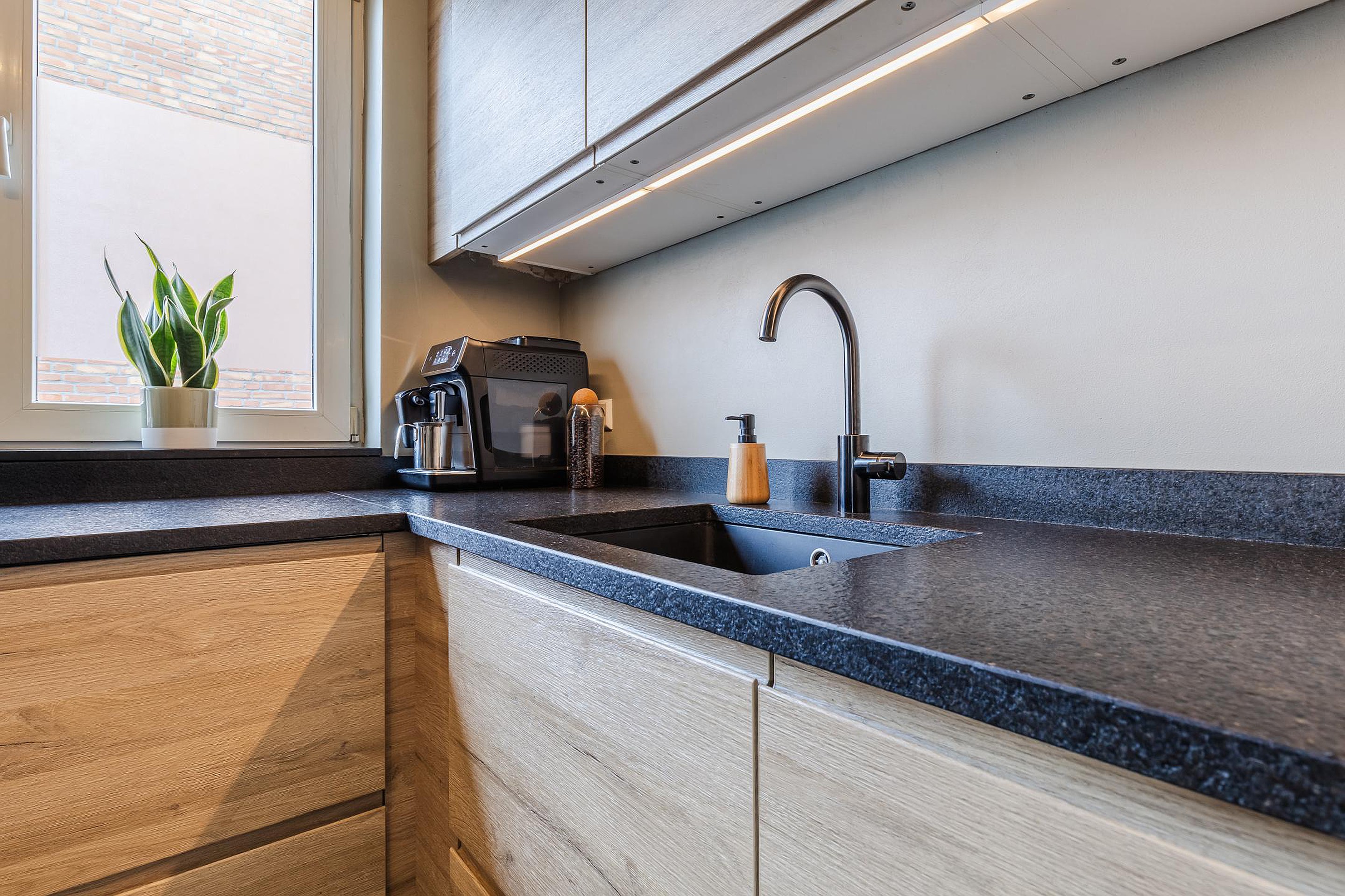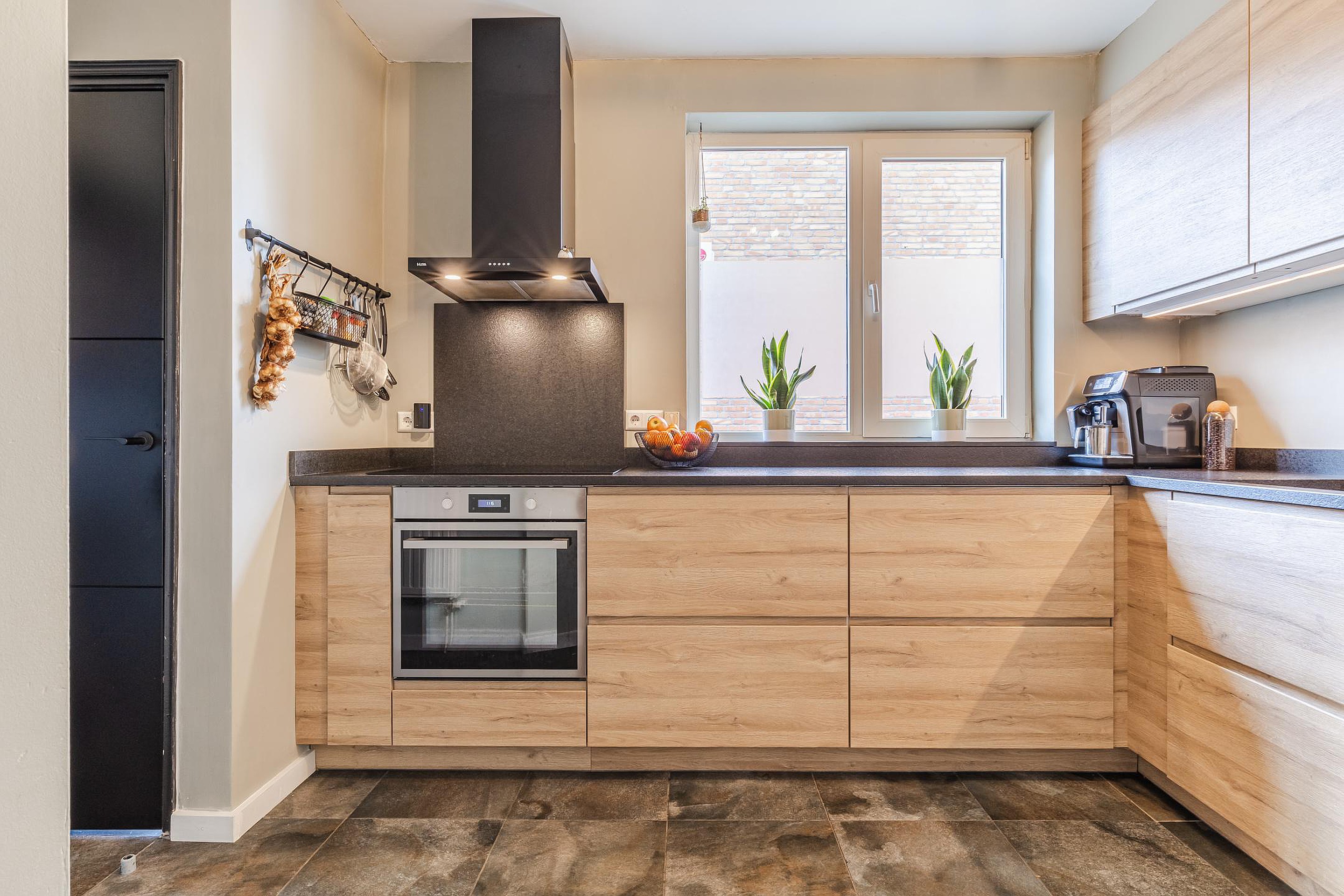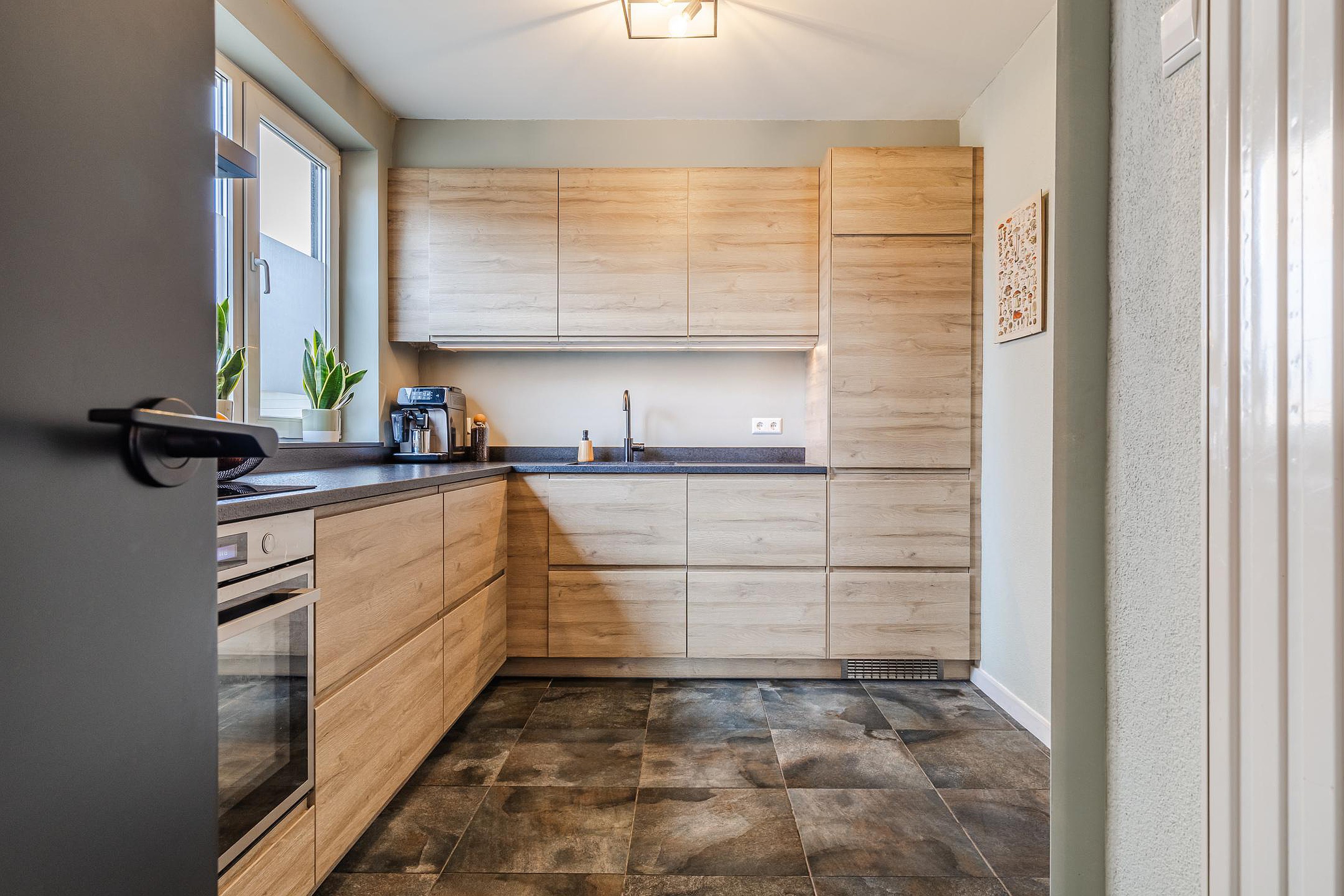 De entree/ hal geeft toegang tot de toiletruimte, de trapopgang naar de 1e verdieping en de semi-open keuken. De toiletruimte is voorzien van een zwevend closet en fonteintje. De semi-open keuken (ca. 10m2) is in 2024 vernieuwd en is ingericht met een inductiekookplaat, afzuigkap, combi-oven, vaatwasser, koelkast met diepvriesvak en een granieten aanrechtblad. Vanuit de keuken is er zicht op de oprit. Middels een open doorgang is er toegang tot de royale woonkamer. De woonkamer is aan de achterzijde uitgebouwd en is in totaal ca. 45m2 groot. De woonkamer is in 2024 voorzien van een nieuwe pvc vloer. In de aanbouw is de airconditioning gesitueerd. De grote schuifpui zorgt voor optimaal tuincontact en veel natuurlijk lichtinval.