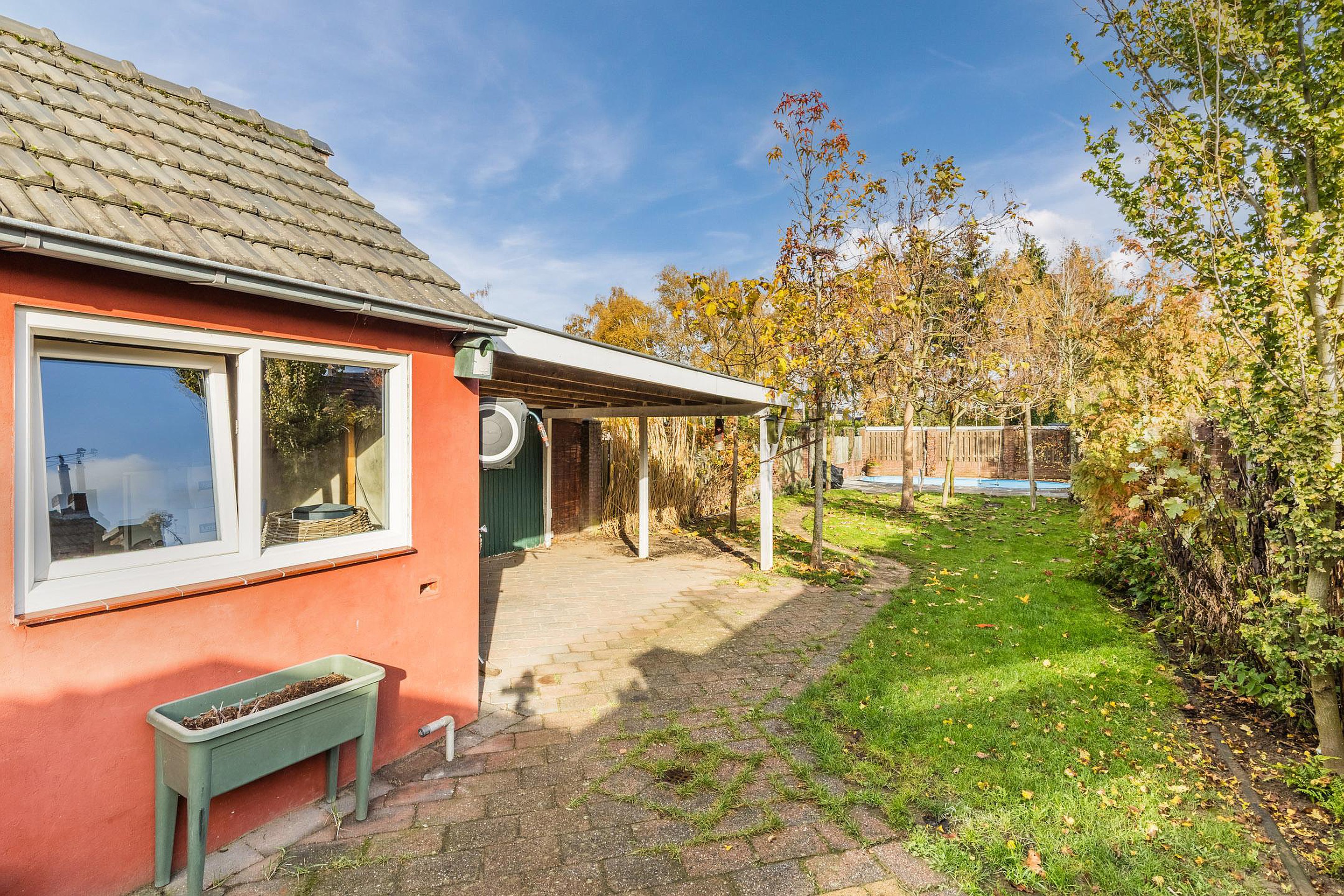 De riante achtertuin heeft een groot terras aan de woning, borders met beplanting, bomen en een groot gazon. Achter in de tuin is het zwembad gelegen. Het zwembad is 1.60m diep en voorzien van verlichting. Vanuit de tuin is er toegang tot de ruime garage. De garage is ca. 18m2 groot en voorzien van elektra, water en witgoedaansluitingen. De garage heeft een vliering en een elektrische poort naar de gedeelde oprit. Aan de garage is een overkapping (ca. 18m2) gerealiseerd.