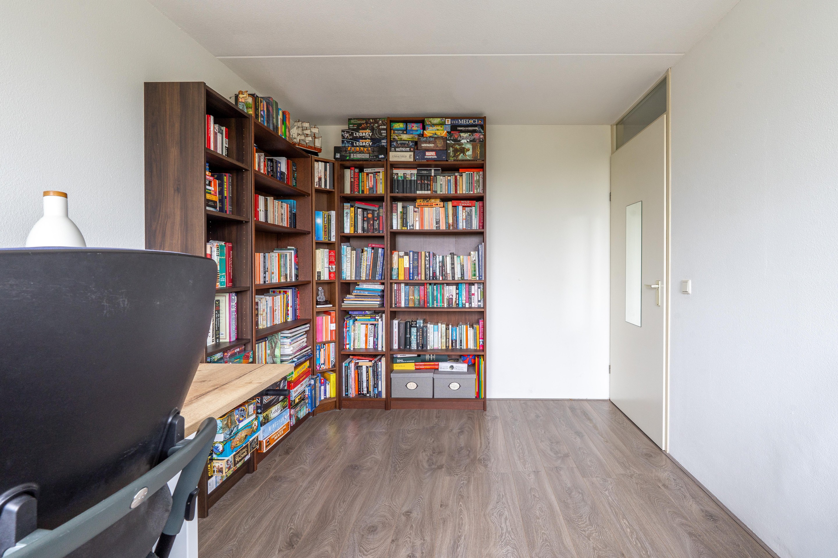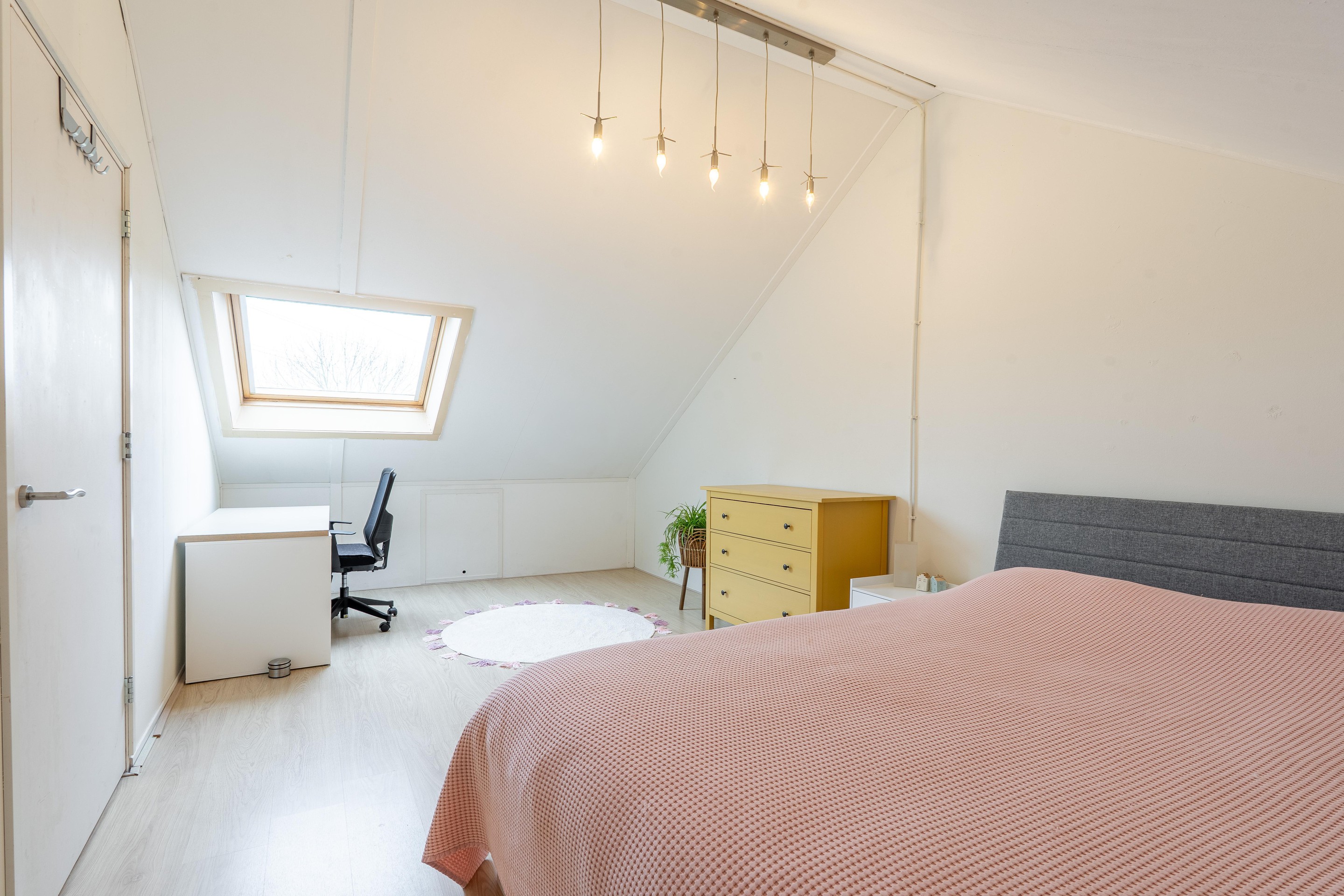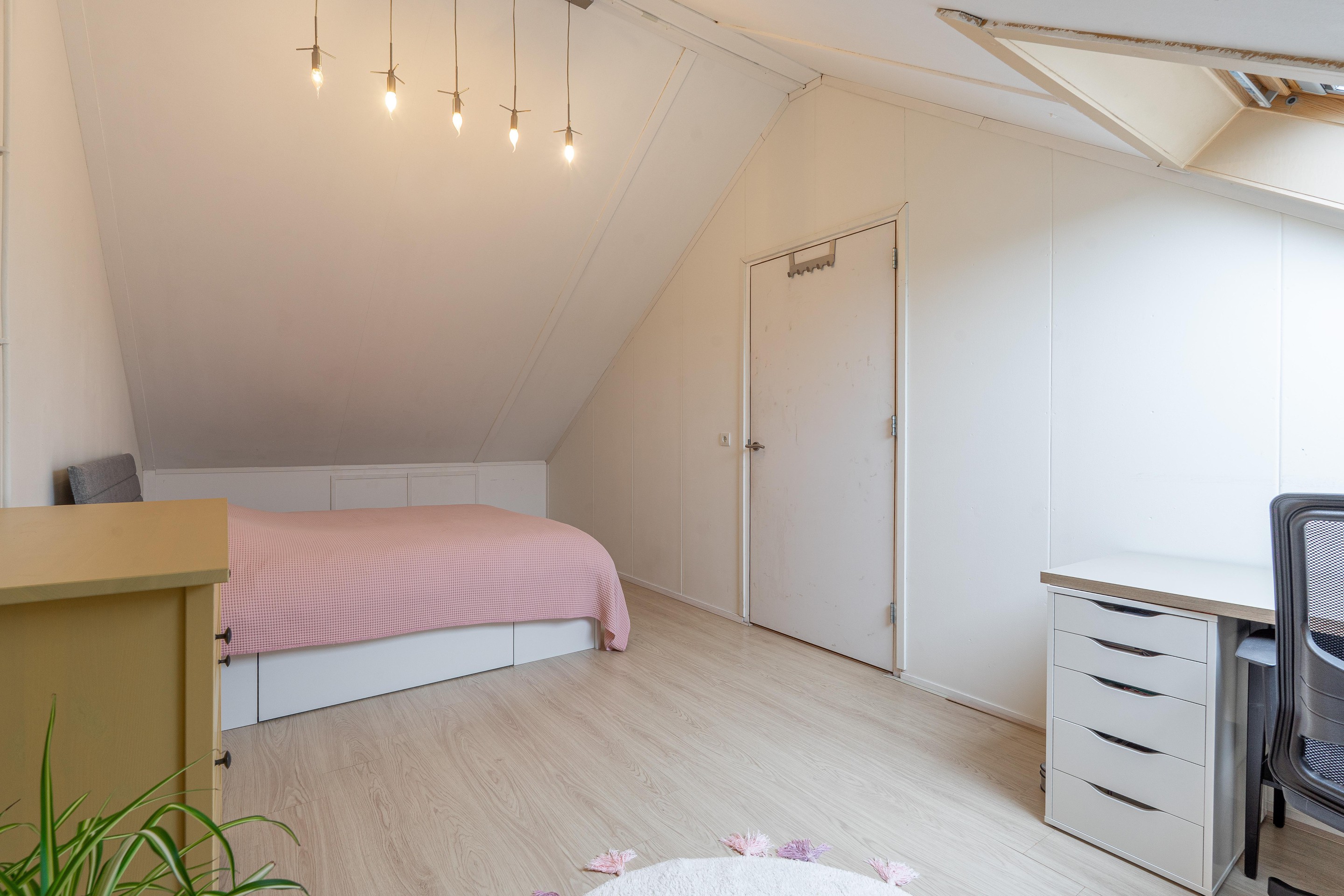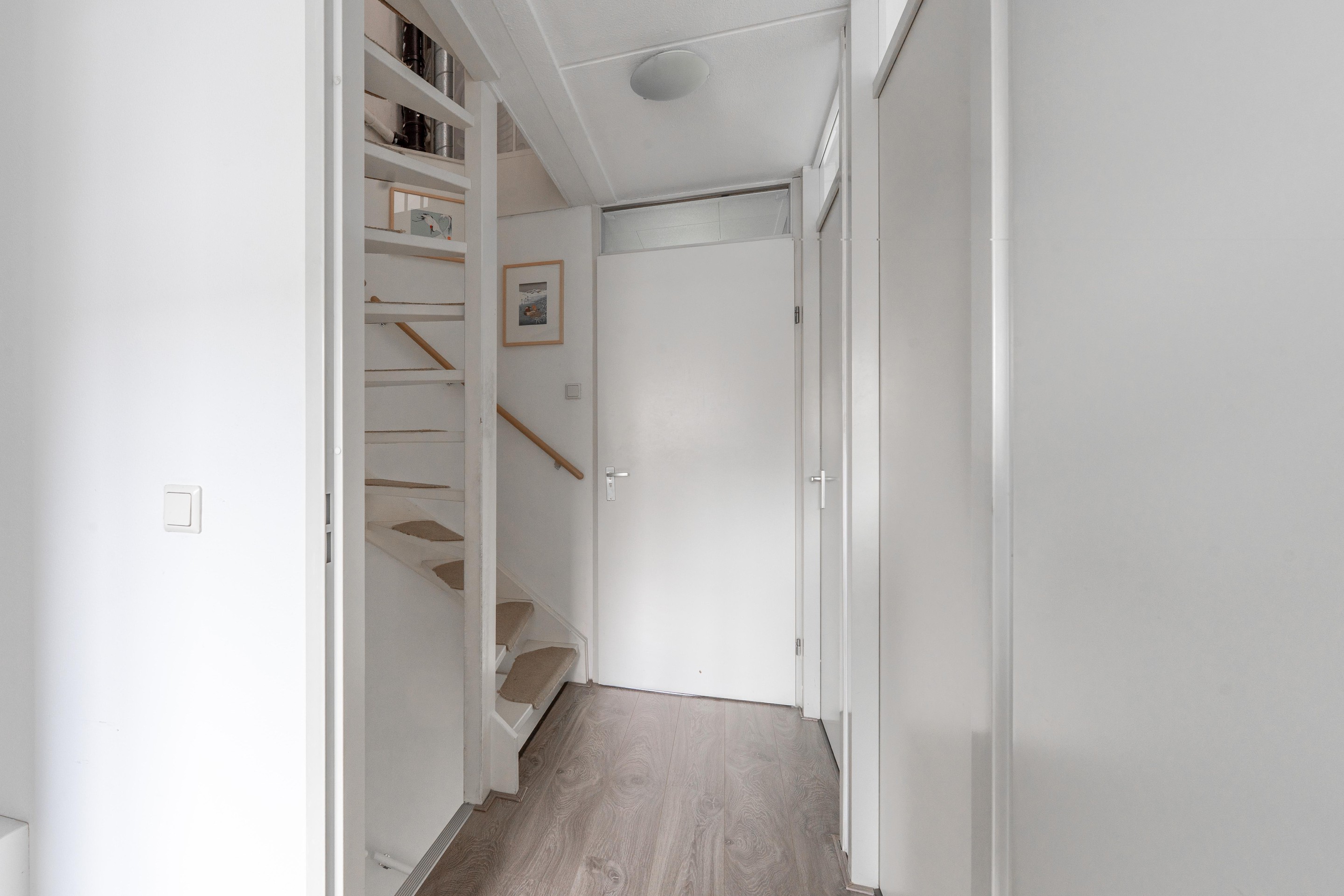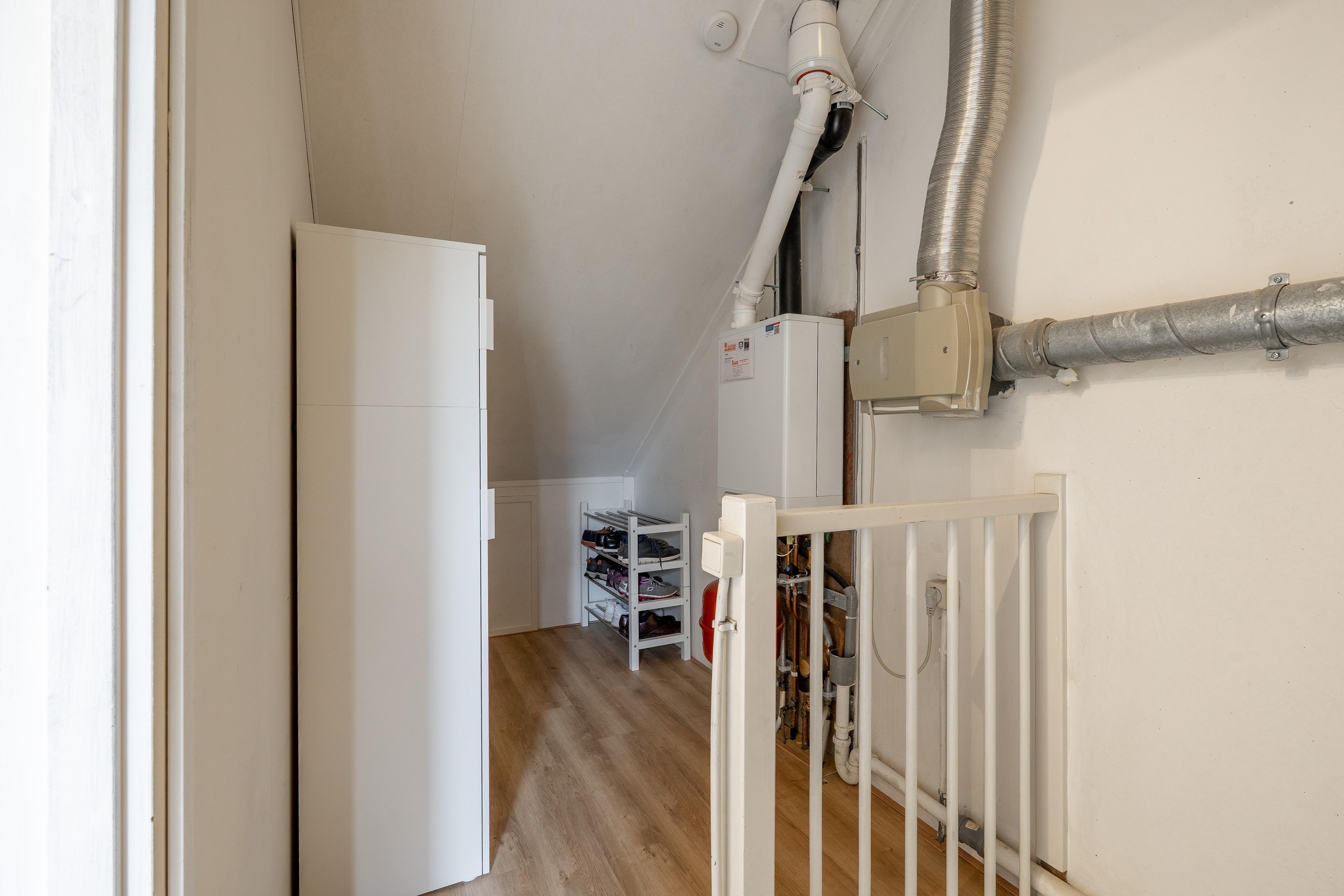 2e verdieping: via vaste trap bereikbaar, overloop voorzien van wasmachine aansluiting en opstelling cv-ketel, royale 4e slaapkamer voorzien van Velux dakvenster, voorts veel bergruimte achter knieschotten.