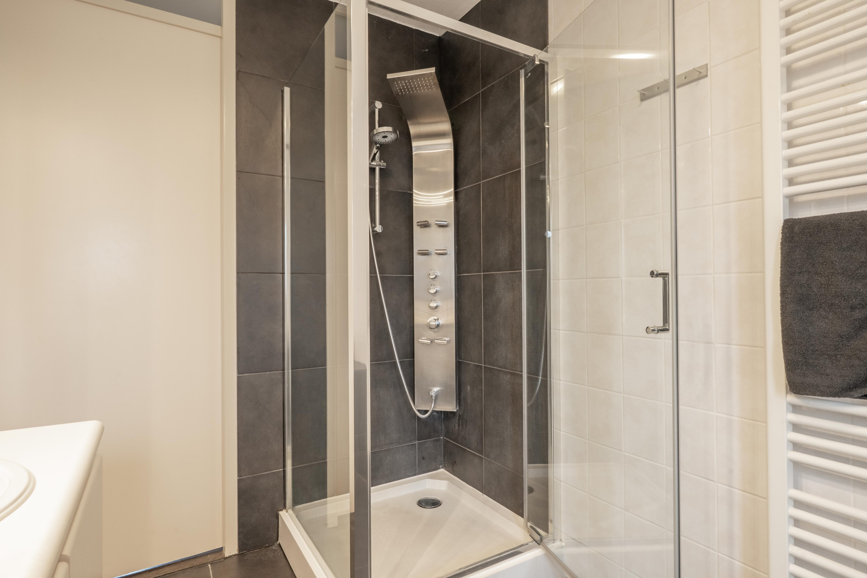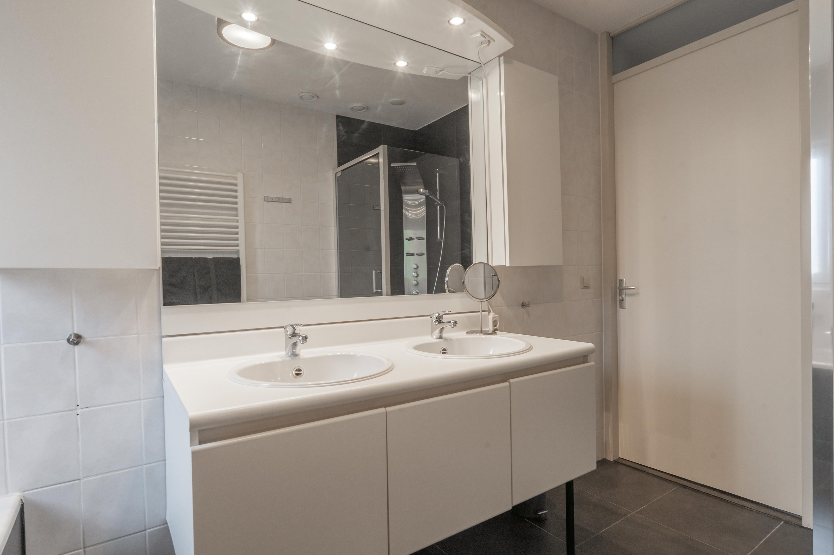 1e verdieping: overloop met separaat toilet met fonteintje, 2 ruime slaapkamers beide voorzien van rolluiken (resp. groot 14 m2 en 10 m2), moderne badkamer voorzien van ligbad, douchecabine en wastafelmeubel.