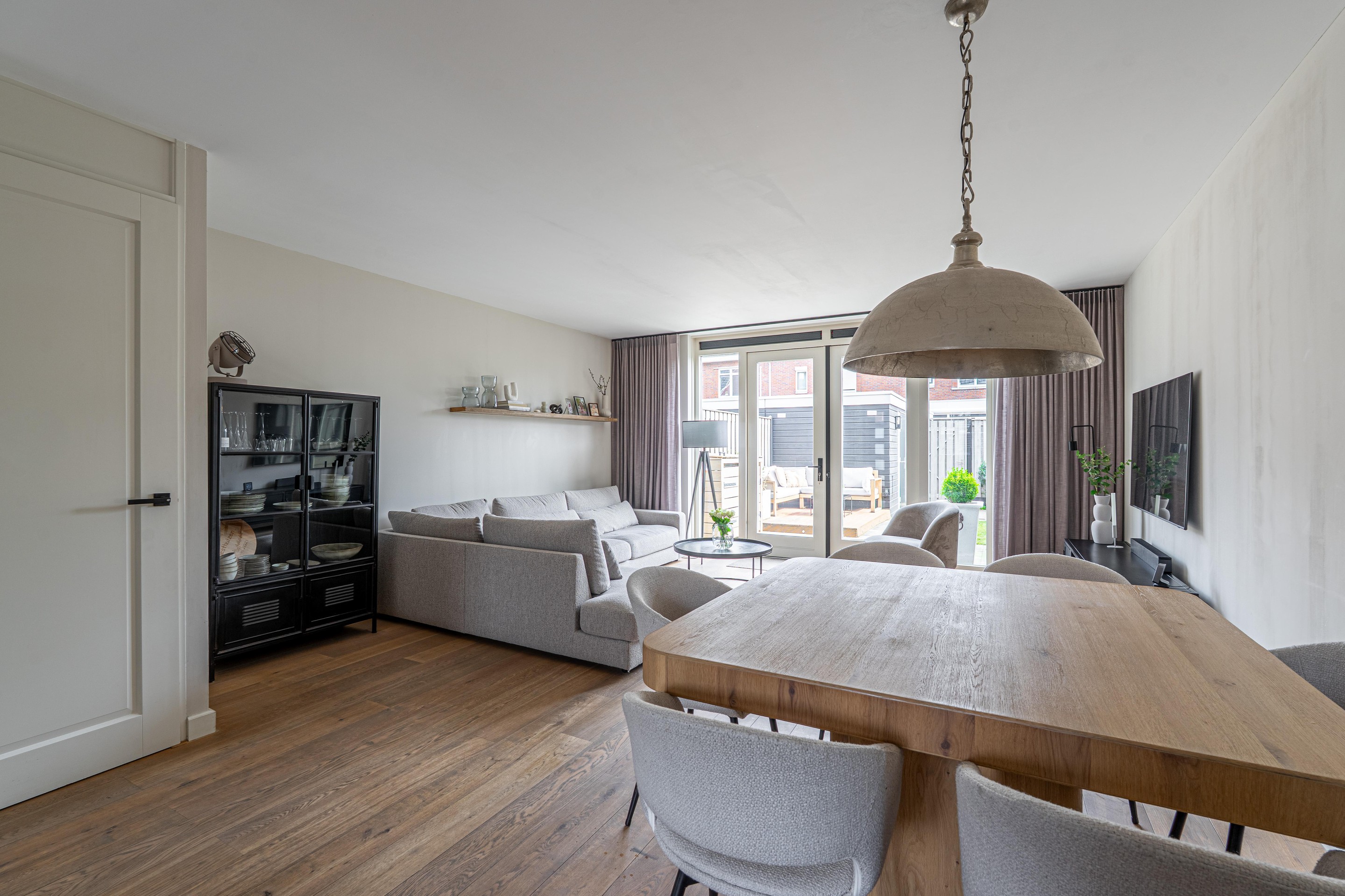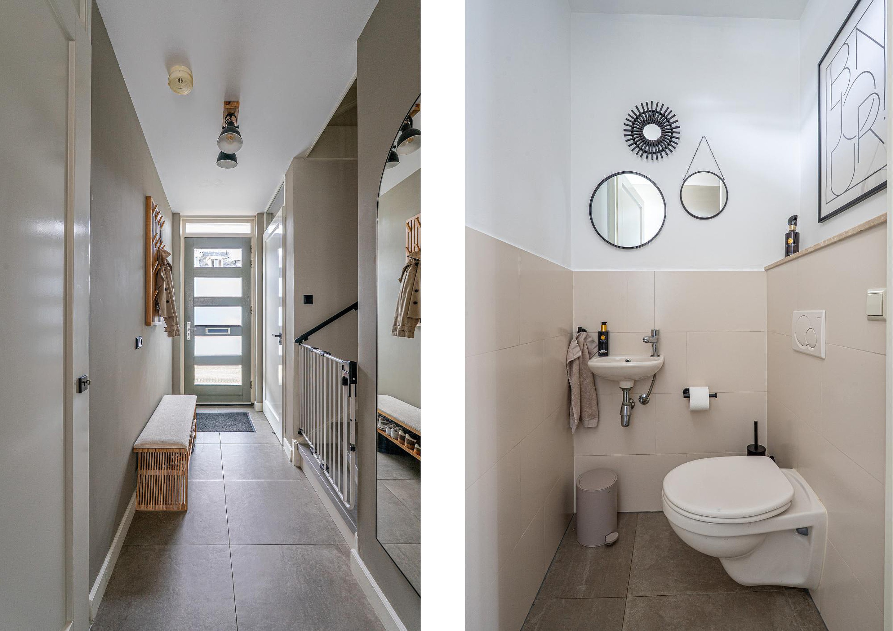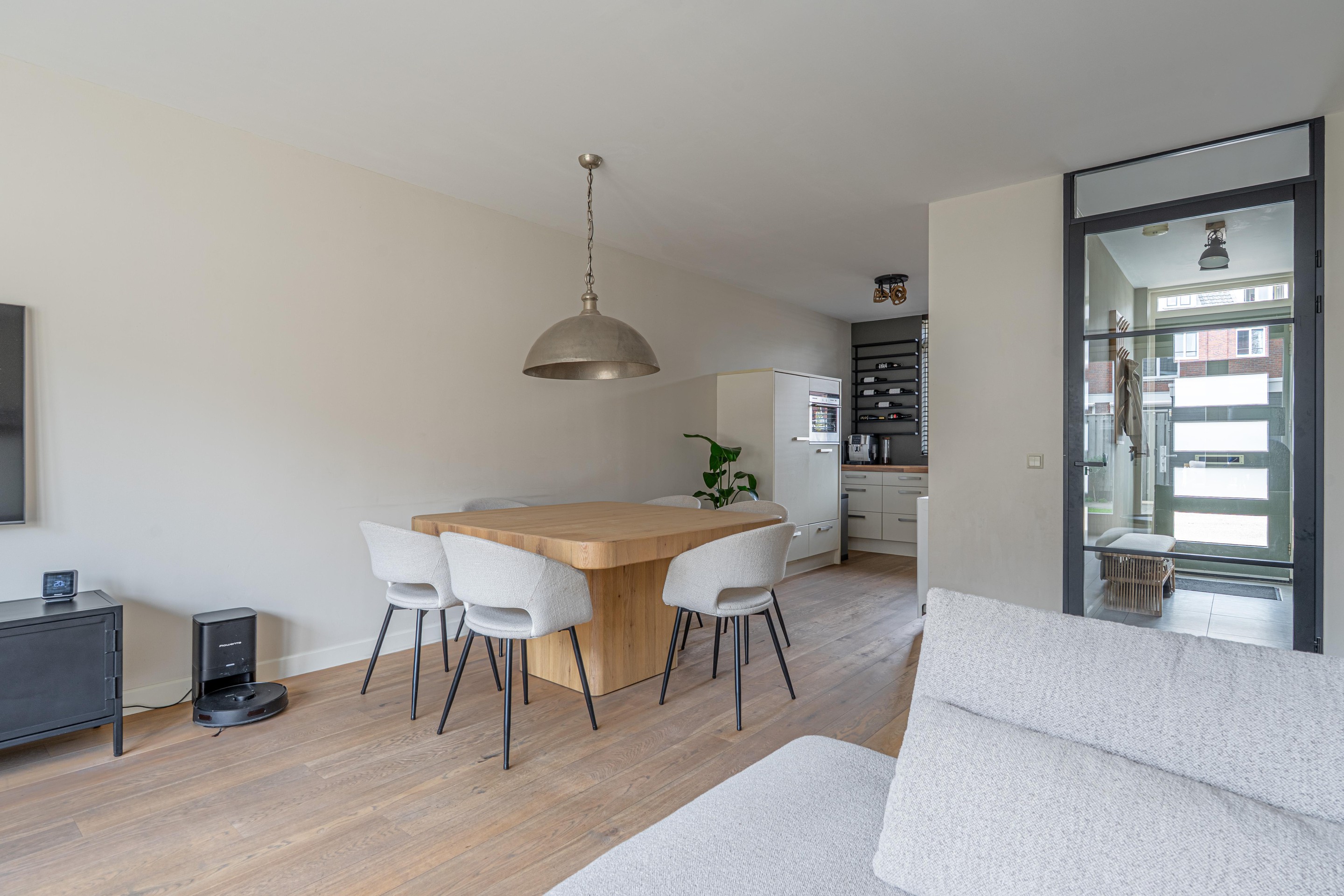 Begane grond: Hal met trapopgang, meterkast, toilet met fonteintje, royale uitgebouwde woonkamer 31,5 m2 met openslaande tuindeuren, provisiekast, open keuken 7 m2 voorzien van een moderne keuken inrichting met inbouw apparatuur waaronder een vaatwasser, 4-pits inductiekookplaat, afzuigschouw, combi-oven/magnetron en koelkast.
