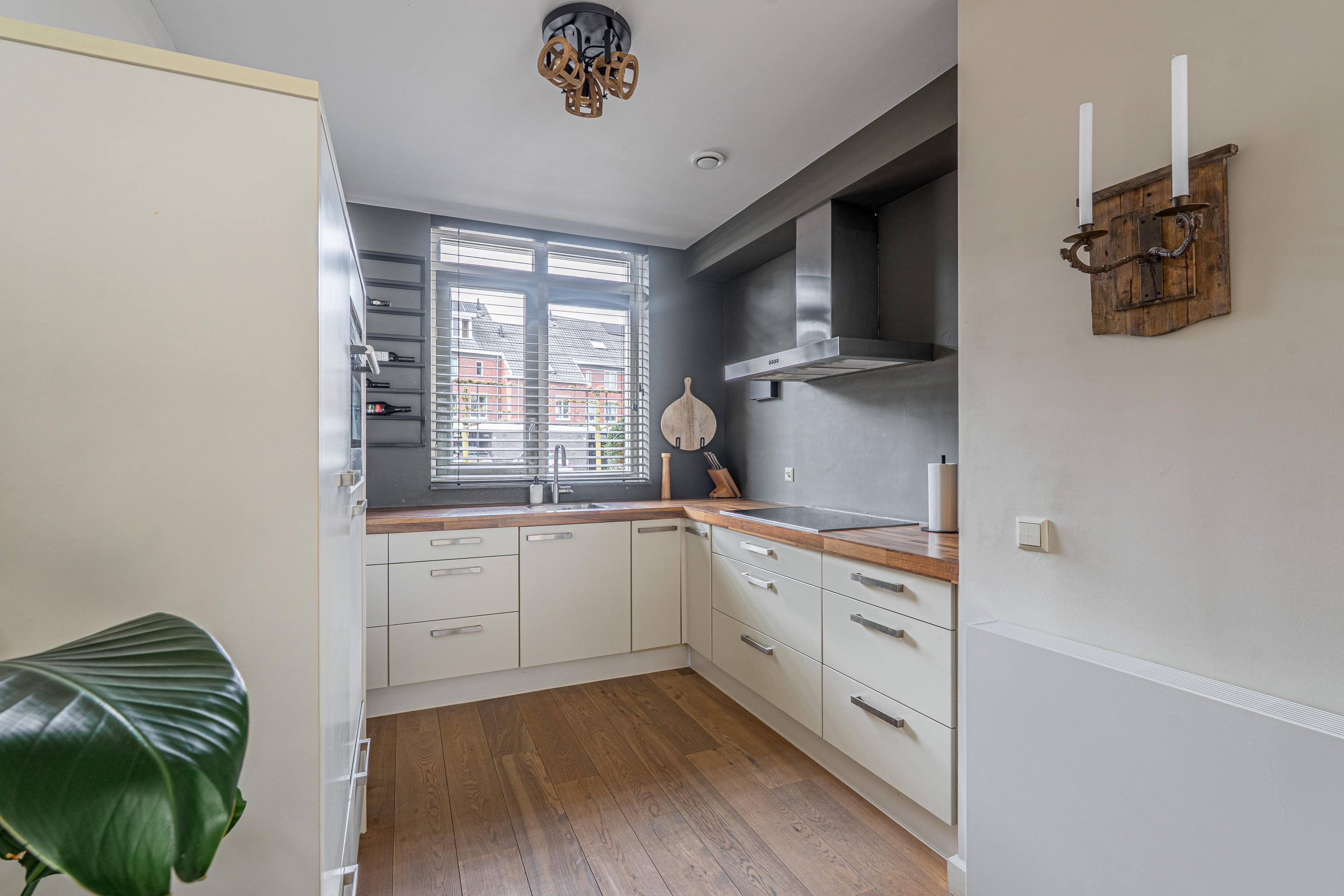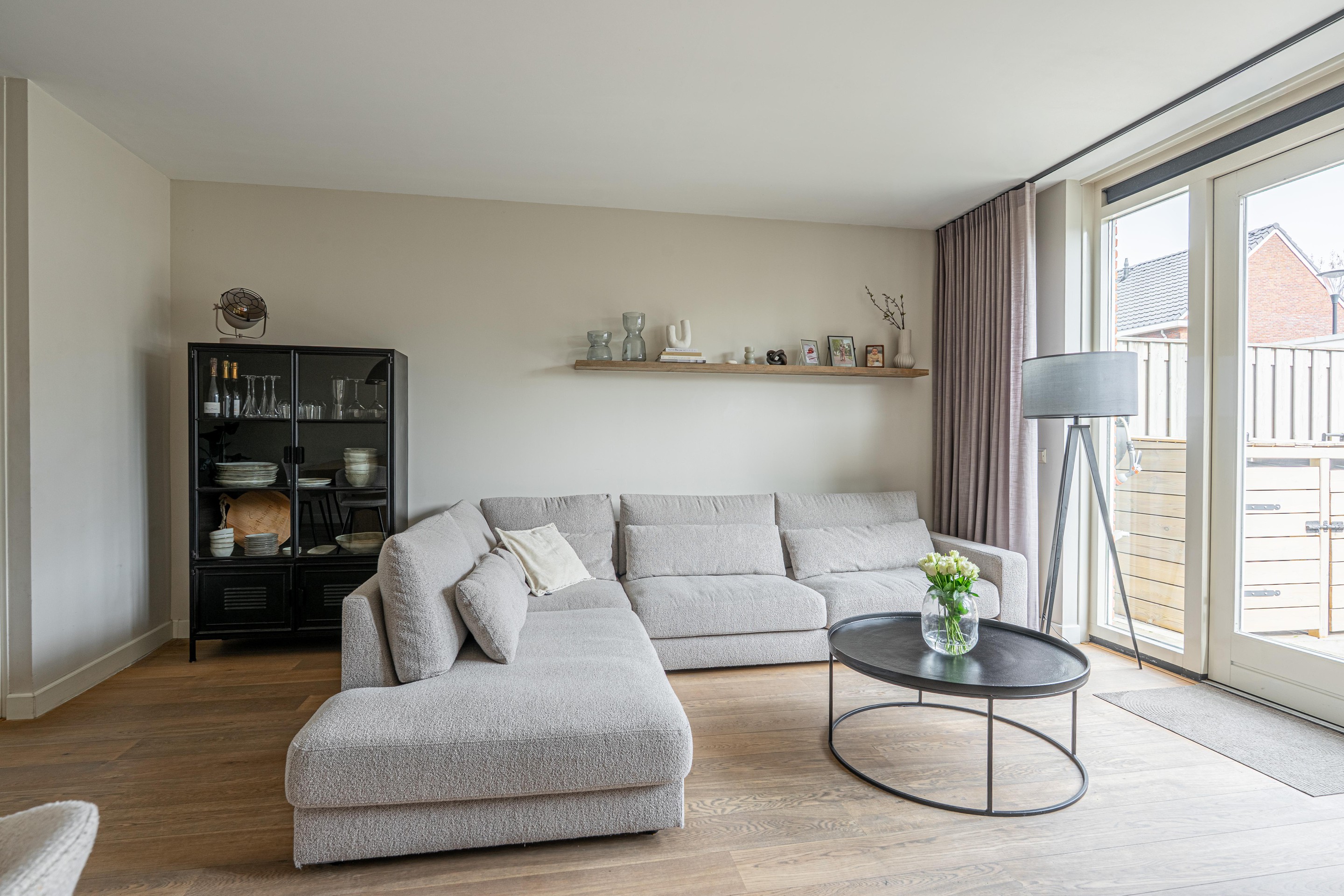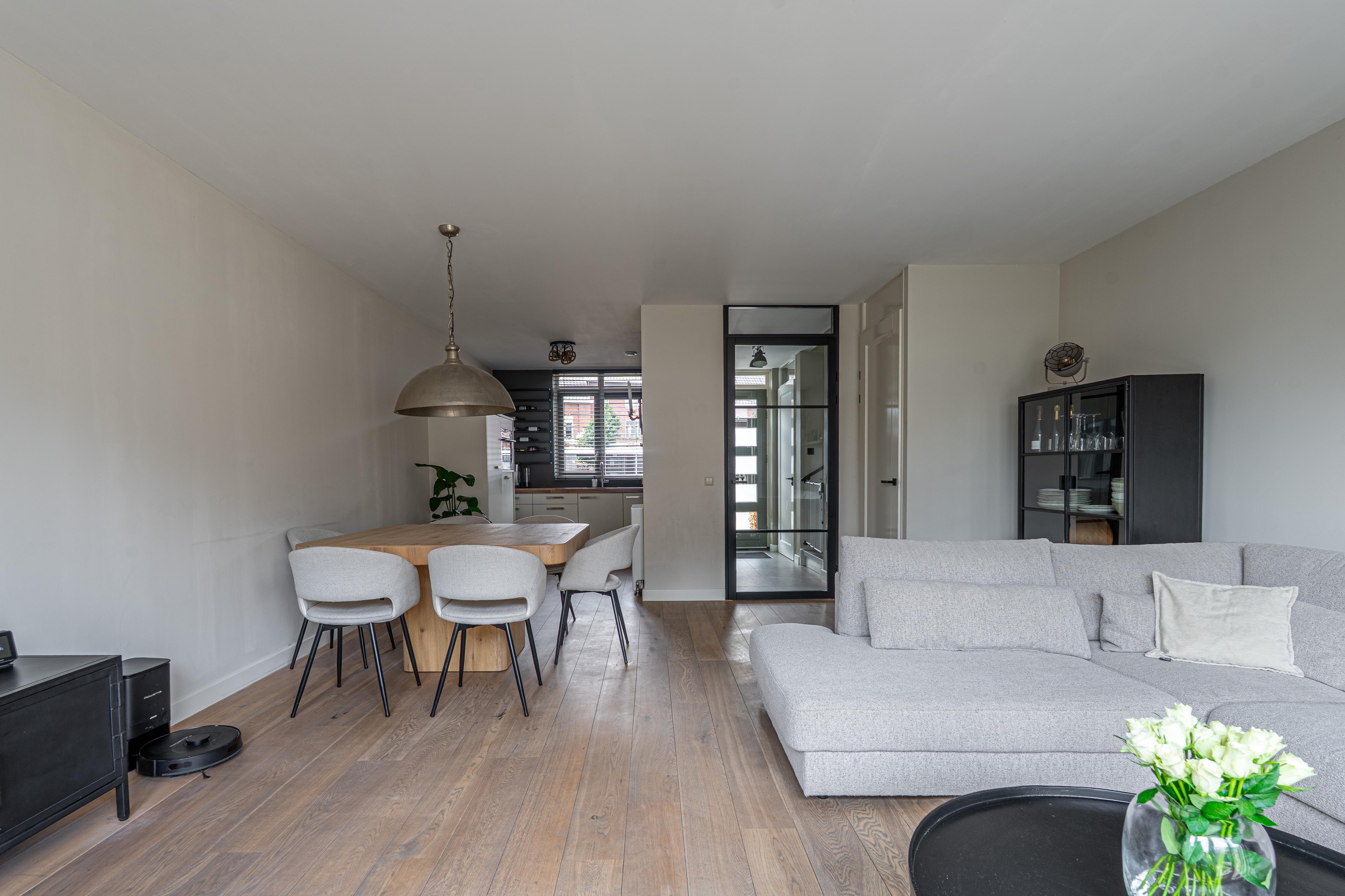 Begane grond: Hal met trapopgang, meterkast, toilet met fonteintje, royale uitgebouwde woonkamer 31,5 m2 met openslaande tuindeuren, provisiekast, open keuken 7 m2 voorzien van een moderne keuken inrichting met inbouw apparatuur waaronder een vaatwasser, 4-pits inductiekookplaat, afzuigschouw, combi-oven/magnetron en koelkast.