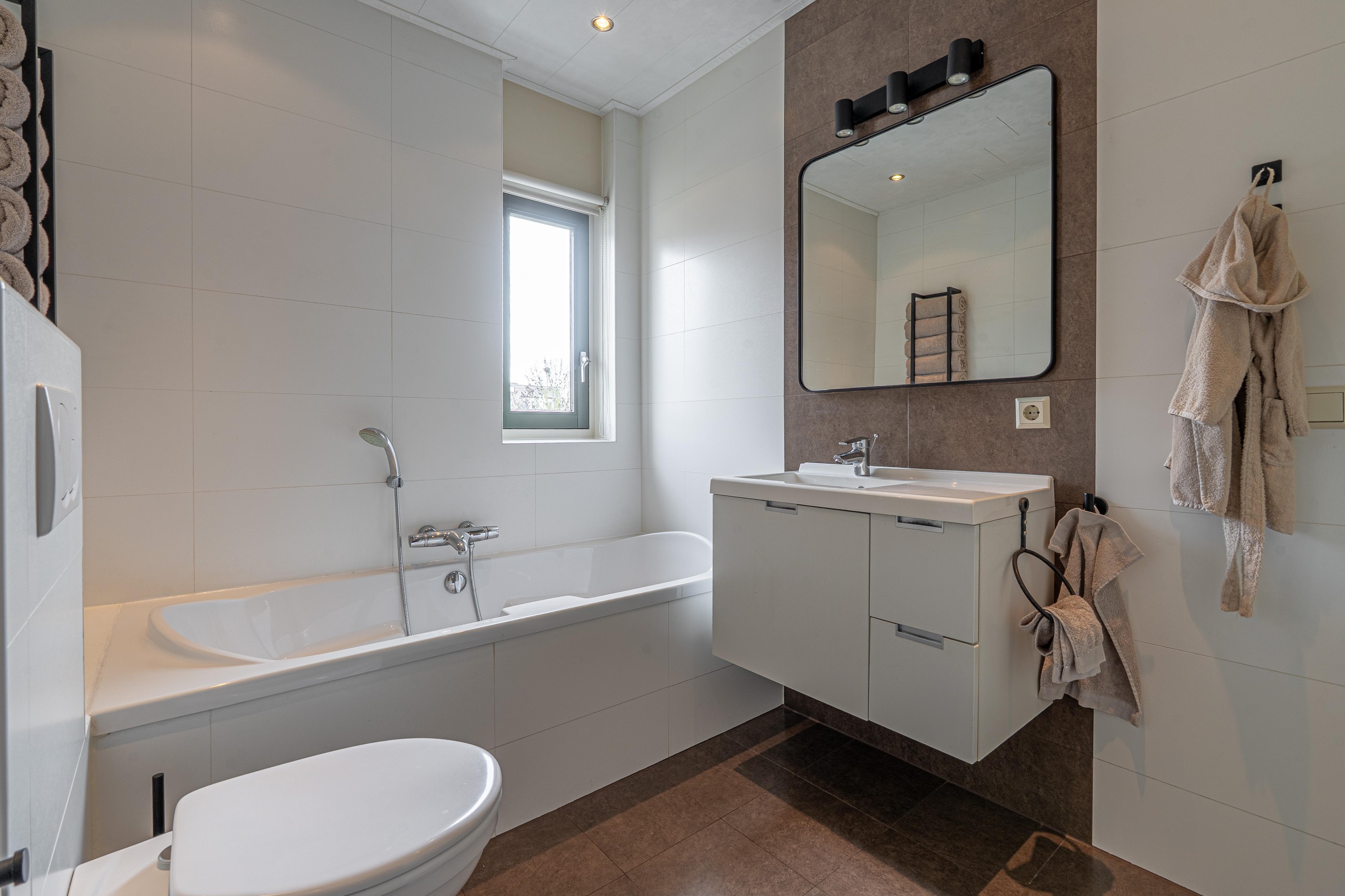 1e verdieping: overloop, 2 ruime slaapkamers beide voorzien van rolluiken (resp. groot 14 m2 en 10 m2), moderne badkamer voorzien van ligbad, douchecabine, 2e toilet en wastafelmeubel, separate wasruimte voorzien van wasmachine- en drogeropstelling.