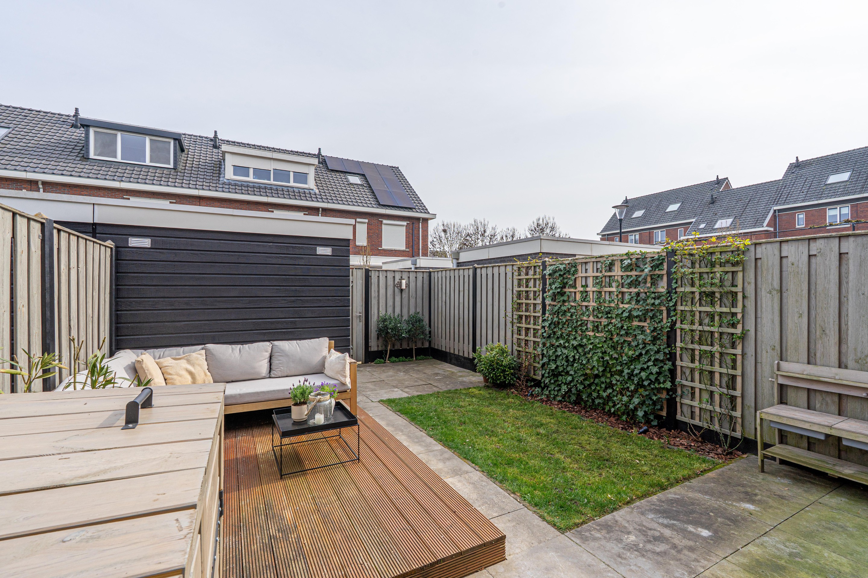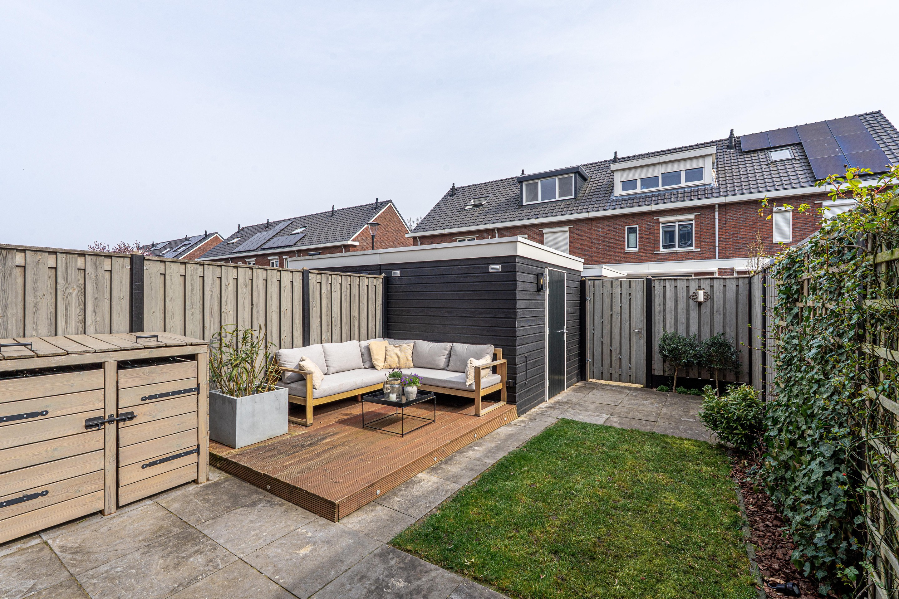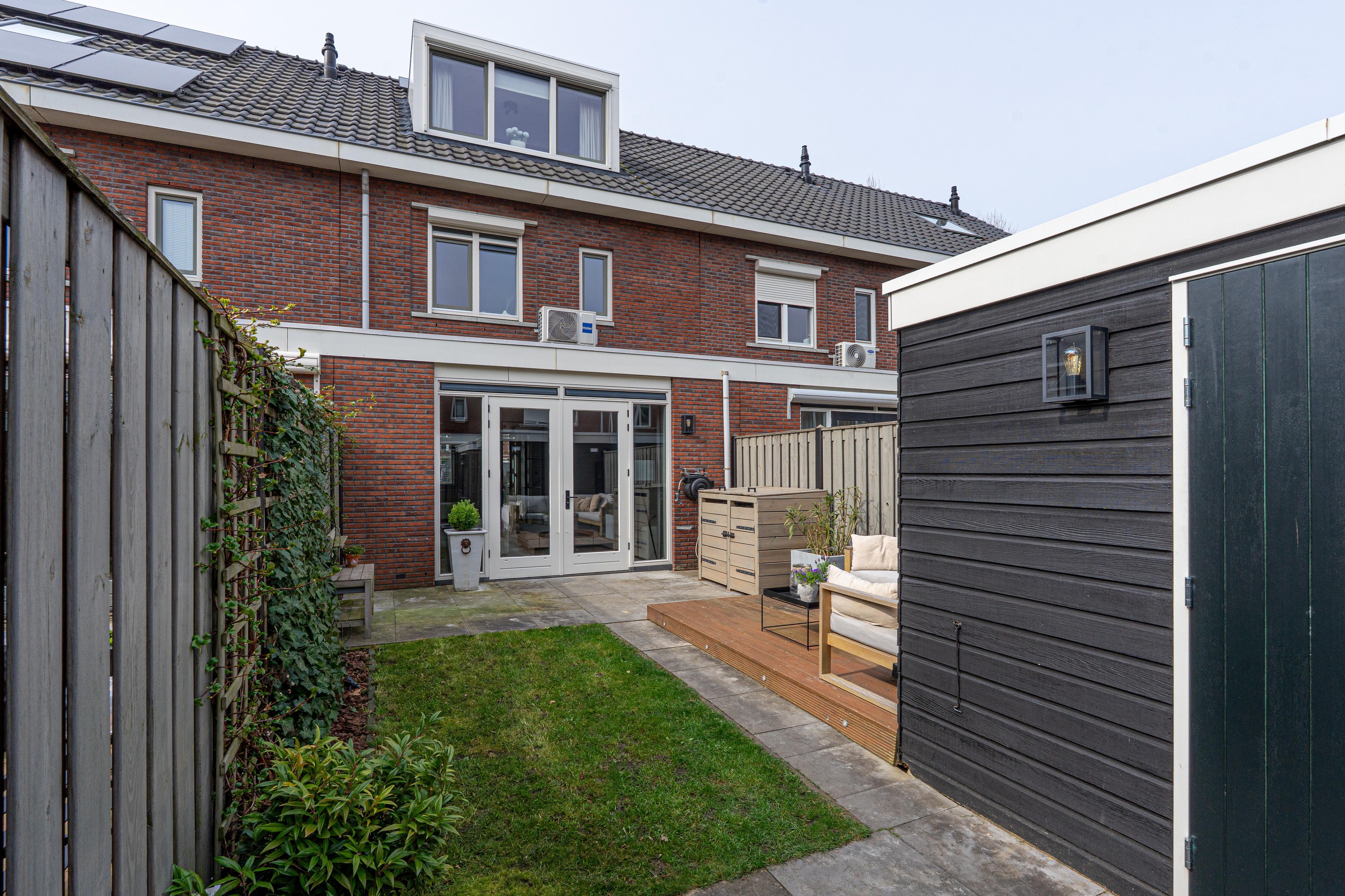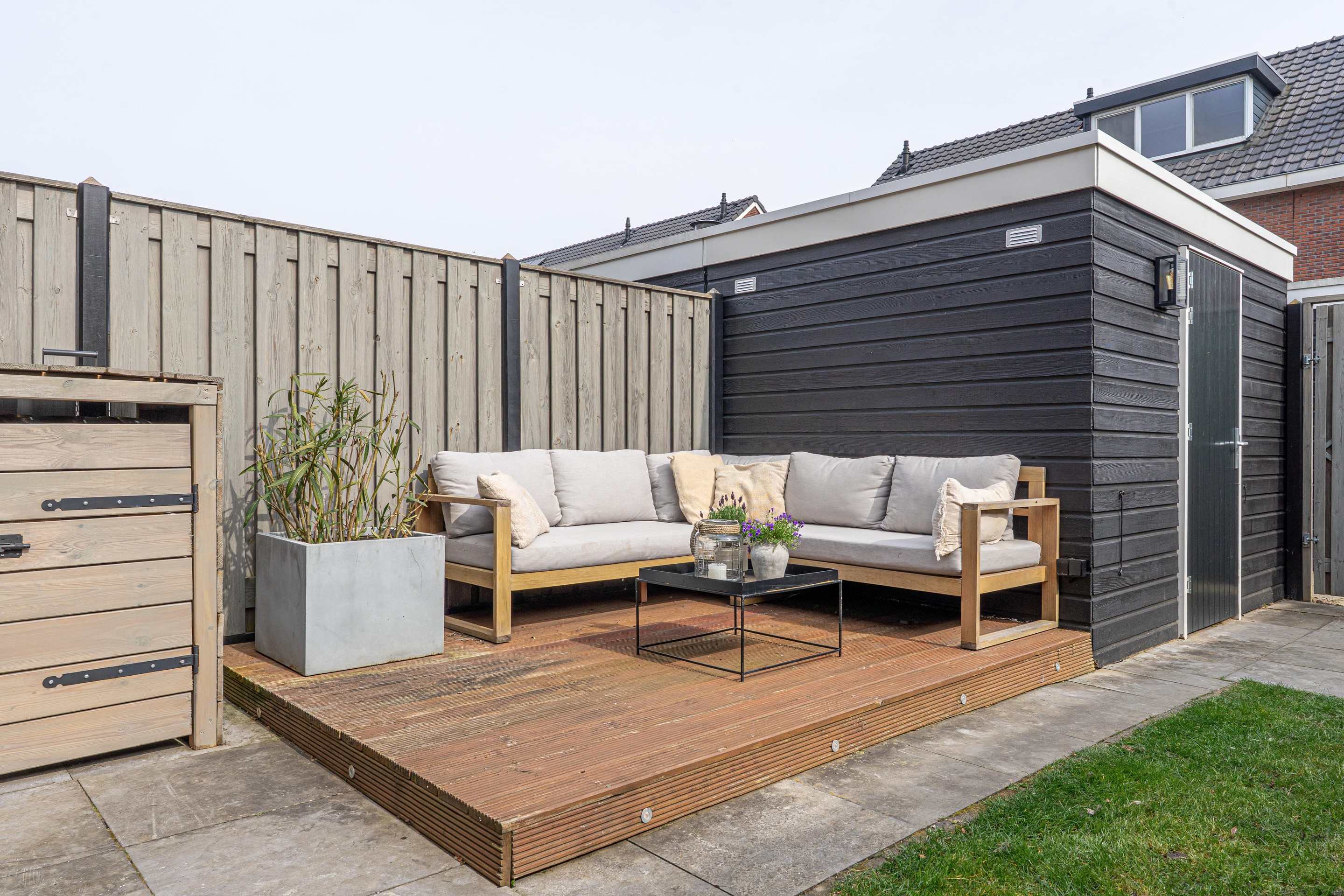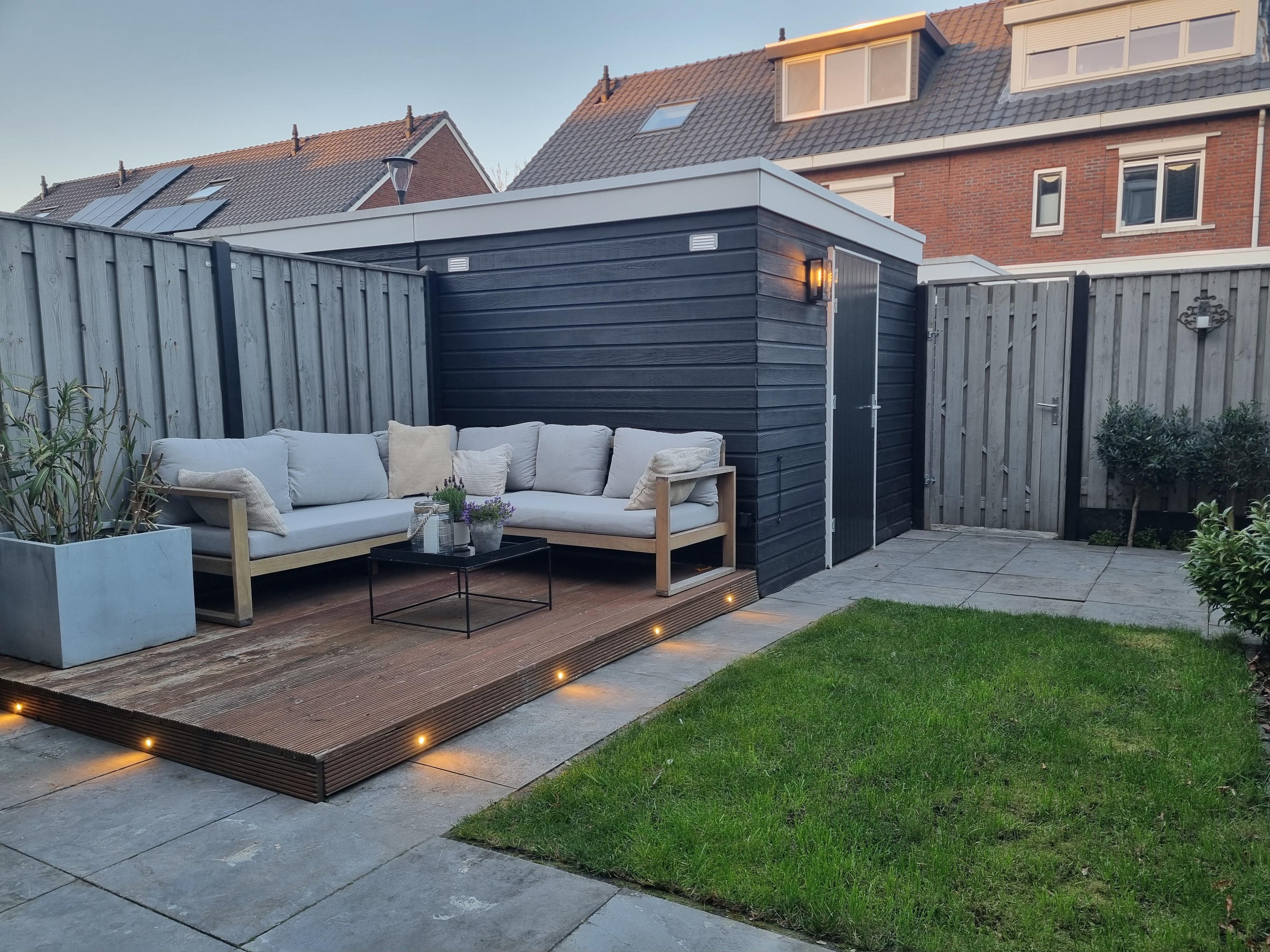 - Achtertuin met hardhouten vlonderterras voorzien van inbouw verlichting, berging en achterom;