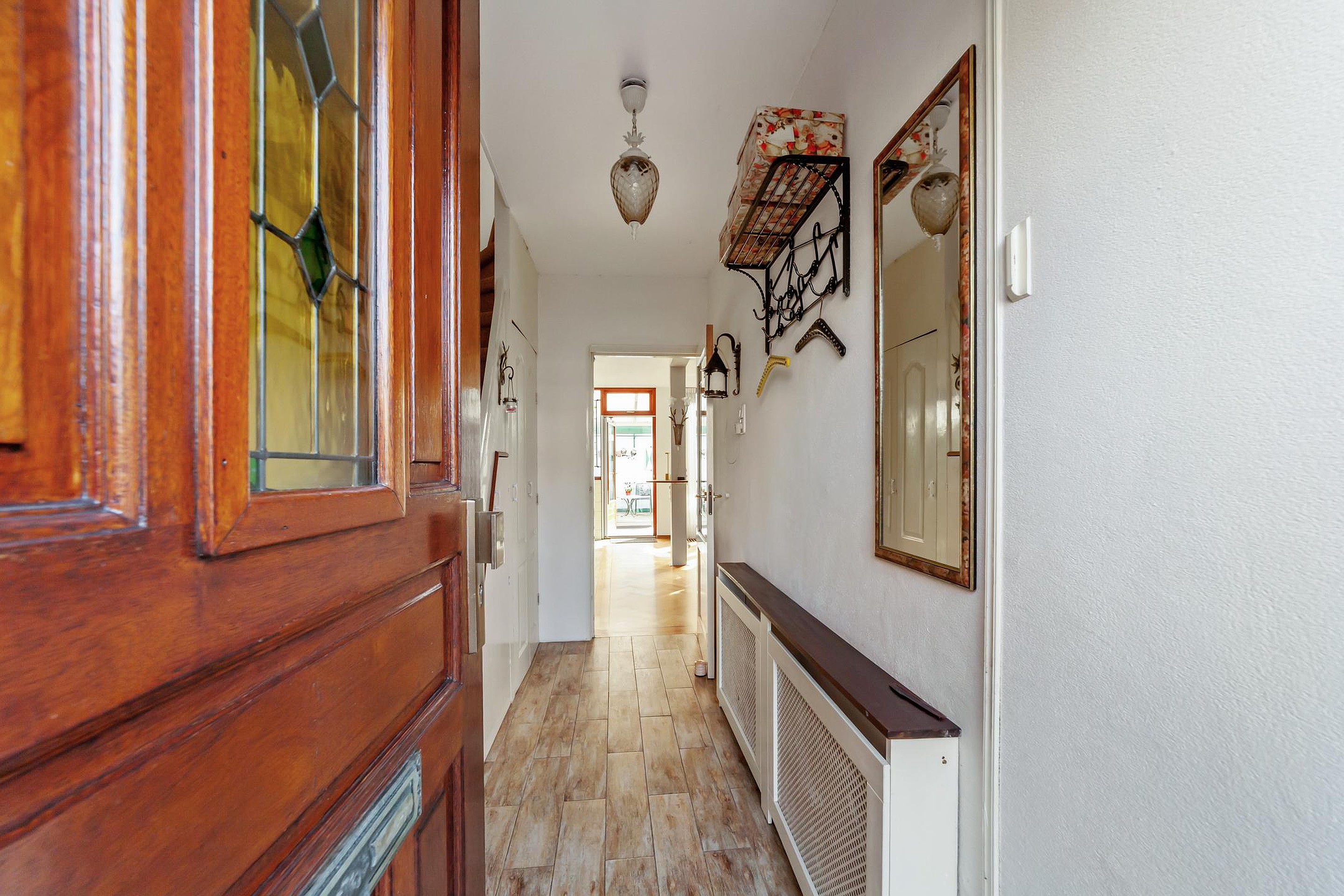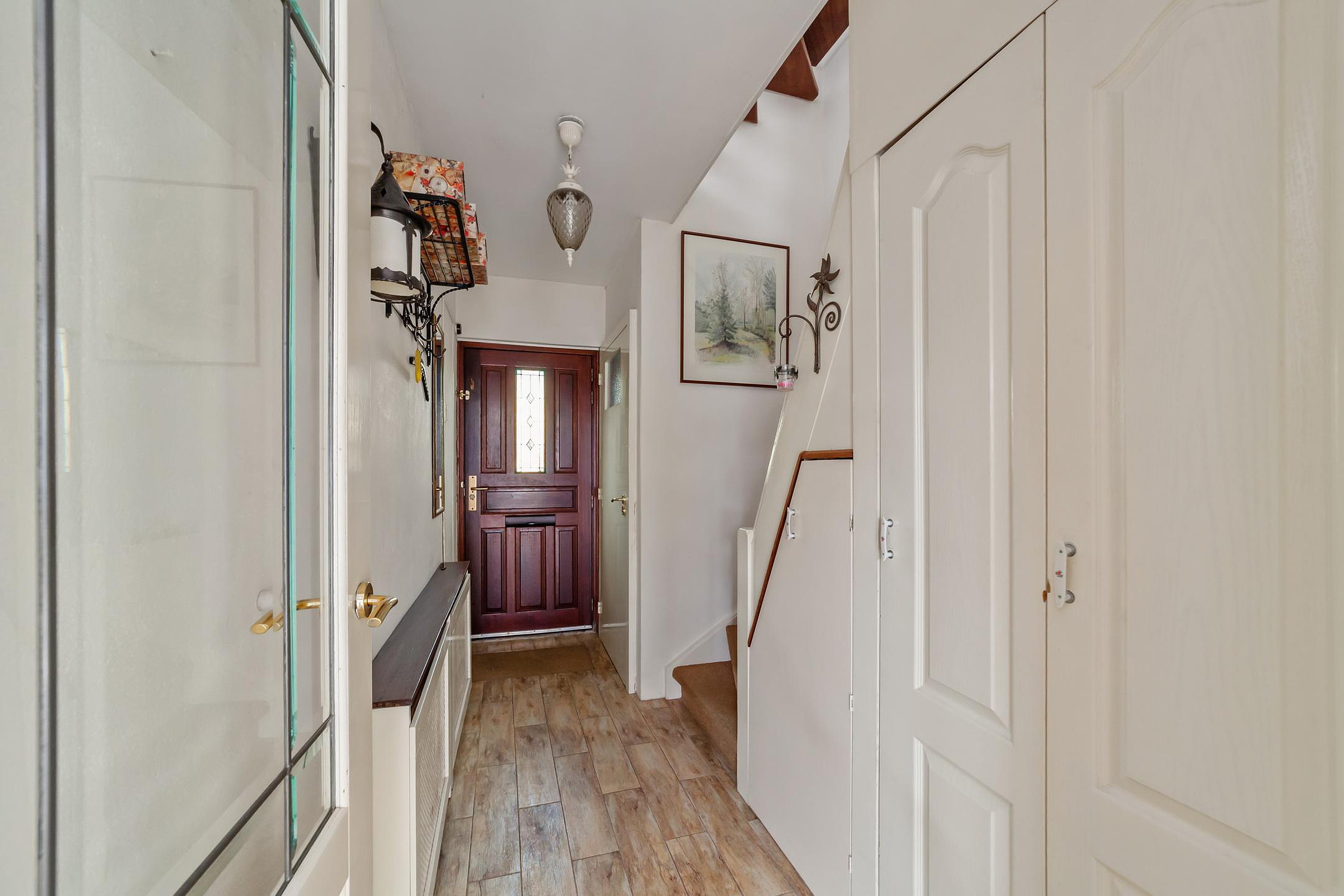 Via de ruime voortuin bereik je de entree van de woning. In de hal bevinden zich het toilet en een praktische kast met de opstelling voor de wasmachine en droger.