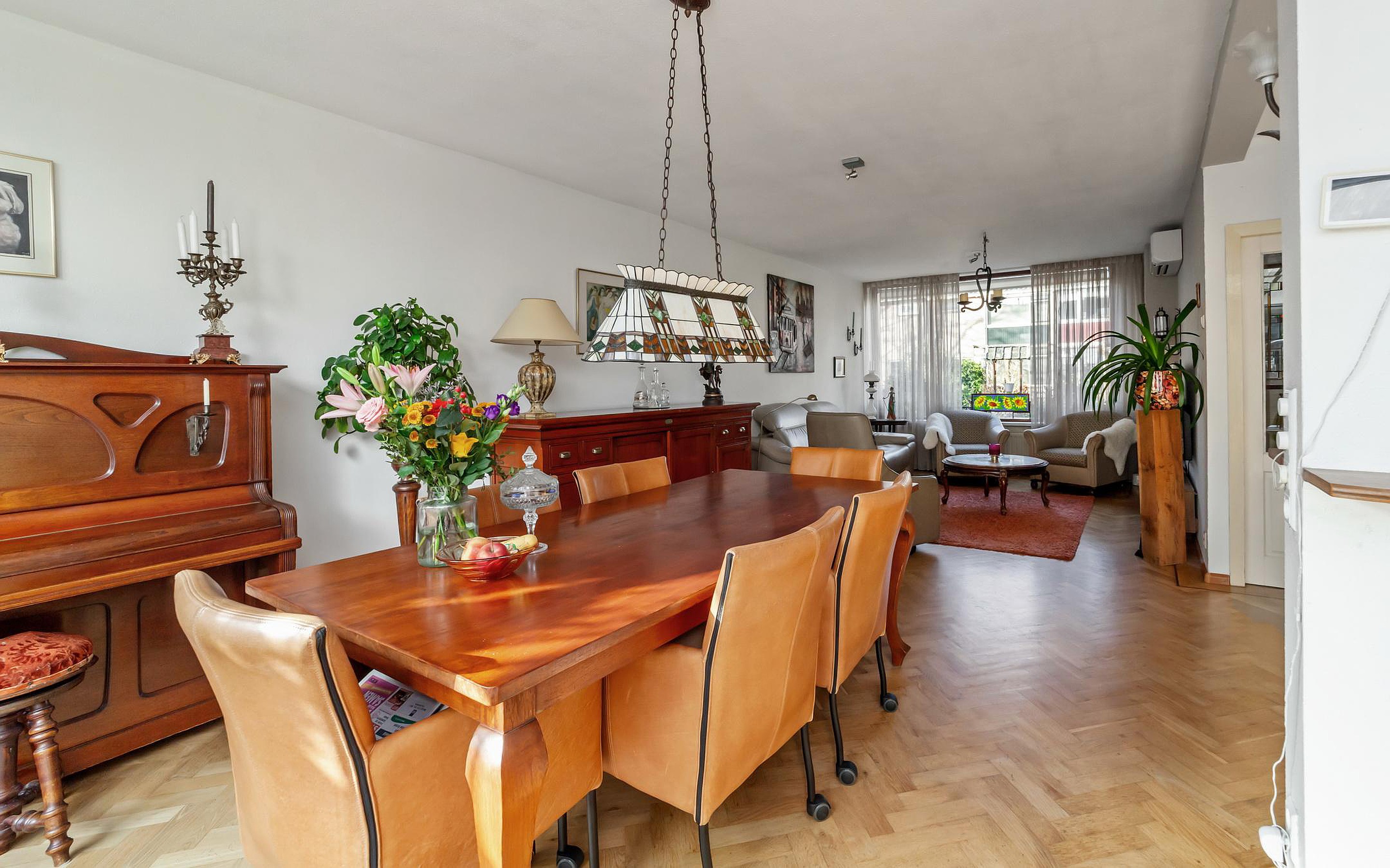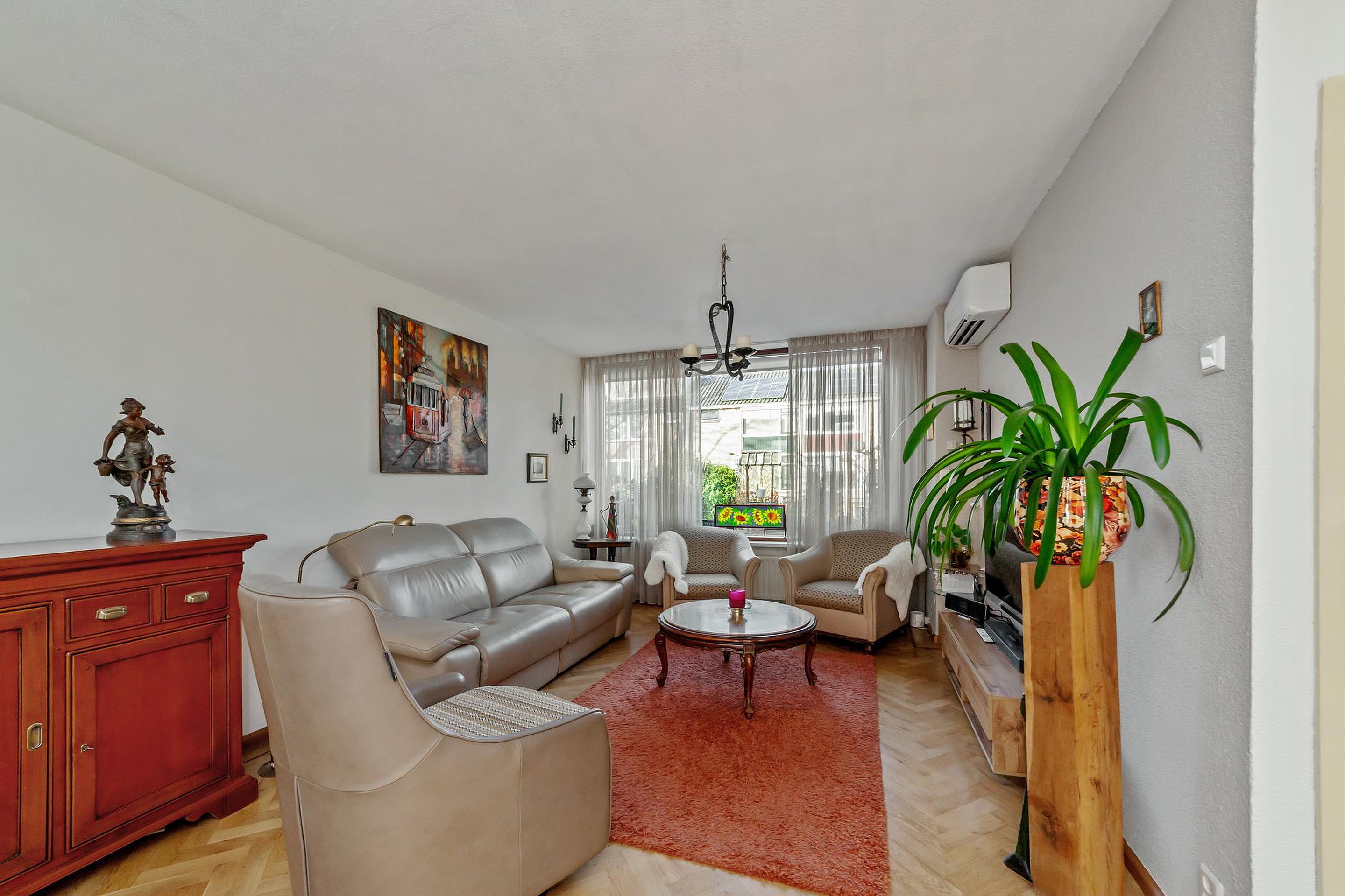 Vanuit de hal kom je in de ruime en lichte doorzonwoonkamer met aangebouwde serre. De vloer van de woonkamer is geïsoleerd (voorzijde houten vloer, serre op beton) en afgewerkt met een fraaie parketvloer. Daarnaast is de woonkamer voorzien van airconditioning, wat zorgt voor extra comfort.