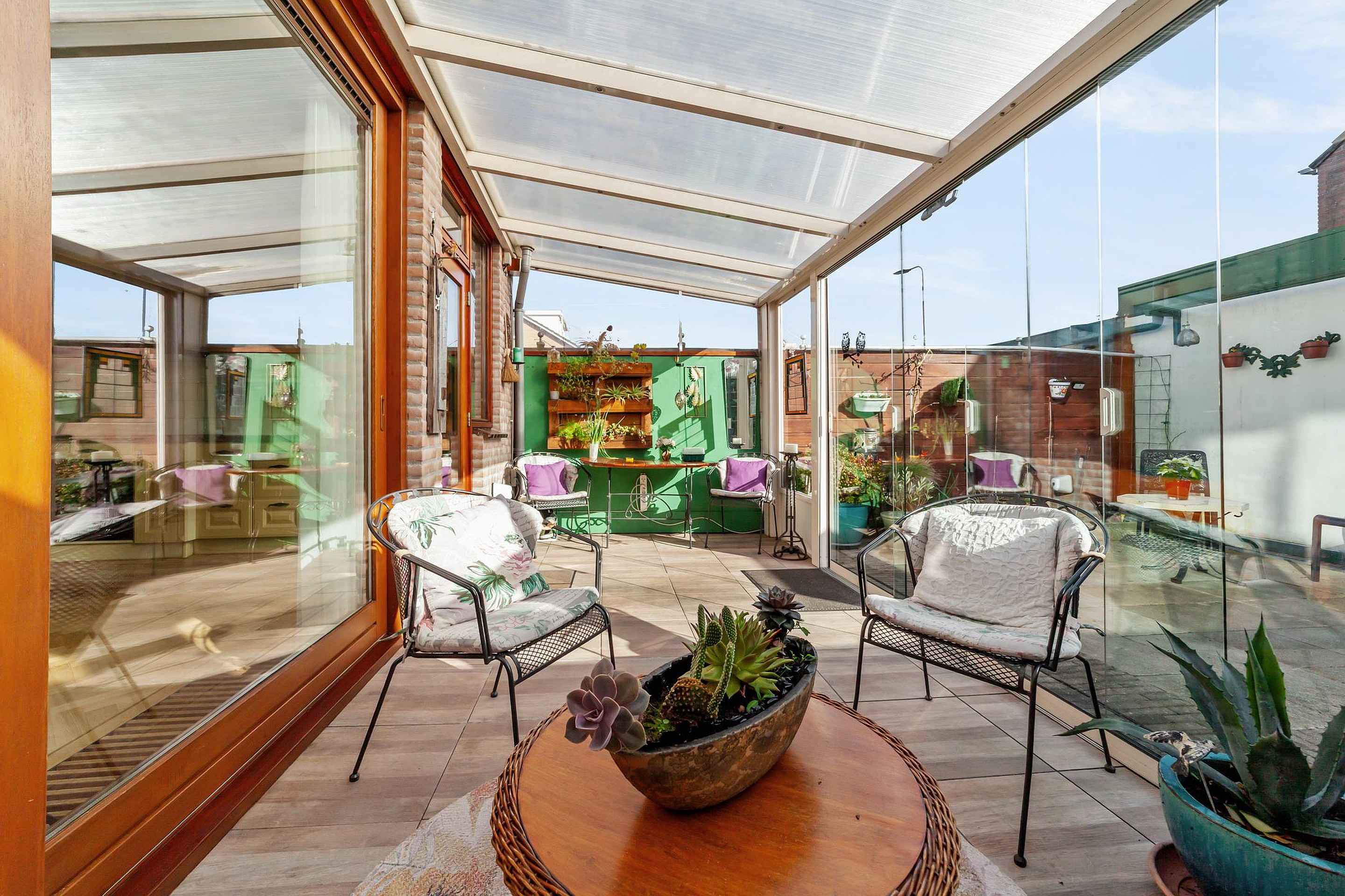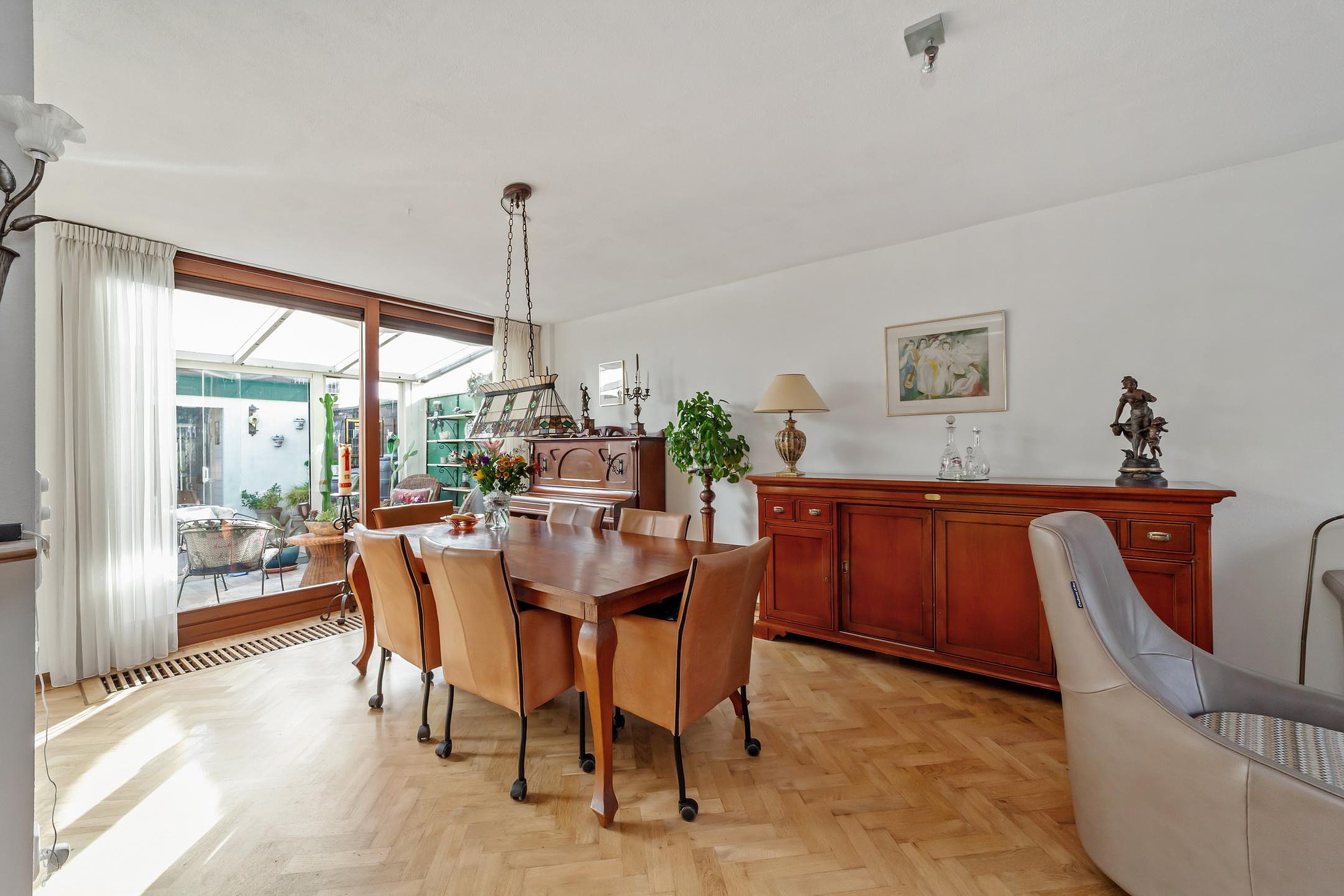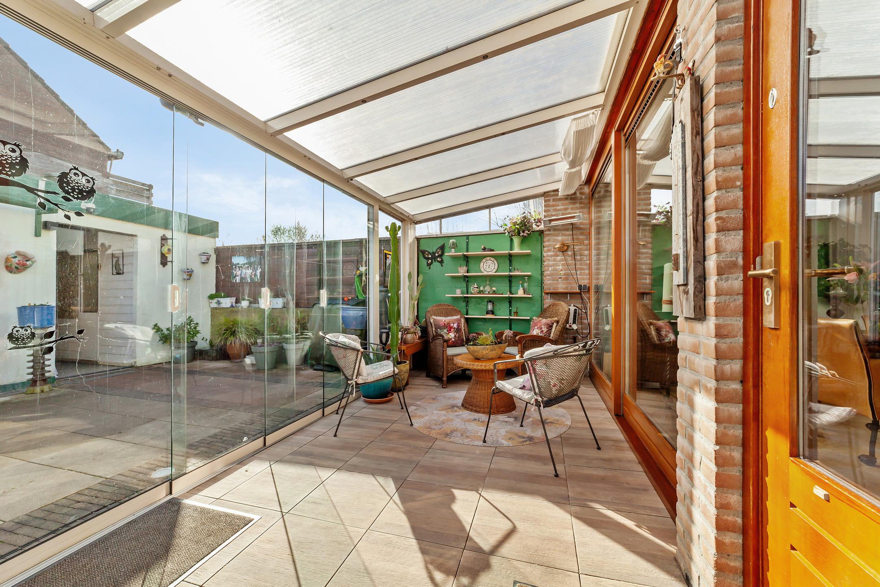 De later aangebouwde serre is bereikbaar via een schuifpui en zorgt voor veel extra licht in de woonkamer. Hier ligt een tegelvloer en heb je een mooie verbinding met de tuin.