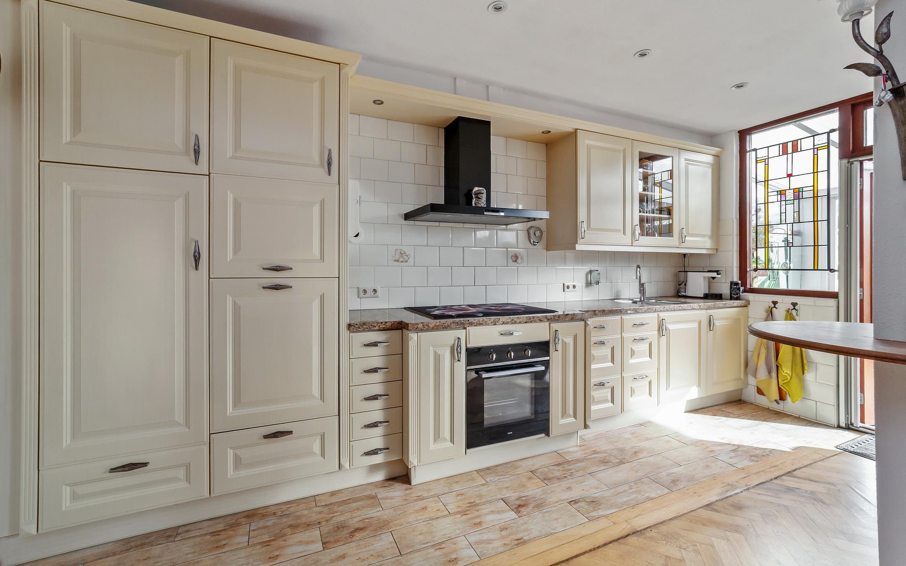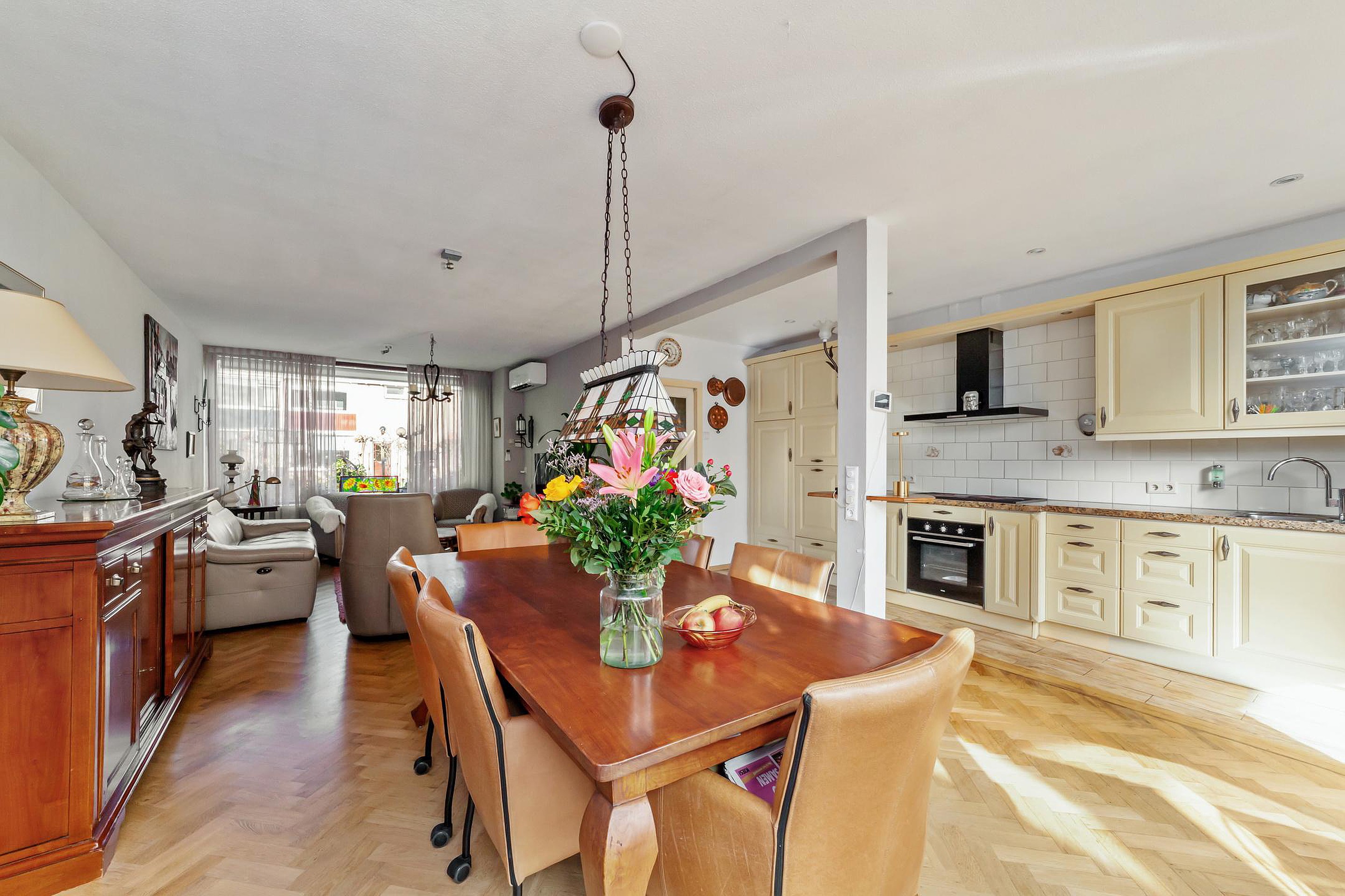 You reach the entrance to the house via the spacious front garden. The hall contains the toilet and a practical cupboard with space for the washing machine and dryer. From the hallway, you enter the spacious and bright living room with an attached conservatory. The living room floor is insulated (wooden floor at the front, concrete in the conservatory) and finished with beautiful parquet flooring. Additionally, the living room is equipped with air conditioning, ensuring extra comfort.