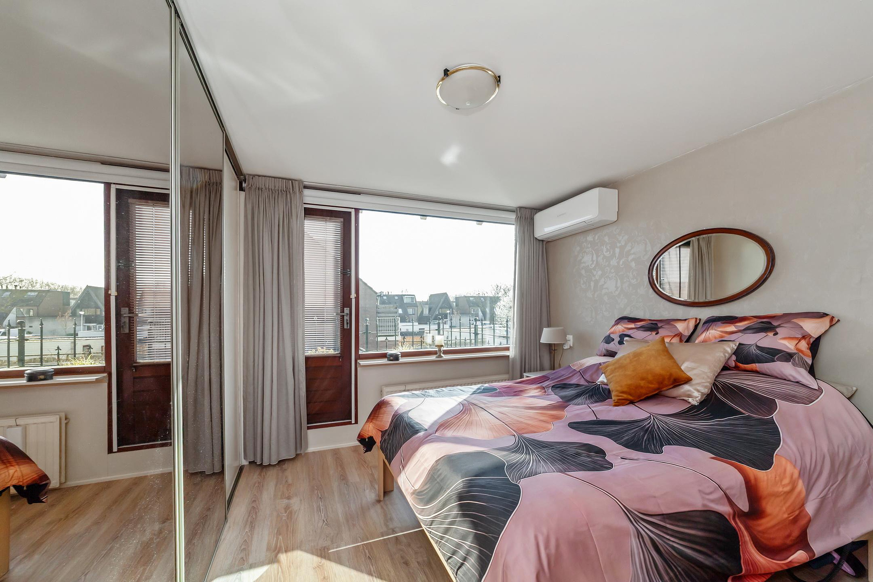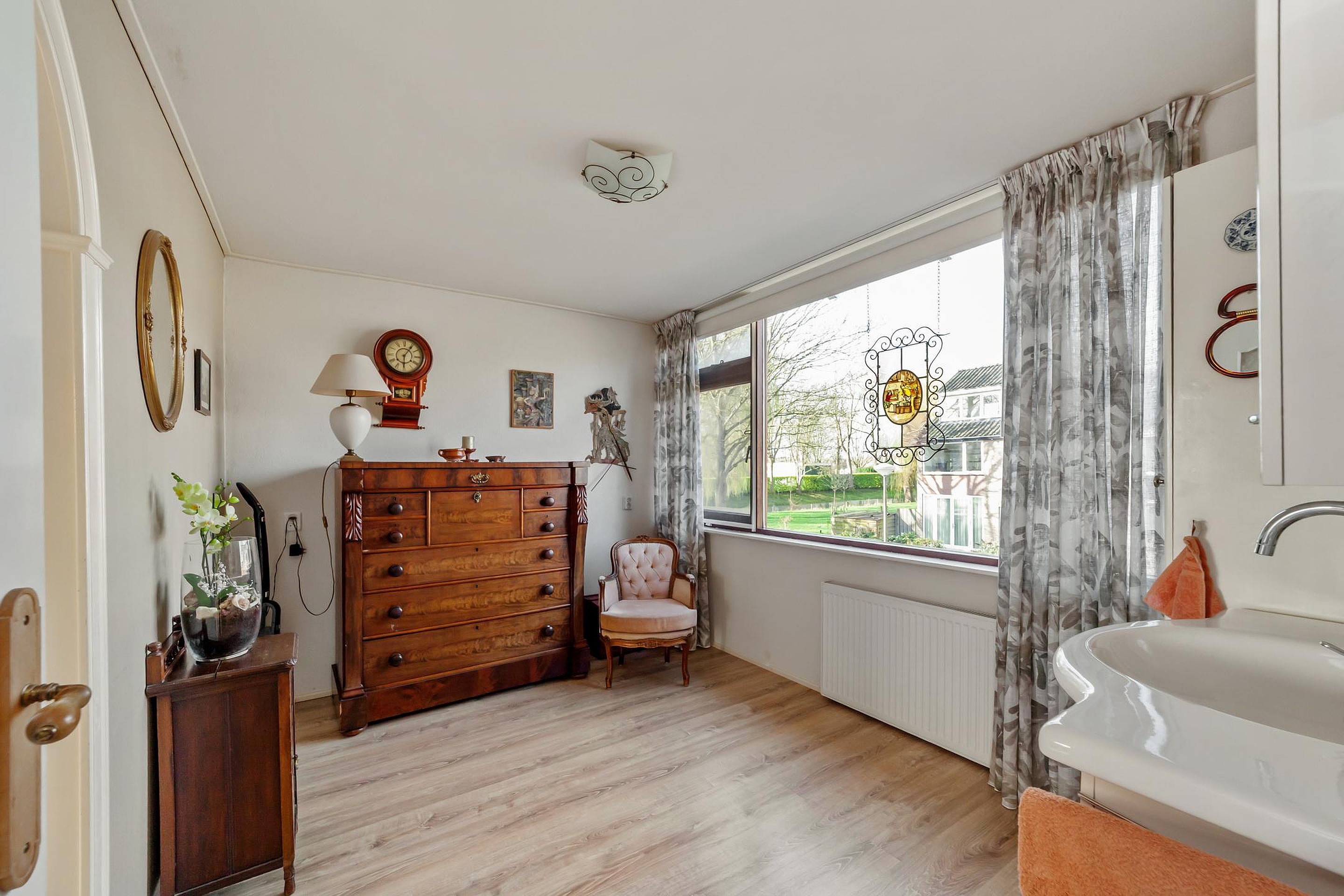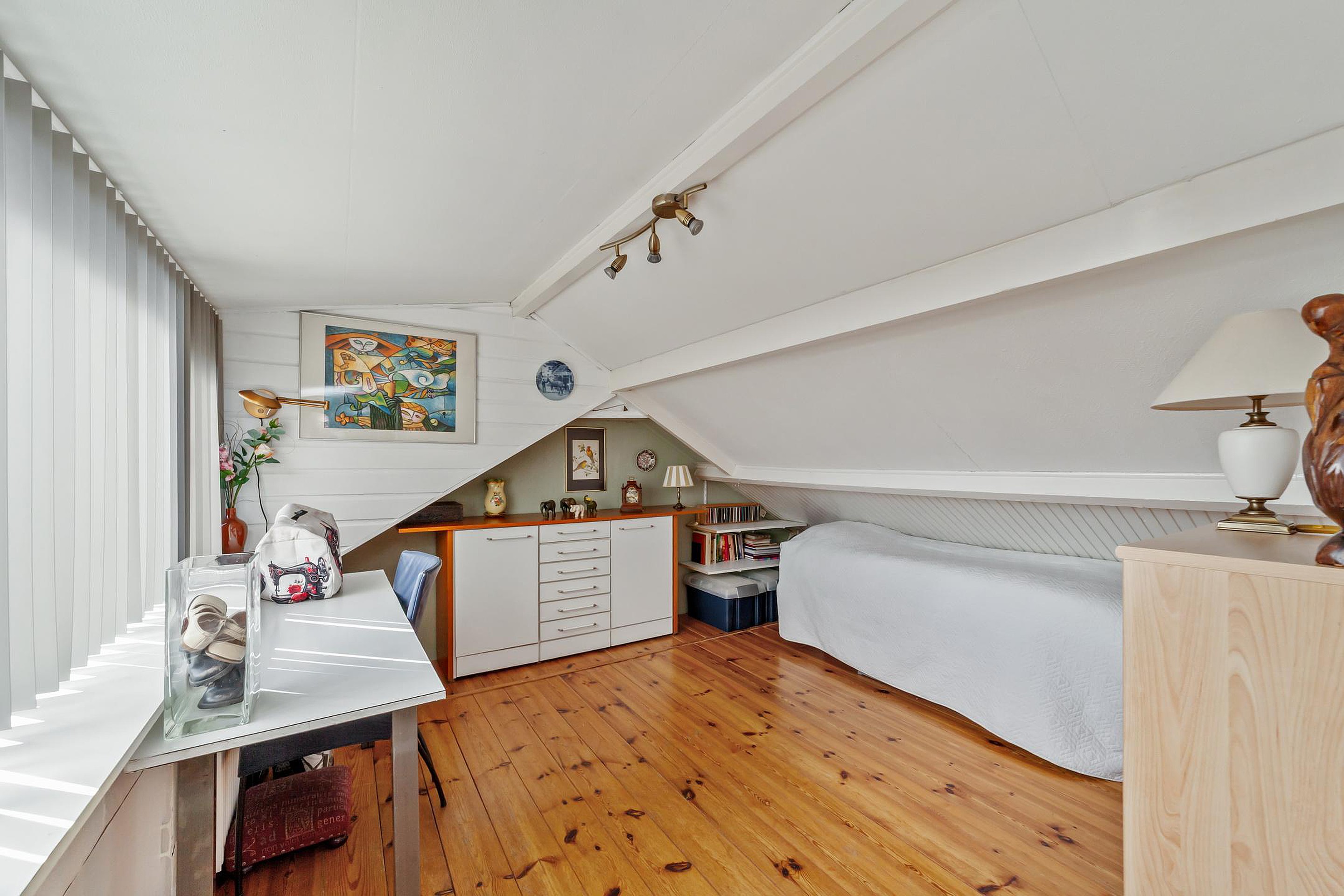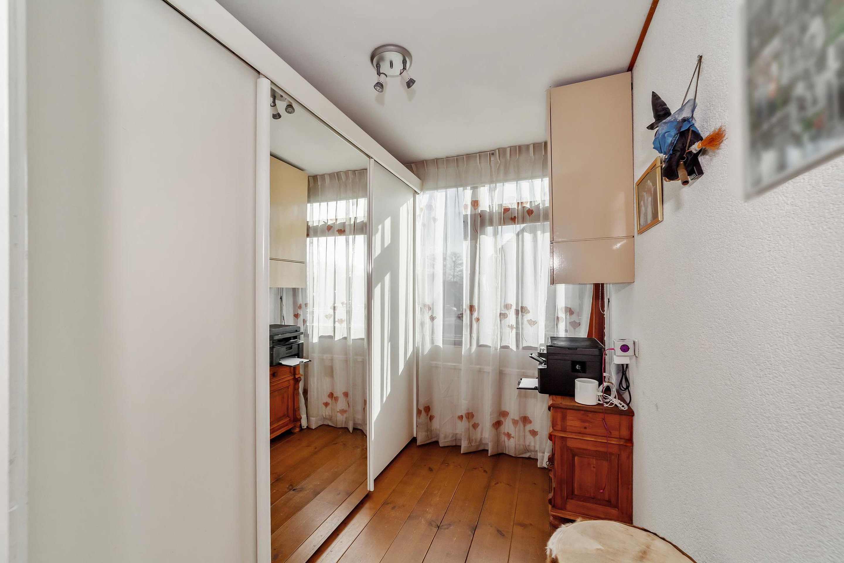 Aan de achterzijde bevindt zich een kleinere slaapkamer met houten vloer.