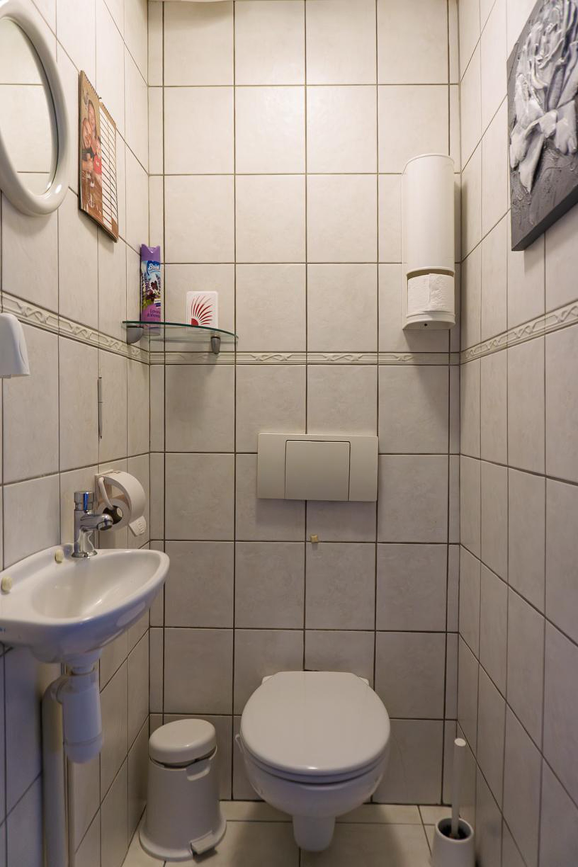 In de hal tussen de keuken en de woonkamer zijn de badkamer en het separate toilet gesitueerd. De badkamer beschikt over een ligbad met douche en een wastafel ingebouwd in een wastafelmeubel. De wanden en de vloer van de badkamer zijn betegeld en het plafond is afgewerkt met kunststof schroten. In het plafond zijn spots verwerkt. Het separate toilet beschikt over een hangcloset met fontein. De wanden en de vloer van het toilet zijn betegeld en het plafond is afgewerkt met kunststof schroten.