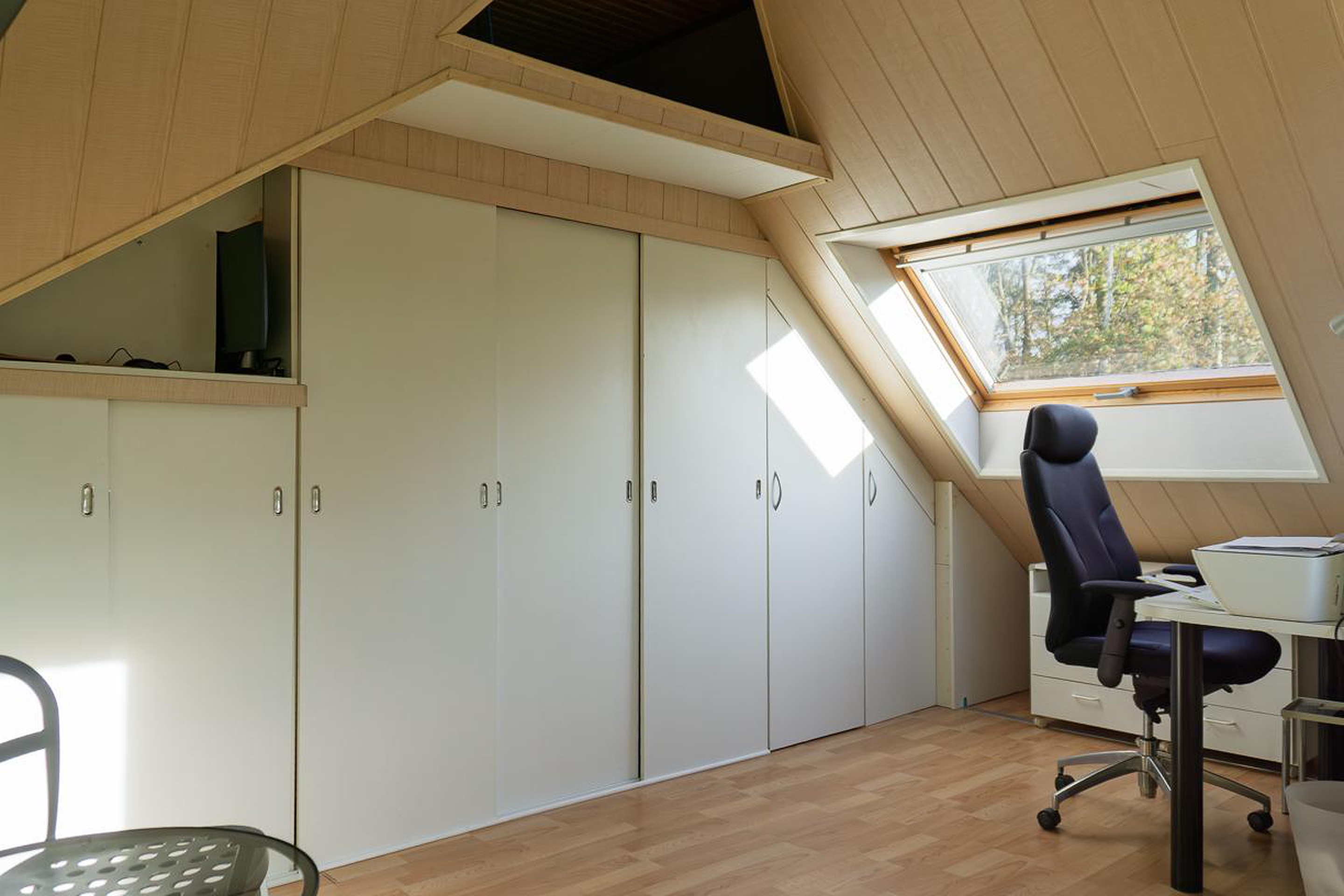 Deze slaapkamer ligt op het einde van de overloop en heeft een groot dakvenster voor de lichtinval. Deze slaapkamer beschikt over een op maat gemaakte vaste kast. De afwerking bestaat uit granol op de wanden, laminaat op de vloer en agnesplaten aan het plafond.