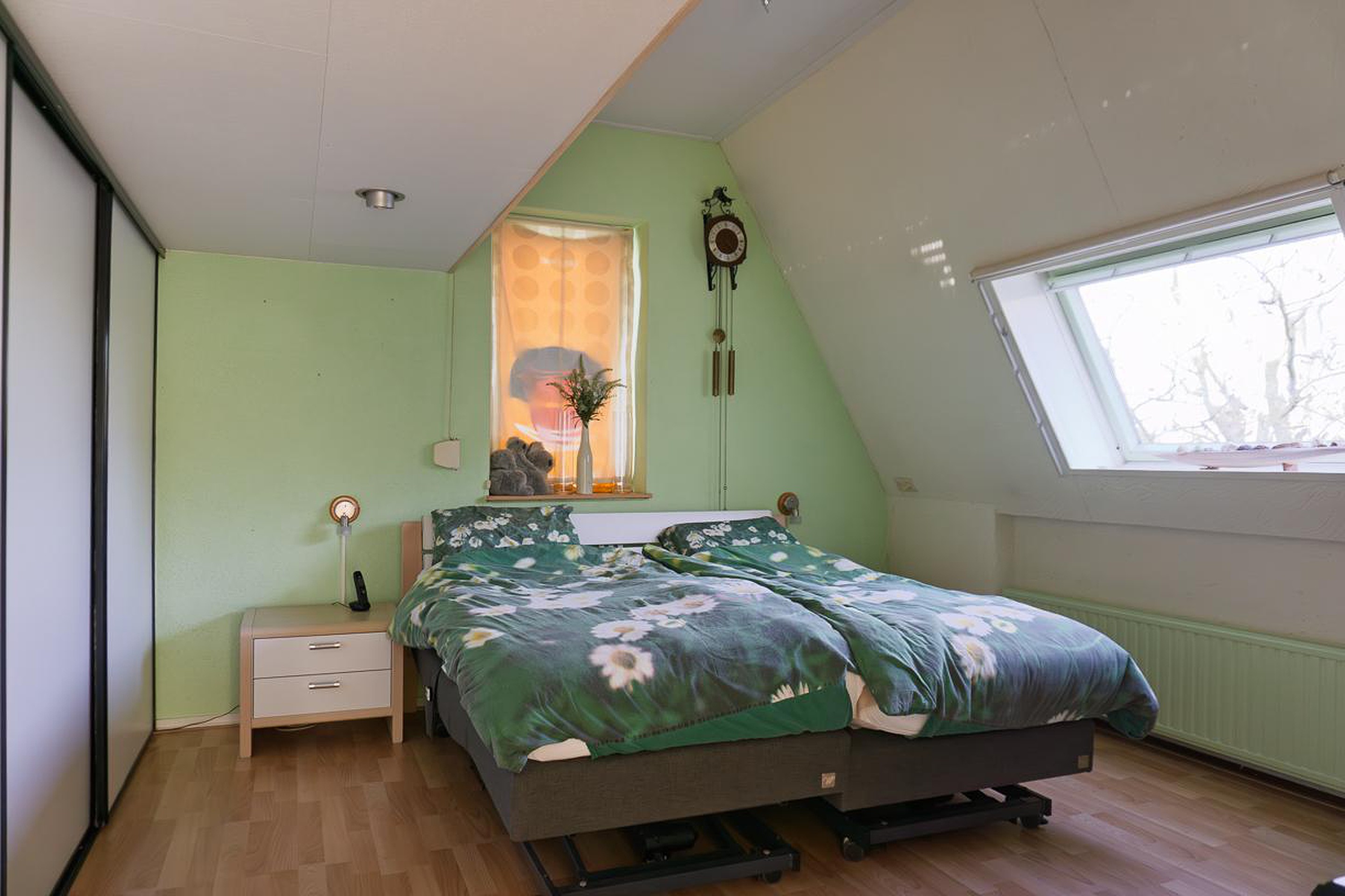De ruime slaapkamer geeft via de grote dakkapel een mooi uitzicht over de wei achter de woning. De slaapkamer is afgewerkt met behang op de wanden, laminaat op de vloer en schroten aan de dakvlakken.