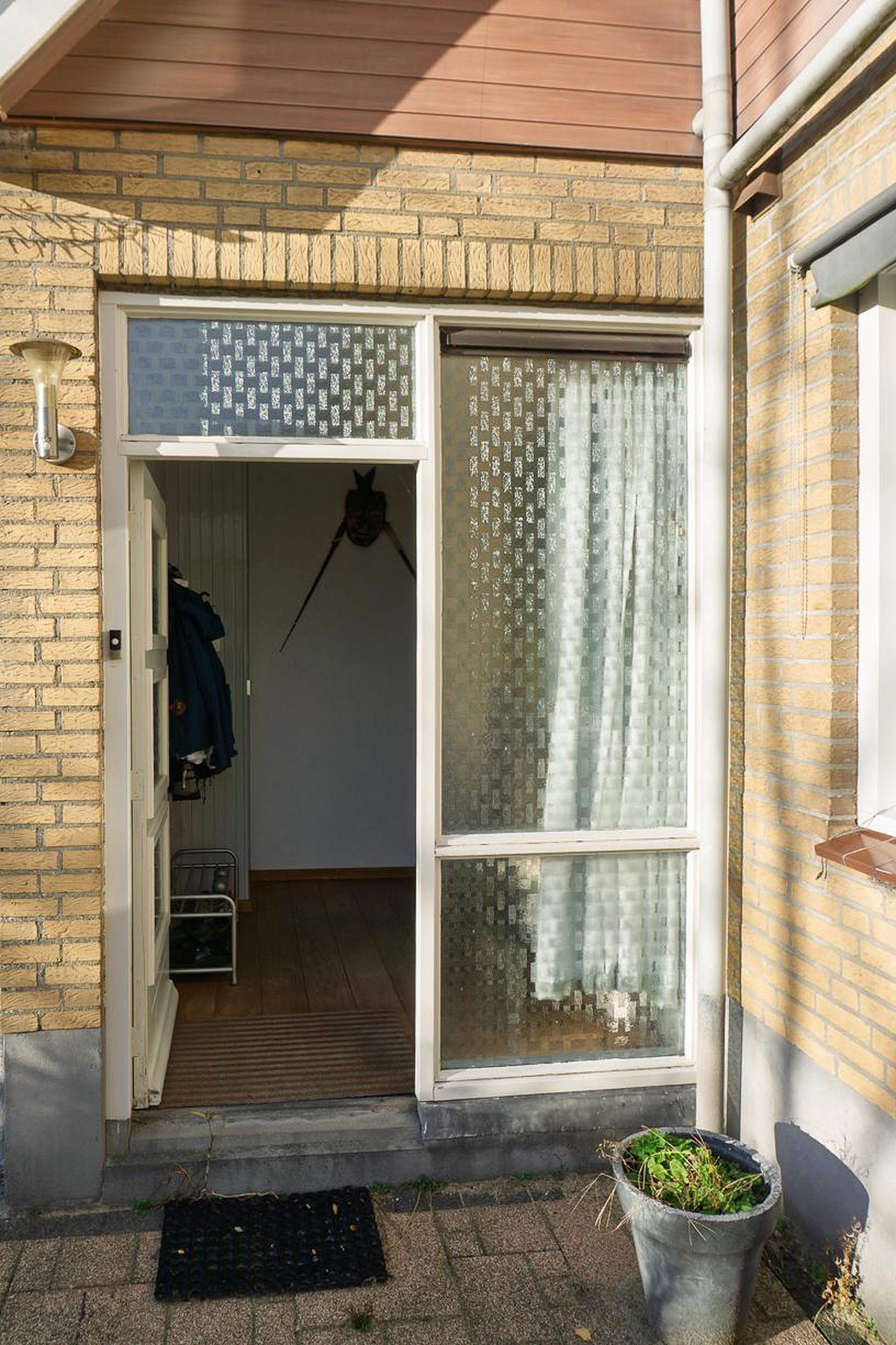De entree van de woning is aan de zijkant gelegen. De hal geeft toegang tot de keuken.