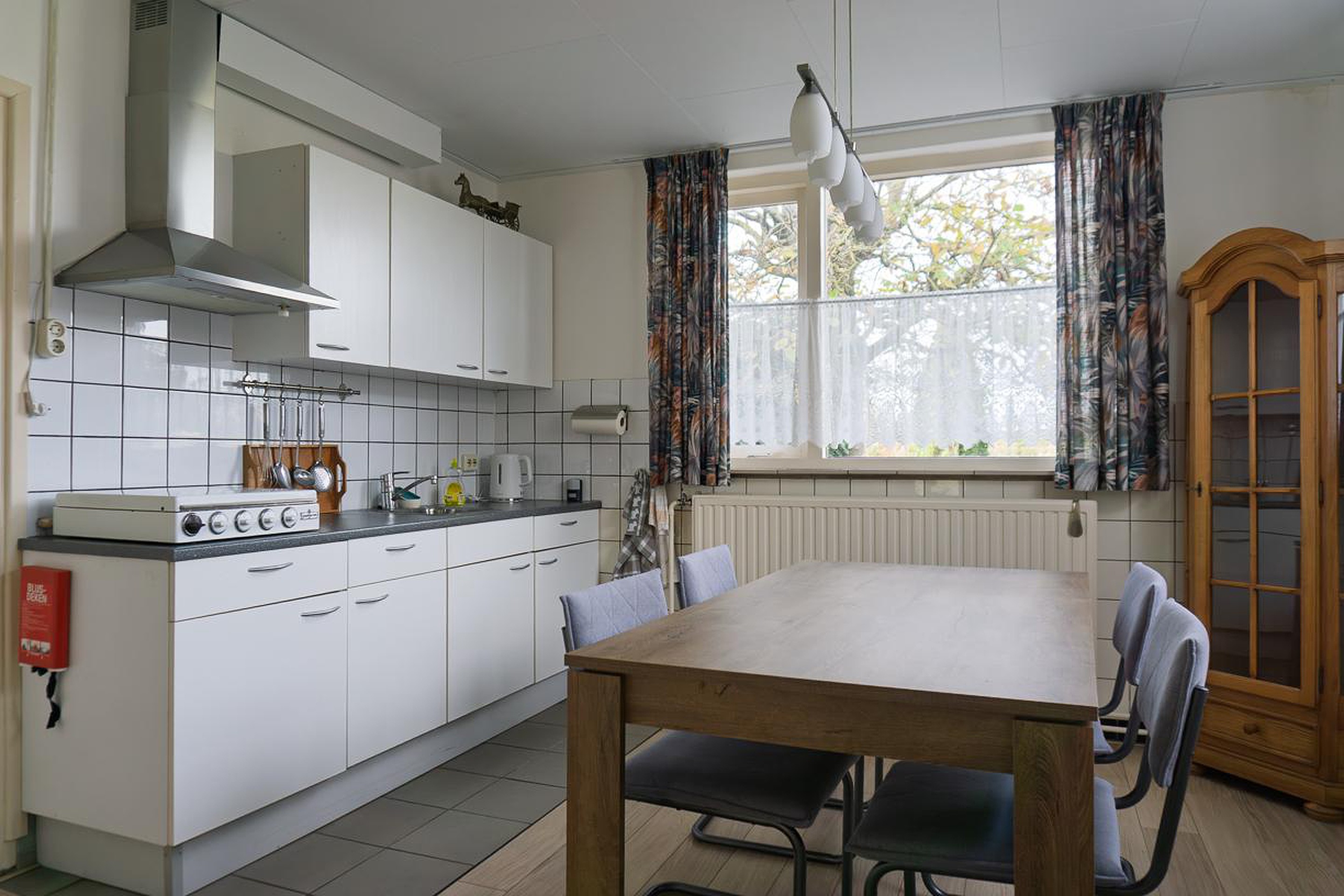 De keuken is royaal en kan als woon-/leefkeuken worden bestempeld. De keukenopstelling is eenvoudig met een gaskookplaat en een afzuigkap. De keuken is afgewerkt met tot halfhoog betegelde wanden met hierboven stucwerk. Het plafond is afgewerkt met agnesplaten en de vloer is deels betegeld en deels afgewerkt met laminaat.