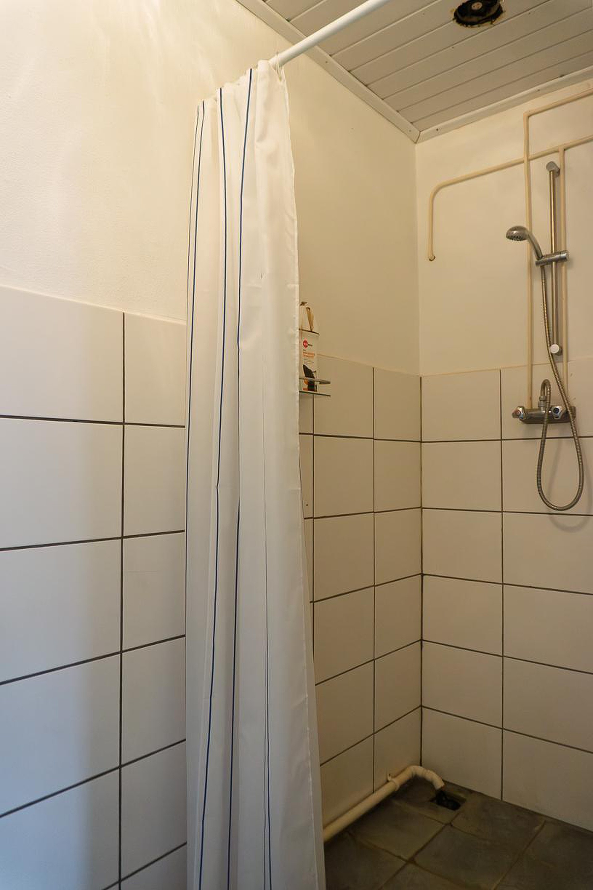Naast de keuken is een hal die leidt naar de achtertuin. Aan deze hal is de badkamer gelegen. Dit betreft een inloopdouche met wastafel. De badkamer is tot 3/4e hoogte betegeld met hierboven stucwerk. Het plafond is afgewerkt met schroten. Naast de badkamer ligt het (separate) toilet. Dit betreft een closetpot met klassieke stortbak.