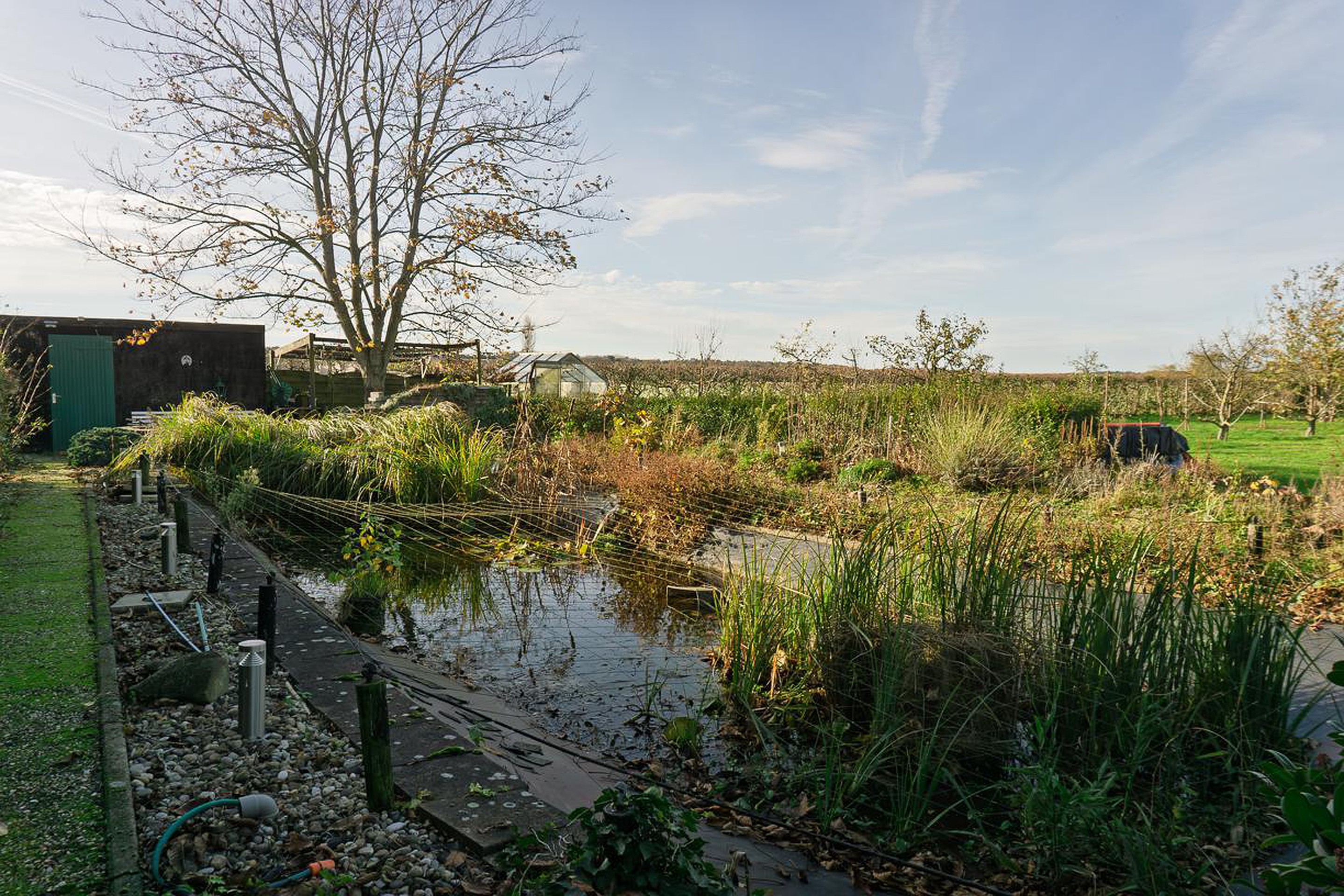 De achtertuin bestaat uit bestrating, plantenborders en een vijverpartij. Hierachter ligt de grote wei. In een deel van de wei staan fruitbomen. Het overige deel is weidegras. De wei wordt voornamelijk omheind door een haag en is onder andere geschikt om er bijvoorbeeld paarden en/of kleinvee te houden. Maar de wei leent zich ook om bijvoorbeeld een eigen moestuin of een zwembad aan te leggen. De wei kan naar eigen wens en inzicht worden aangelegd/gebruikt rekening houdend met het vigerende bestemmingsplan. Er is een beregeningsinstallatie aanwezig met bronpomp. In de hele wei zijn de leidingen en aansluitpunten van de beregeningsinstallatie in de grond verwerkt.