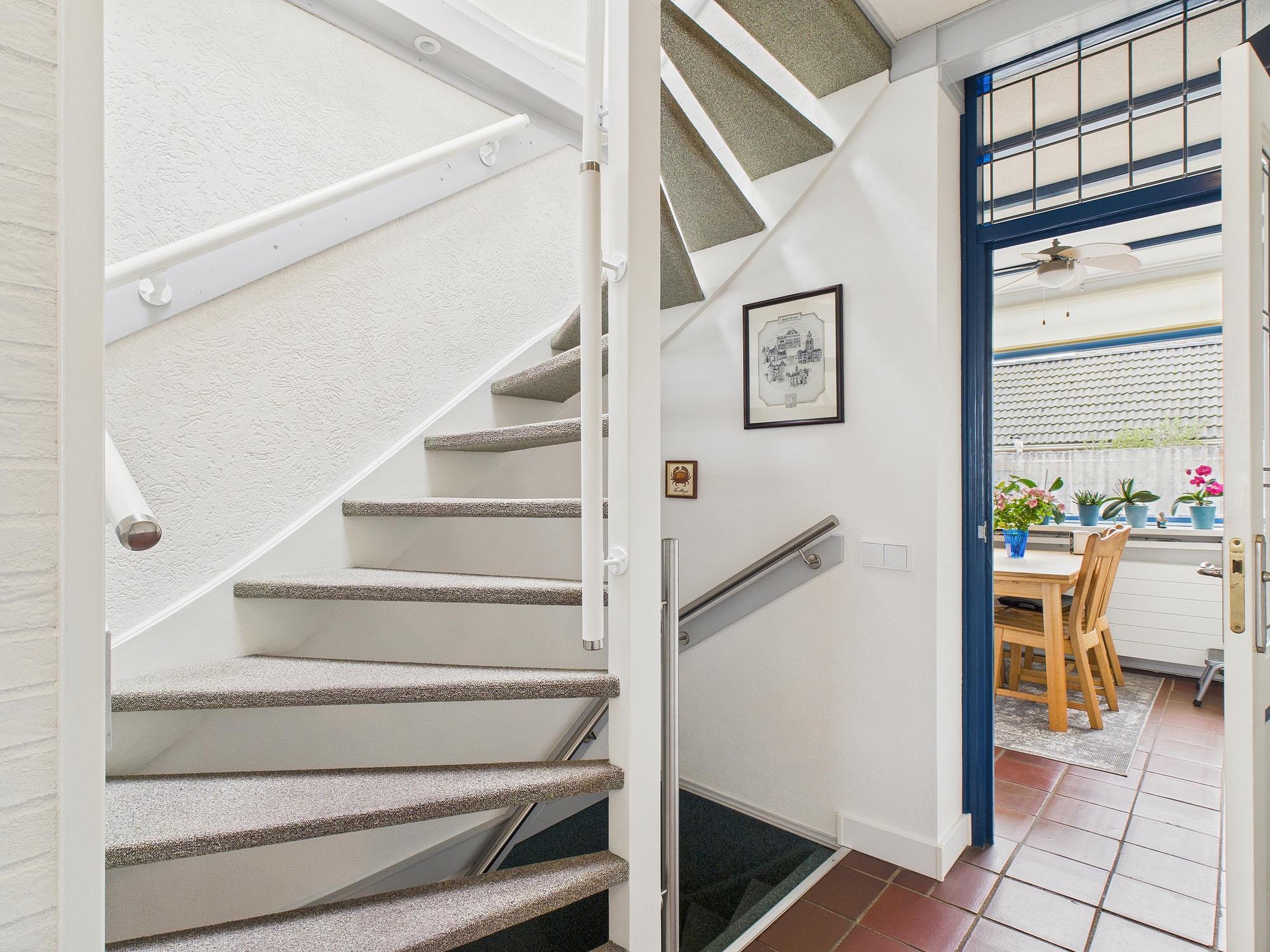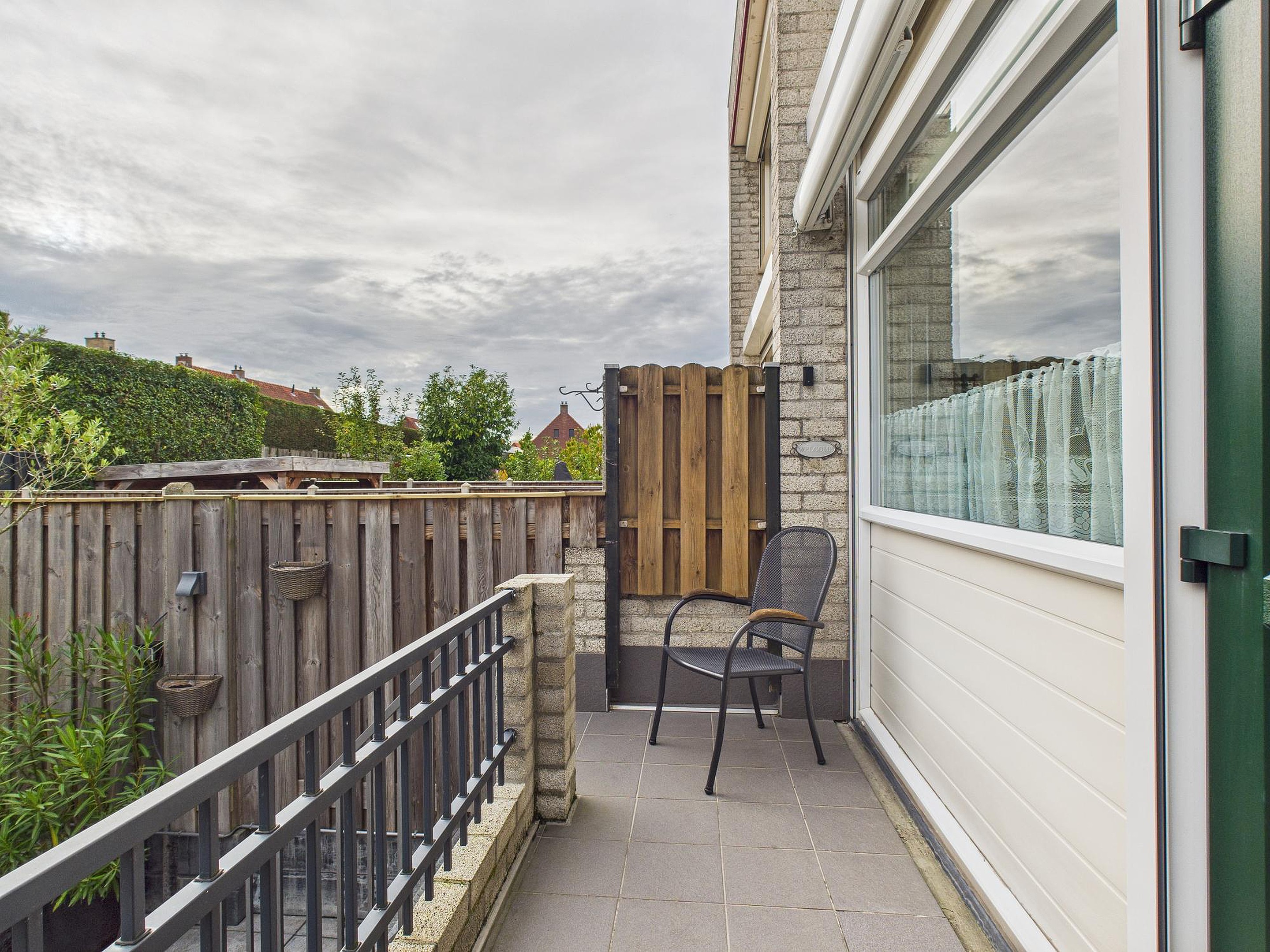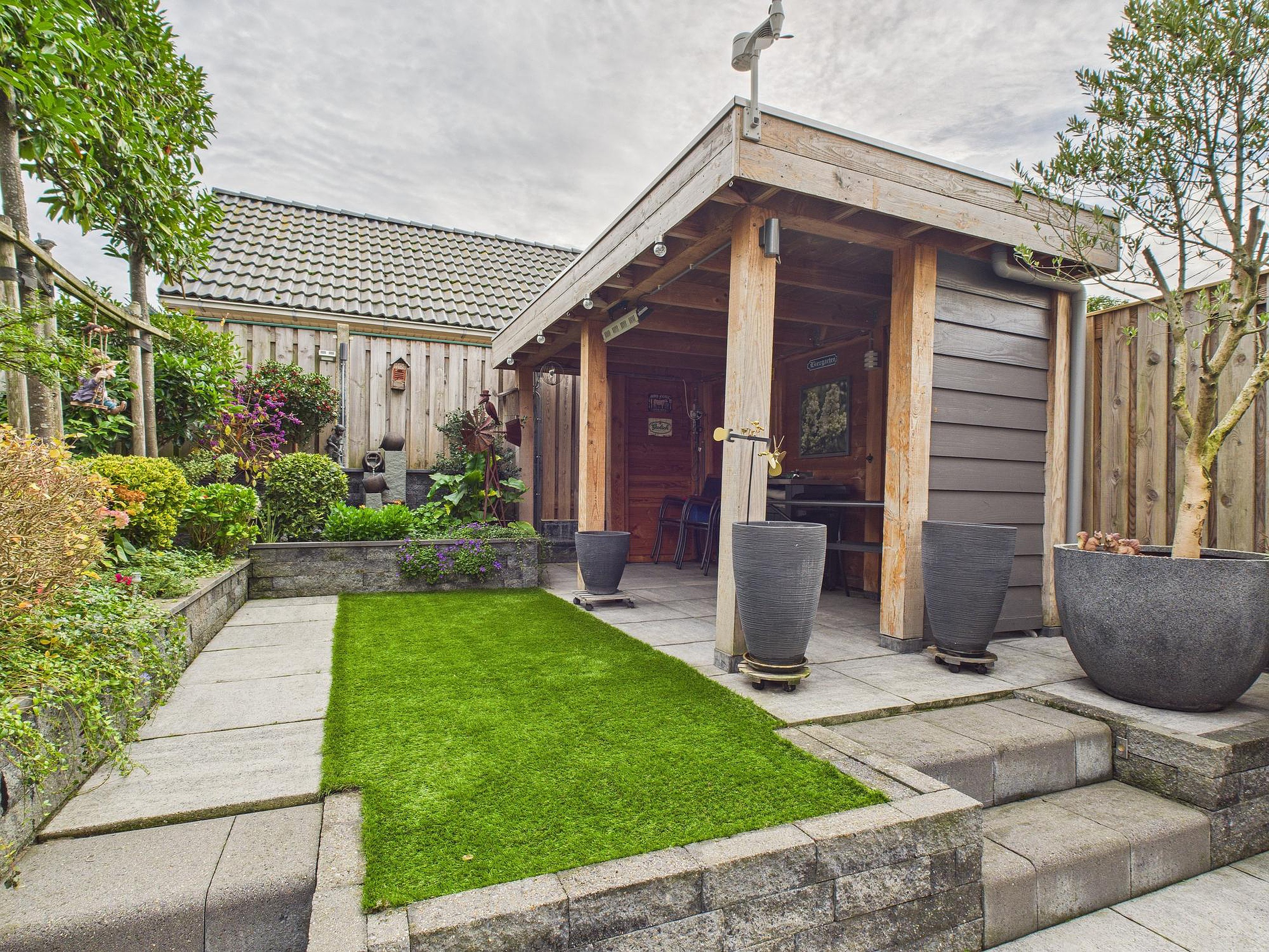De achtertuin is onderhoudsvriendelijk ingericht met strak straatwerk, kunstgras en enkele borders met beplanting. Dankzij de ligging is hier altijd wel een fijn plekje in de zon te vinden. Liever wat hoger zitten? Het balkon biedt een heerlijke uitwijkmogelijkheid. Ook is er een prachtige overkapping om de schaduw op te kunnen zoeken of soms wat meer uit de wind te kunnen zitten. De tuin is ofwel via de achterpoort te bereiken of via een trap vanaf het balkon van de eerste verdieping.