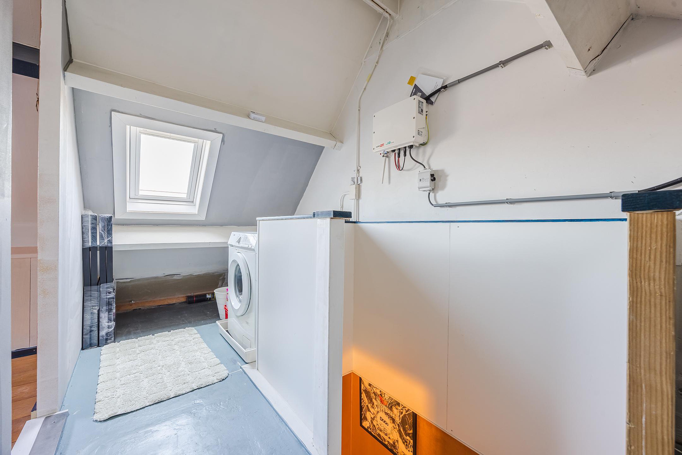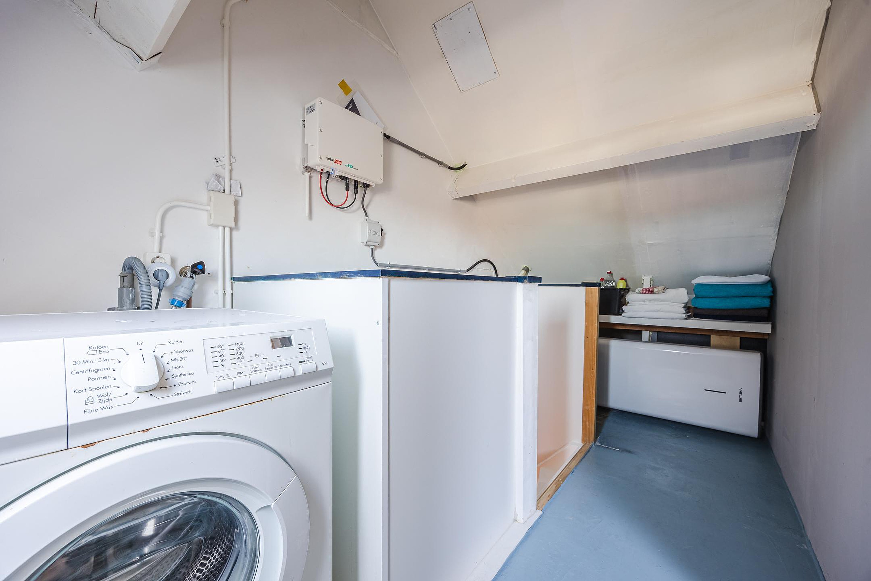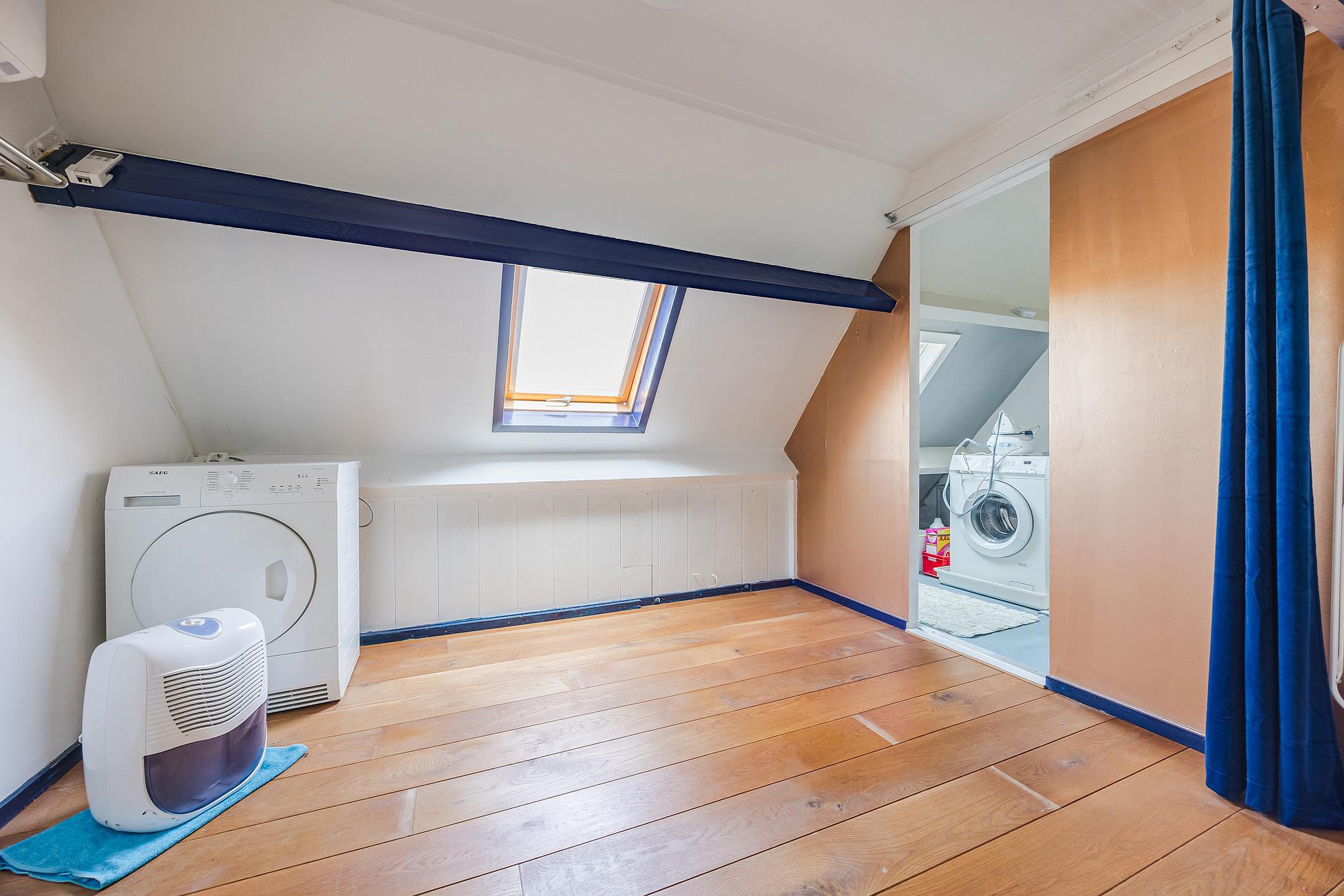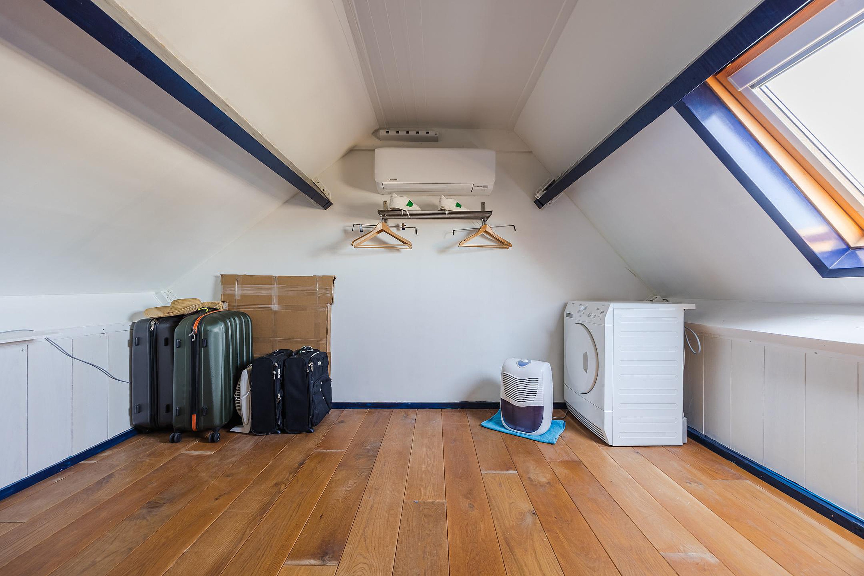 Een vaste trap brengt ons naar de zolder. Hier bevindt zich een vierde kamer met dakraam en airco. Op de overloop staan de slimme boiler, de omvormer van de zonnepanelen en de aansluitingen voor wasmachine en droger. De slimme boiler leert zichzelf jullie gemiddelde warmtevraag en stelt zich hier op af. Dit betekend dat er geen onnodige warmte verloren gaat en je niet hoeft te stoken wanneer er geen warmte wordt gebruikt.