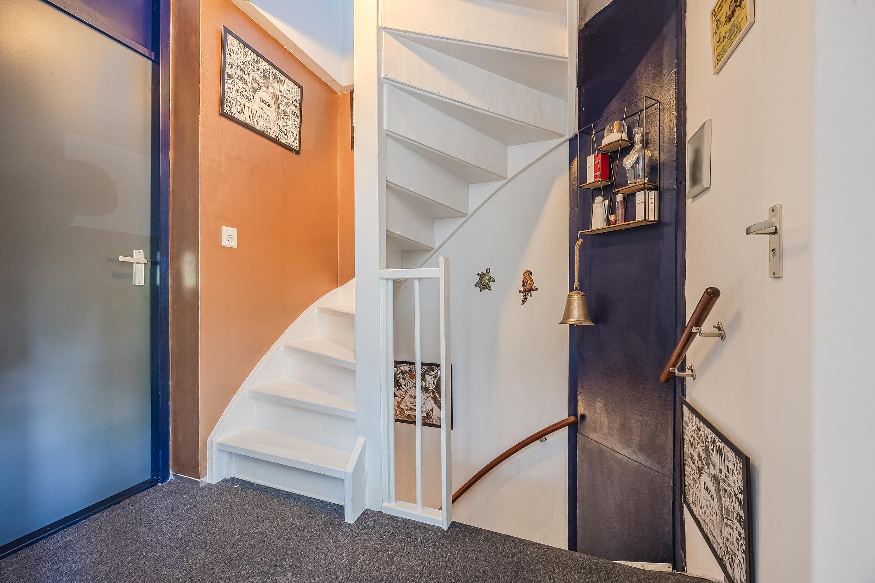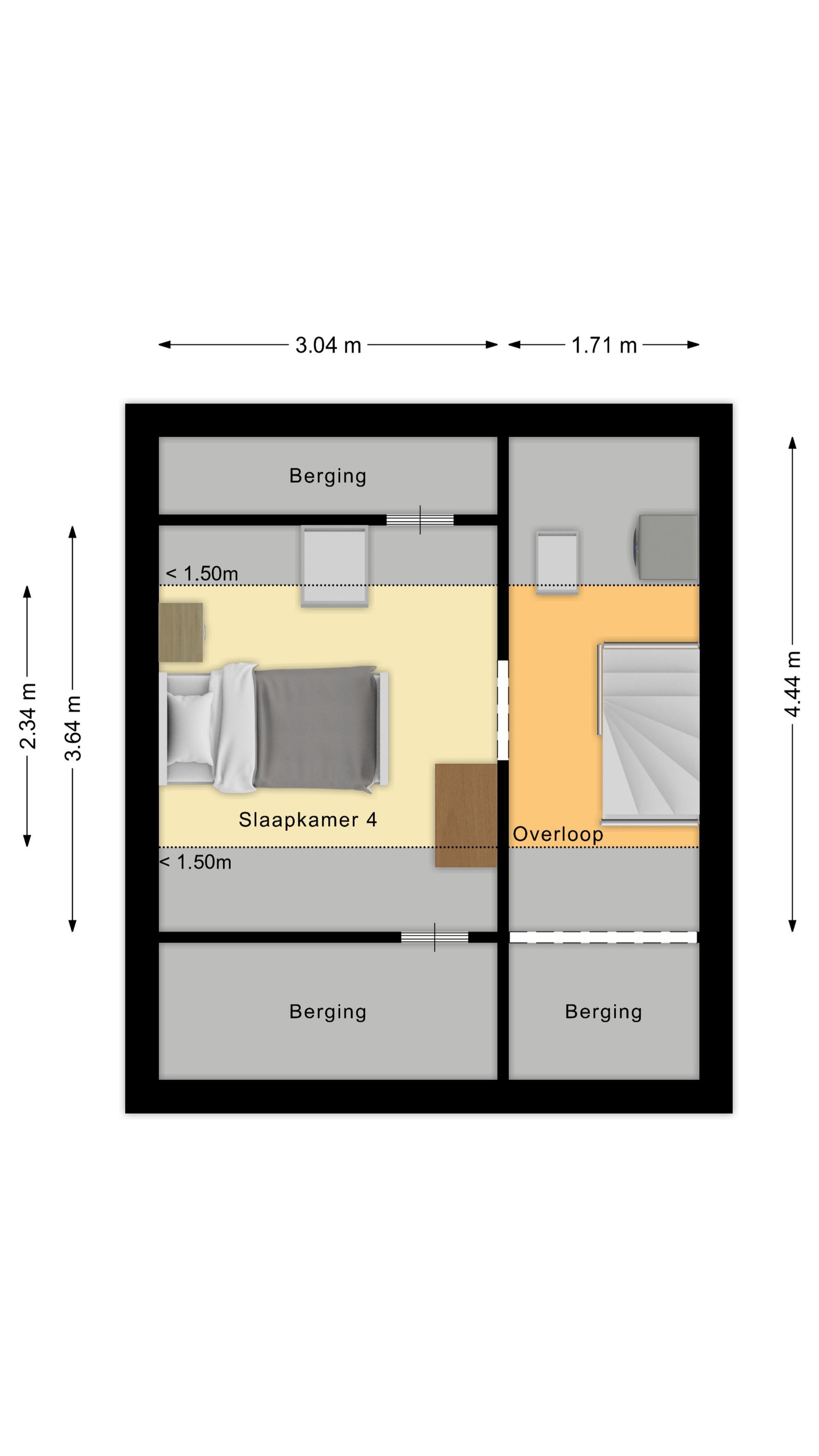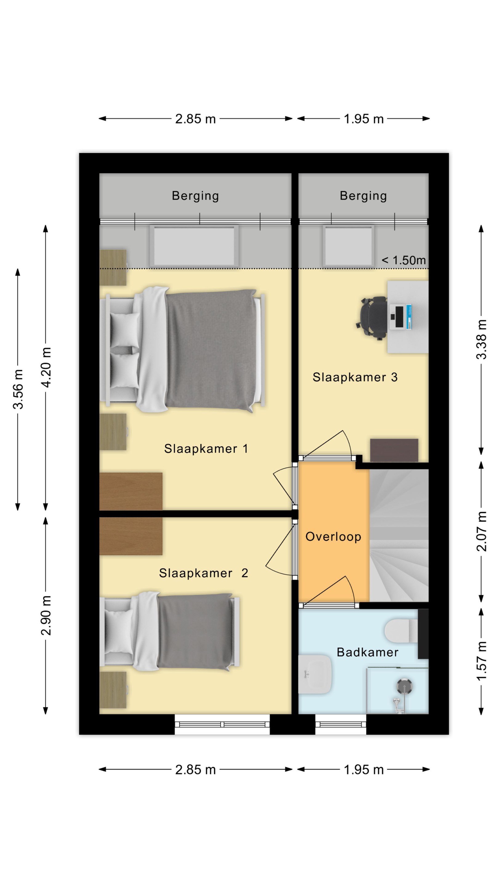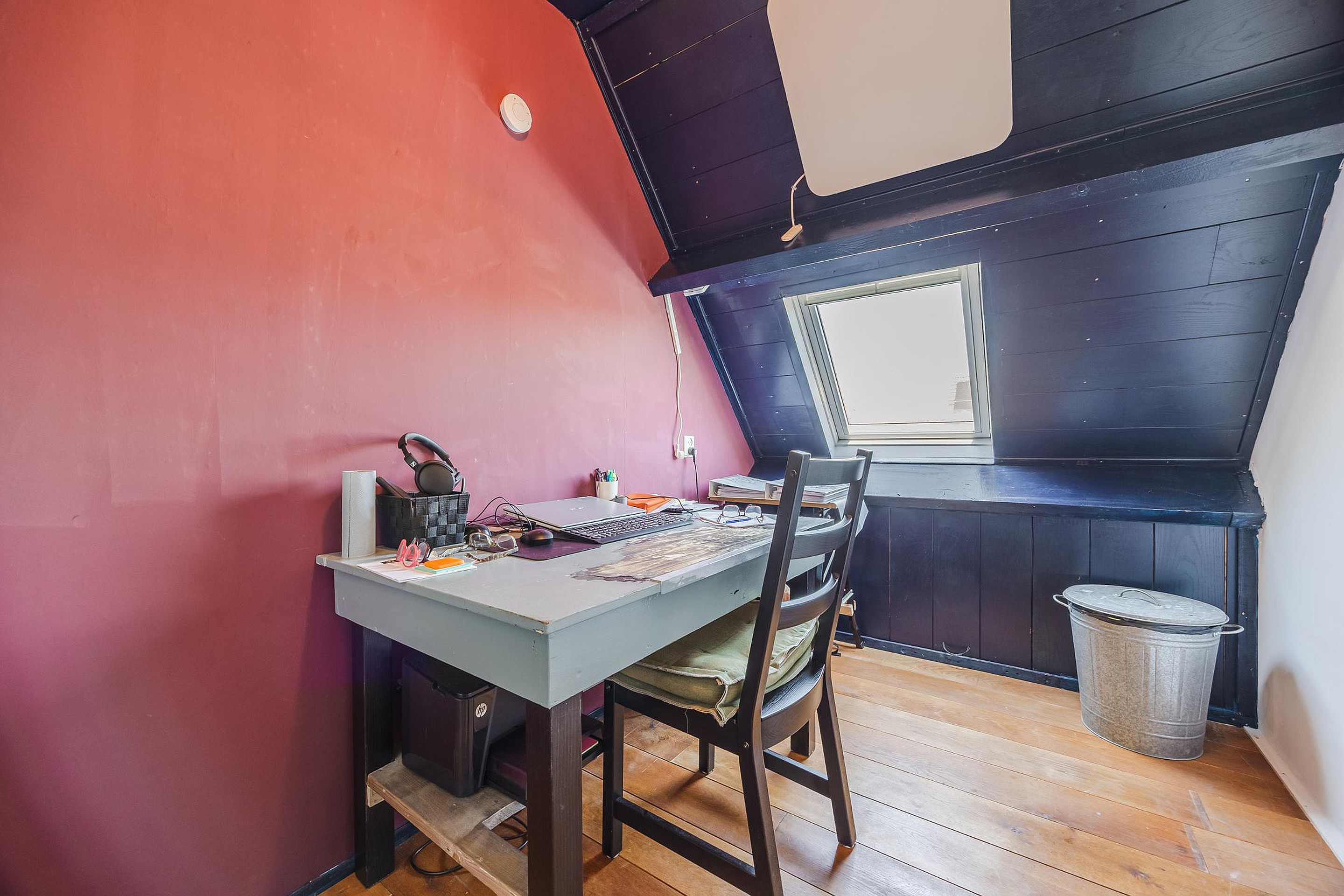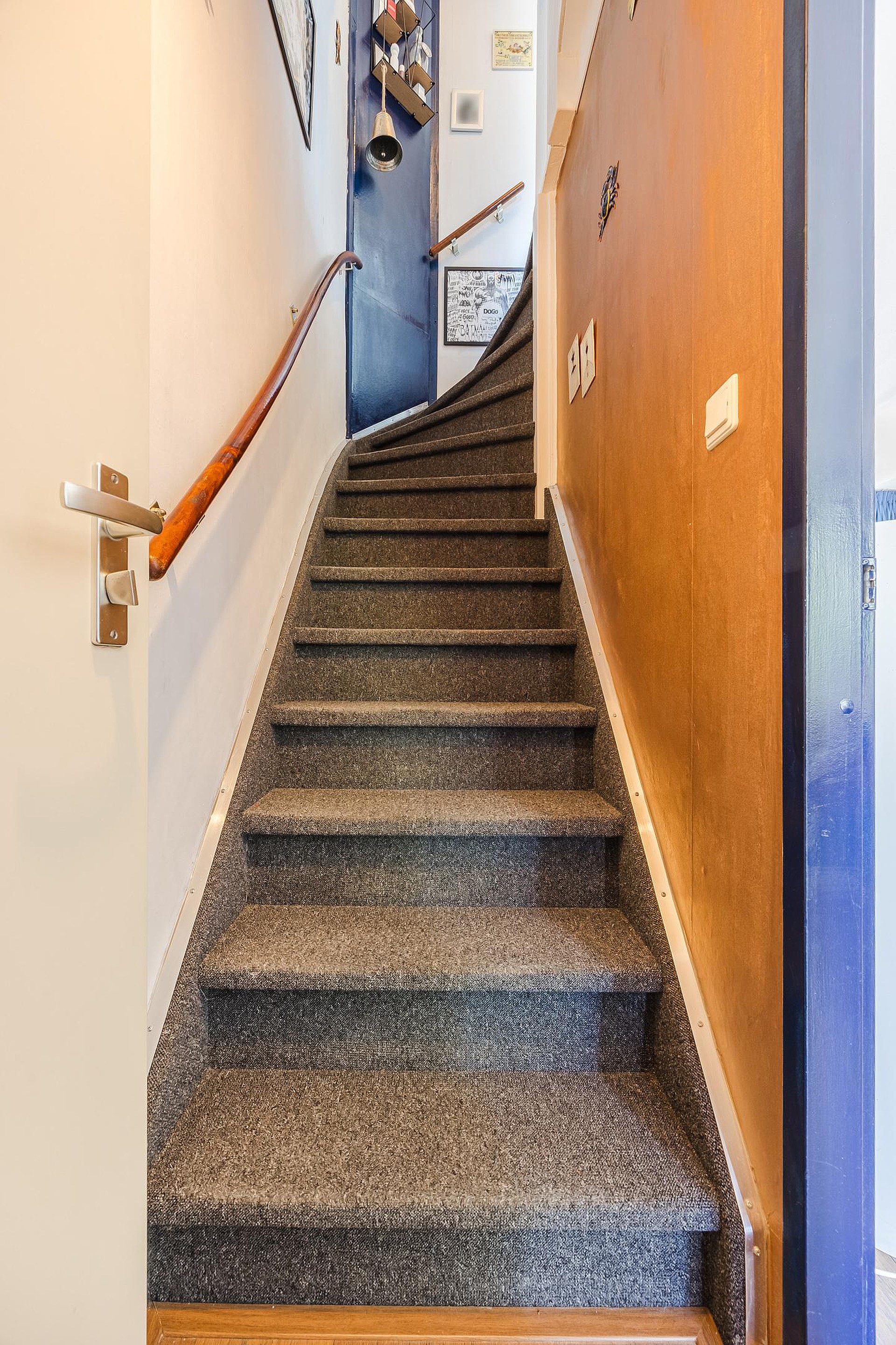 Een vaste trap brengt ons naar de zolder. Hier bevindt zich een vierde kamer met dakraam en airco. Op de overloop staan de slimme boiler, de omvormer van de zonnepanelen en de aansluitingen voor wasmachine en droger. De slimme boiler leert zichzelf jullie gemiddelde warmtevraag en stelt zich hier op af. Dit betekend dat er geen onnodige warmte verloren gaat en je niet hoeft te stoken wanneer er geen warmte wordt gebruikt.