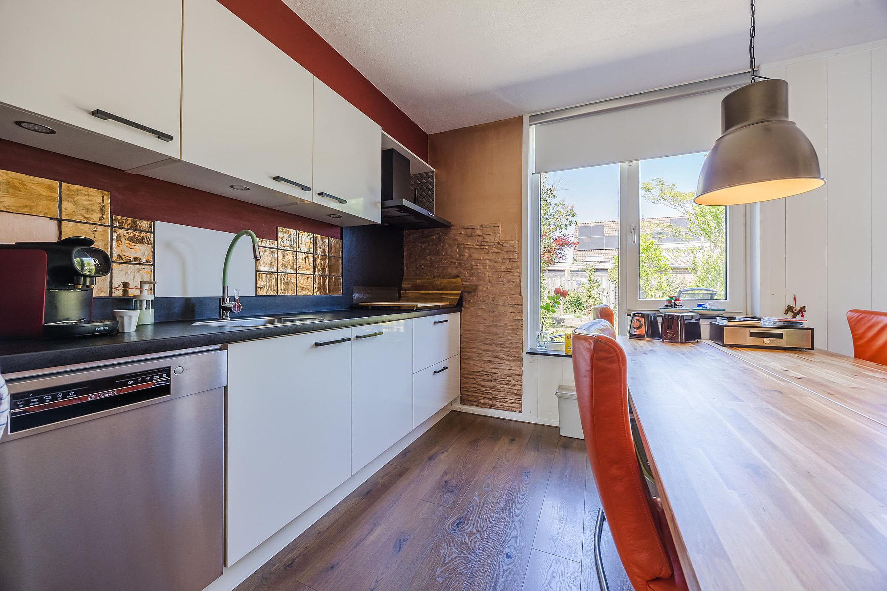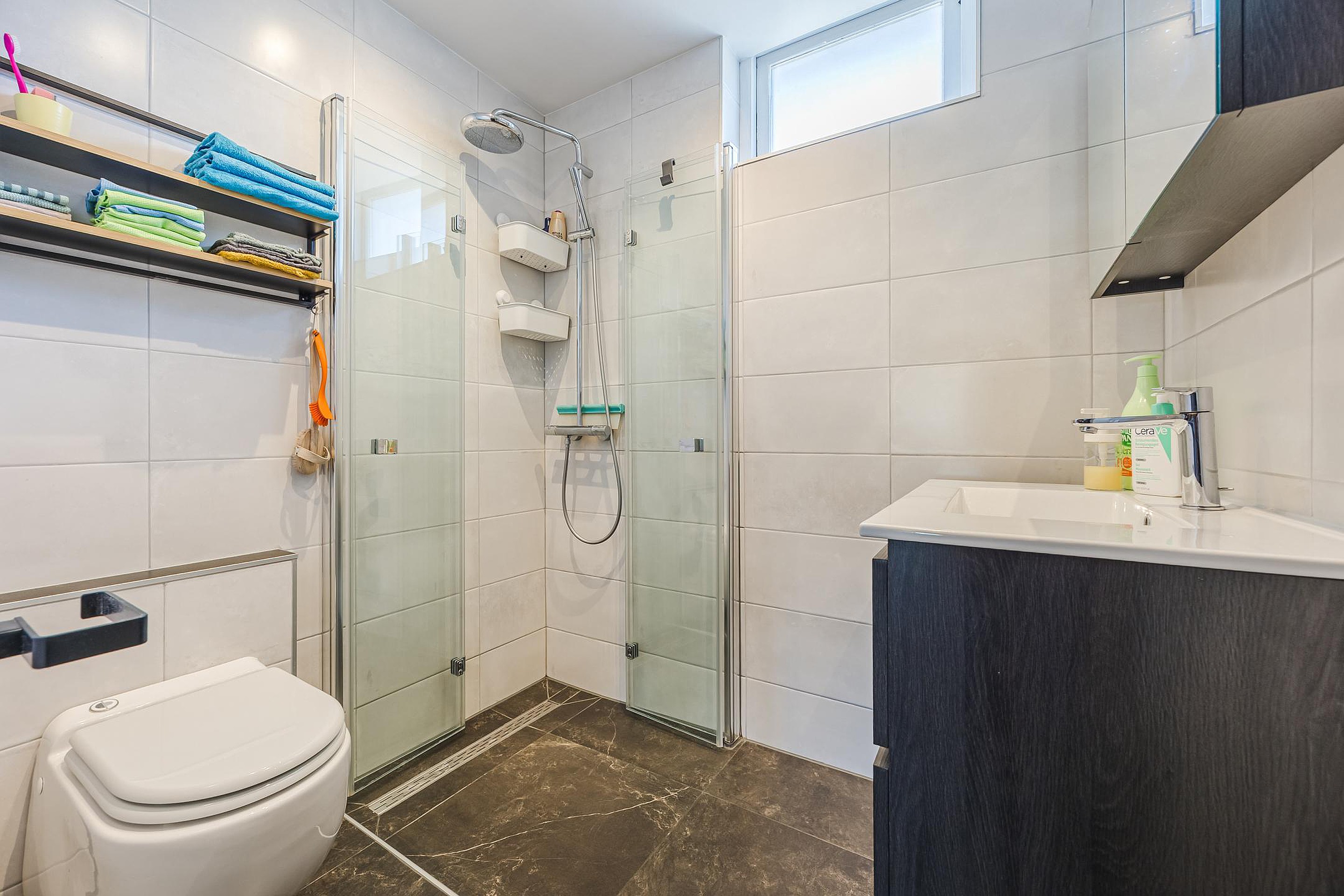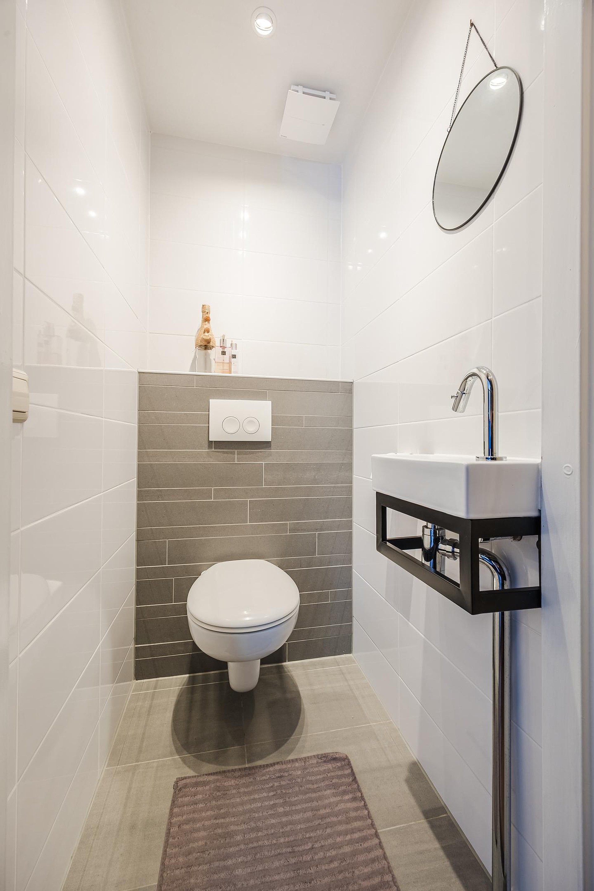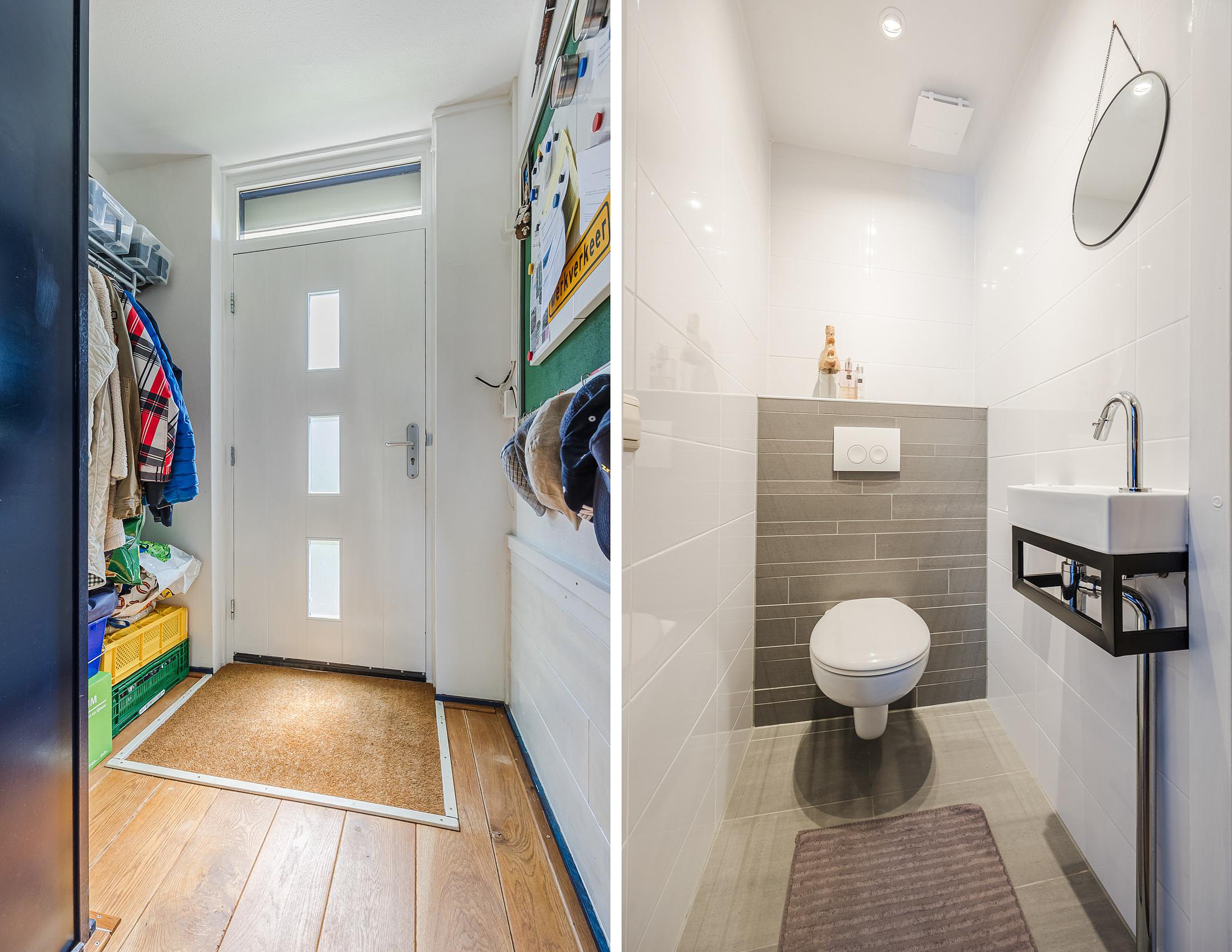 We lopen door naar de woonkamer, deze is licht en praktisch ingedeeld, voorzien van trapkast en airco voor zowel koelen als verwarmen. Achterin de woning vinden we de open keuken met inductie-kookplaat, oven, koel-vriescombinatie en vaatwasser, een goed ingerichte keuken dus. Aan de achterkant vinden we een deur welke toegang biedt tot de achtertuin, maar óók een deur welke toegang biedt tot een kleine hal met trapopgang én het toilet. Het toilet is modern afgewerkt, aan het sanitair hoef je niets meer te doen!